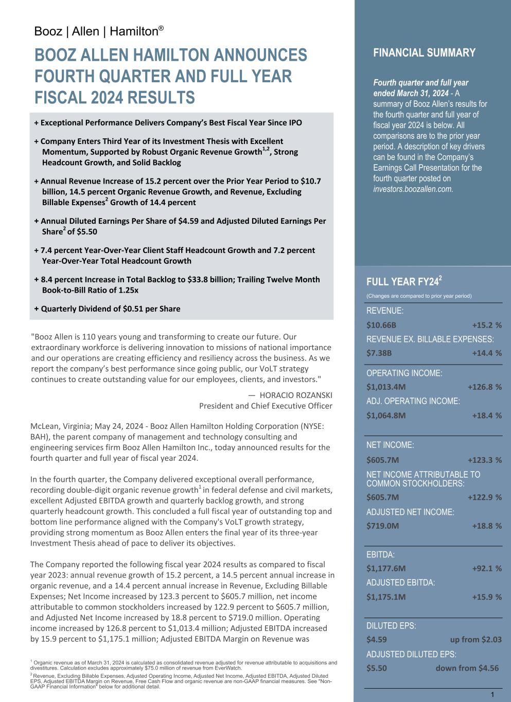 Booz | Allen | Hamilton® BOOZ ALLEN HAMILTON ANNOUNCES FOURTH QUARTER AND FULL YEAR FISCAL 2024 RESULTS + Exceptional Performance Delivers Company’s Best Fiscal Year Since IPO + Company Enters Third Year of its Investment Thesis with Excellent Momentum, Supported by Robust Organic Revenue Growth1,2, Strong Headcount Growth, and Solid Backlog + Annual Revenue Increase of 15.2 percent over the Prior Year Period to $10.7 billion, 14.5 percent Organic Revenue Growth, and Revenue, Excluding Billable Expenses2 Growth of 14.4 percent + Annual Diluted Earnings Per Share of $4.59 and Adjusted Diluted Earnings Per Share2 of $5.50 + 7.4 percent Year-Over-Year Client Staff Headcount Growth and 7.2 percent Year-Over-Year Total Headcount Growth + 8.4 percent Increase in Total Backlog to $33.8 billion; Trailing Twelve Month Book-to-Bill Ratio of 1.25x + Quarterly Dividend of $0.51 per Share "Booz Allen is 110 years young and transforming to create our future. Our extraordinary workforce is delivering innovation to missions of national importance and our operations are creating efficiency and resiliency across the business. As we report the company’s best performance since going public, our VoLT strategy continues to create outstanding value for our employees, clients, and investors." — HORACIO ROZANSKI President and Chief Executive Officer McLean, Virginia; May 24, 2024 - Booz Allen Hamilton Holding Corporation (NYSE: BAH), the parent company of management and technology consulting and engineering services firm Booz Allen Hamilton Inc., today announced results for the fourth quarter and full year of fiscal year 2024. In the fourth quarter, the Company delivered exceptional overall performance, recording double-digit organic revenue growth1 in federal defense and civil markets, excellent Adjusted EBITDA growth and quarterly backlog growth, and strong quarterly headcount growth. This concluded a full fiscal year of outstanding top and bottom line performance aligned with the Company's VoLT growth strategy, providing strong momentum as Booz Allen enters the final year of its three-year Investment Thesis ahead of pace to deliver its objectives. The Company reported the following fiscal year 2024 results as compared to fiscal year 2023: annual revenue growth of 15.2 percent, a 14.5 percent annual increase in organic revenue, and a 14.4 percent annual increase in Revenue, Excluding Billable Expenses; Net Income increased by 123.3 percent to $605.7 million, net income attributable to common stockholders increased by 122.9 percent to $605.7 million, and Adjusted Net Income increased by 18.8 percent to $719.0 million. Operating income increased by 126.8 percent to $1,013.4 million; Adjusted EBITDA increased by 15.9 percent to $1,175.1 million; Adjusted EBITDA Margin on Revenue was 1 Organic revenue as of March 31, 2024 is calculated as consolidated revenue adjusted for revenue attributable to acquisitions and divestitures. Calculation excludes approximately $75.0 million of revenue from EverWatch. 2 Revenue, Excluding Billable Expenses, Adjusted Operating Income, Adjusted Net Income, Adjusted EBITDA, Adjusted Diluted EPS, Adjusted EBITDA Margin on Revenue, Free Cash Flow and organic revenue are non-GAAP financial measures. See "Non- GAAP Financial Information" below for additional detail. 1 FULL YEAR FY242 (Changes are compared to prior year period) REVENUE: $10.66B +15.2 % REVENUE EX. BILLABLE EXPENSES: $7.38B +14.4 % OPERATING INCOME: $1,013.4M +126.8 % ADJ. OPERATING INCOME: $1,064.8M +18.4 % NET INCOME: $605.7M +123.3 % NET INCOME ATTRIBUTABLE TO COMMON STOCKHOLDERS: $605.7M +122.9 % ADJUSTED NET INCOME: $719.0M +18.8 % EBITDA: $1,177.6M +92.1 % ADJUSTED EBITDA: $1,175.1M +15.9 % DILUTED EPS: $4.59 up from $2.03 ADJUSTED DILUTED EPS: $5.50 down from $4.56 FINANCIAL SUMMARY Fourth quarter and full year ended March 31, 2024 - A summary of Booz Allen’s results for the fourth quarter and full year of fiscal year 2024 is below. All comparisons are to the prior year period. A description of key drivers can be found in the Company’s Earnings Call Presentation for the fourth quarter posted on investors.boozallen.com.