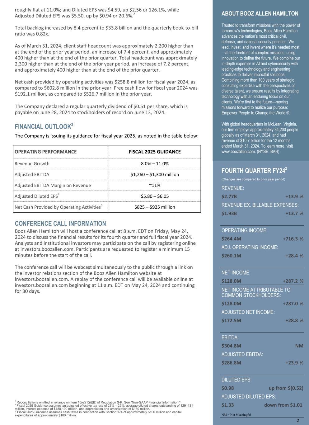 FINANCIAL OUTLOOK3 The Company is issuing its guidance for fiscal year 2025, as noted in the table below: CONFERENCE CALL INFORMATION Booz Allen Hamilton will host a conference call at 8 a.m. EDT on Friday, May 24, 2024 to discuss the financial results for its fourth quarter and full fiscal year 2024. Analysts and institutional investors may participate on the call by registering online at investors.boozallen.com. Participants are requested to register a minimum 15 minutes before the start of the call. The conference call will be webcast simultaneously to the public through a link on the investor relations section of the Booz Allen Hamilton website at investors.boozallen.com. A replay of the conference call will be available online at investors.boozallen.com beginning at 11 a.m. EDT on May 24, 2024 and continuing for 30 days. 3 Reconciliations omitted in reliance on Item 10(e)(1)(i)(B) of Regulation S-K. See "Non-GAAP Financial Information." 4 Fiscal 2025 Guidance assumes an adjusted effective tax rate of 23% – 25%; average diluted shares outstanding of 129–131 million, interest expense of $180-190 million, and depreciation and amortization of $160 million. 5 Fiscal 2025 Guidance assumes cash taxes in connection with Section 174 of approximately $100 million and capital expenditures of approximately $100 million. 2 roughly flat at 11.0%; and Diluted EPS was $4.59, up $2.56 or 126.1%, while Adjusted Diluted EPS was $5.50, up by $0.94 or 20.6%.2 Total backlog increased by 8.4 percent to $33.8 billion and the quarterly book-to-bill ratio was 0.82x. As of March 31, 2024, client staff headcount was approximately 2,200 higher than at the end of the prior year period, an increase of 7.4 percent, and approximately 400 higher than at the end of the prior quarter. Total headcount was approximately 2,300 higher than at the end of the prior year period, an increase of 7.2 percent, and approximately 400 higher than at the end of the prior quarter. Net cash provided by operating activities was $258.8 million for fiscal year 2024, as compared to $602.8 million in the prior year. Free cash flow for fiscal year 2024 was $192.1 million, as compared to $526.7 million in the prior year. The Company declared a regular quarterly dividend of $0.51 per share, which is payable on June 28, 2024 to stockholders of record on June 13, 2024. ABOUT BOOZ ALLEN HAMILTON Trusted to transform missions with the power of tomorrow’s technologies, Booz Allen Hamilton advances the nation’s most critical civil, defense, and national security priorities. We lead, invest, and invent where it’s needed most —at the forefront of complex missions, using innovation to define the future. We combine our in-depth expertise in AI and cybersecurity with leading-edge technology and engineering practices to deliver impactful solutions. Combining more than 100 years of strategic consulting expertise with the perspectives of diverse talent, we ensure results by integrating technology with an enduring focus on our clients. We’re first to the future—moving missions forward to realize our purpose: Empower People to Change the World ®. With global headquarters in McLean, Virginia, our firm employs approximately 34,200 people globally as of March 31, 2024, and had revenue of $10.7 billion for the 12 months ended March 31, 2024. To learn more, visit www.boozallen.com. (NYSE: BAH)OPERATING PERFORMANCE FISCAL 2025 GUIDANCE Revenue Growth 8.0% – 11.0% Adjusted EBITDA $1,260 – $1,300 million Adjusted EBITDA Margin on Revenue ~11% Adjusted Diluted EPS4 $5.80 – $6.05 Net Cash Provided by Operating Activities5 $825 – $925 million FOURTH QUARTER FY242 (Changes are compared to prior year period) REVENUE: $2.77B +13.9 % REVENUE EX. BILLABLE EXPENSES: $1.93B +13.7 % OPERATING INCOME: $264.4M +716.3 % ADJ. OPERATING INCOME: $260.1M +28.4 % NET INCOME: $128.0M +287.2 % NET INCOME ATTRIBUTABLE TO COMMON STOCKHOLDERS: $128.0M +287.0 % ADJUSTED NET INCOME: $172.5M +28.8 % EBITDA: $304.8M NM ADJUSTED EBITDA: $286.8M +23.9 % DILUTED EPS: $0.98 up from $(0.52) ADJUSTED DILUTED EPS: $1.33 down from $1.01 NM = Not Meaningful 2