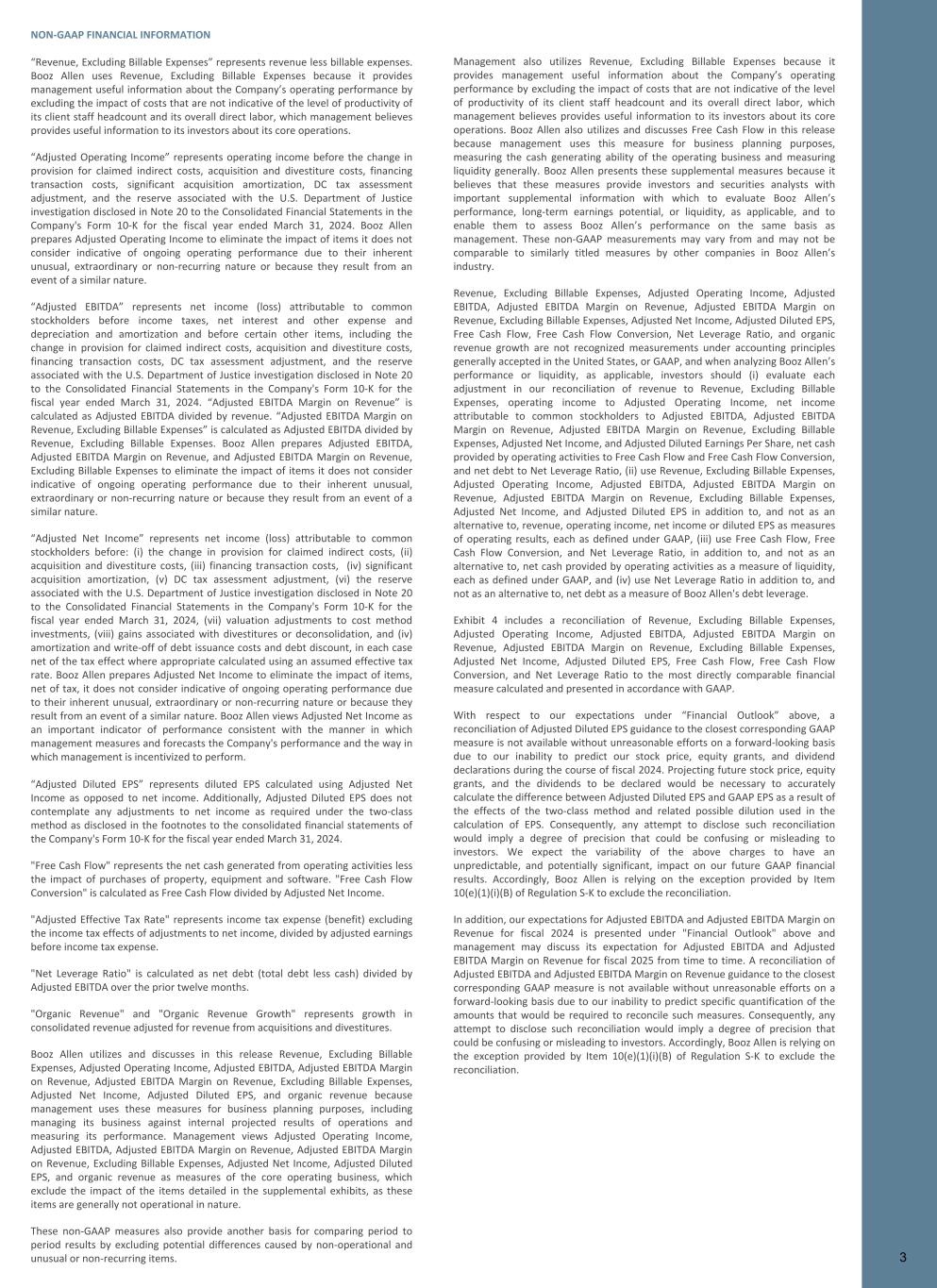 NON-GAAP FINANCIAL INFORMATION “Revenue, Excluding Billable Expenses” represents revenue less billable expenses. Booz Allen uses Revenue, Excluding Billable Expenses because it provides management useful information about the Company’s operating performance by excluding the impact of costs that are not indicative of the level of productivity of its client staff headcount and its overall direct labor, which management believes provides useful information to its investors about its core operations. “Adjusted Operating Income” represents operating income before the change in provision for claimed indirect costs, acquisition and divestiture costs, financing transaction costs, significant acquisition amortization, DC tax assessment adjustment, and the reserve associated with the U.S. Department of Justice investigation disclosed in Note 20 to the Consolidated Financial Statements in the Company's Form 10-K for the fiscal year ended March 31, 2024. Booz Allen prepares Adjusted Operating Income to eliminate the impact of items it does not consider indicative of ongoing operating performance due to their inherent unusual, extraordinary or non-recurring nature or because they result from an event of a similar nature. “Adjusted EBITDA” represents net income (loss) attributable to common stockholders before income taxes, net interest and other expense and depreciation and amortization and before certain other items, including the change in provision for claimed indirect costs, acquisition and divestiture costs, financing transaction costs, DC tax assessment adjustment, and the reserve associated with the U.S. Department of Justice investigation disclosed in Note 20 to the Consolidated Financial Statements in the Company's Form 10-K for the fiscal year ended March 31, 2024. “Adjusted EBITDA Margin on Revenue” is calculated as Adjusted EBITDA divided by revenue. “Adjusted EBITDA Margin on Revenue, Excluding Billable Expenses” is calculated as Adjusted EBITDA divided by Revenue, Excluding Billable Expenses. Booz Allen prepares Adjusted EBITDA, Adjusted EBITDA Margin on Revenue, and Adjusted EBITDA Margin on Revenue, Excluding Billable Expenses to eliminate the impact of items it does not consider indicative of ongoing operating performance due to their inherent unusual, extraordinary or non-recurring nature or because they result from an event of a similar nature. “Adjusted Net Income” represents net income (loss) attributable to common stockholders before: (i) the change in provision for claimed indirect costs, (ii) acquisition and divestiture costs, (iii) financing transaction costs, (iv) significant acquisition amortization, (v) DC tax assessment adjustment, (vi) the reserve associated with the U.S. Department of Justice investigation disclosed in Note 20 to the Consolidated Financial Statements in the Company's Form 10-K for the fiscal year ended March 31, 2024, (vii) valuation adjustments to cost method investments, (viii) gains associated with divestitures or deconsolidation, and (iv) amortization and write-off of debt issuance costs and debt discount, in each case net of the tax effect where appropriate calculated using an assumed effective tax rate. Booz Allen prepares Adjusted Net Income to eliminate the impact of items, net of tax, it does not consider indicative of ongoing operating performance due to their inherent unusual, extraordinary or non-recurring nature or because they result from an event of a similar nature. Booz Allen views Adjusted Net Income as an important indicator of performance consistent with the manner in which management measures and forecasts the Company's performance and the way in which management is incentivized to perform. “Adjusted Diluted EPS” represents diluted EPS calculated using Adjusted Net Income as opposed to net income. Additionally, Adjusted Diluted EPS does not contemplate any adjustments to net income as required under the two-class method as disclosed in the footnotes to the consolidated financial statements of the Company's Form 10-K for the fiscal year ended March 31, 2024. "Free Cash Flow" represents the net cash generated from operating activities less the impact of purchases of property, equipment and software. "Free Cash Flow Conversion" is calculated as Free Cash Flow divided by Adjusted Net Income. "Adjusted Effective Tax Rate" represents income tax expense (benefit) excluding the income tax effects of adjustments to net income, divided by adjusted earnings before income tax expense. "Net Leverage Ratio" is calculated as net debt (total debt less cash) divided by Adjusted EBITDA over the prior twelve months. "Organic Revenue" and "Organic Revenue Growth" represents growth in consolidated revenue adjusted for revenue from acquisitions and divestitures. Booz Allen utilizes and discusses in this release Revenue, Excluding Billable Expenses, Adjusted Operating Income, Adjusted EBITDA, Adjusted EBITDA Margin on Revenue, Adjusted EBITDA Margin on Revenue, Excluding Billable Expenses, Adjusted Net Income, Adjusted Diluted EPS, and organic revenue because management uses these measures for business planning purposes, including managing its business against internal projected results of operations and measuring its performance. Management views Adjusted Operating Income, Adjusted EBITDA, Adjusted EBITDA Margin on Revenue, Adjusted EBITDA Margin on Revenue, Excluding Billable Expenses, Adjusted Net Income, Adjusted Diluted EPS, and organic revenue as measures of the core operating business, which exclude the impact of the items detailed in the supplemental exhibits, as these items are generally not operational in nature. These non-GAAP measures also provide another basis for comparing period to period results by excluding potential differences caused by non-operational and unusual or non-recurring items. Management also utilizes Revenue, Excluding Billable Expenses because it provides management useful information about the