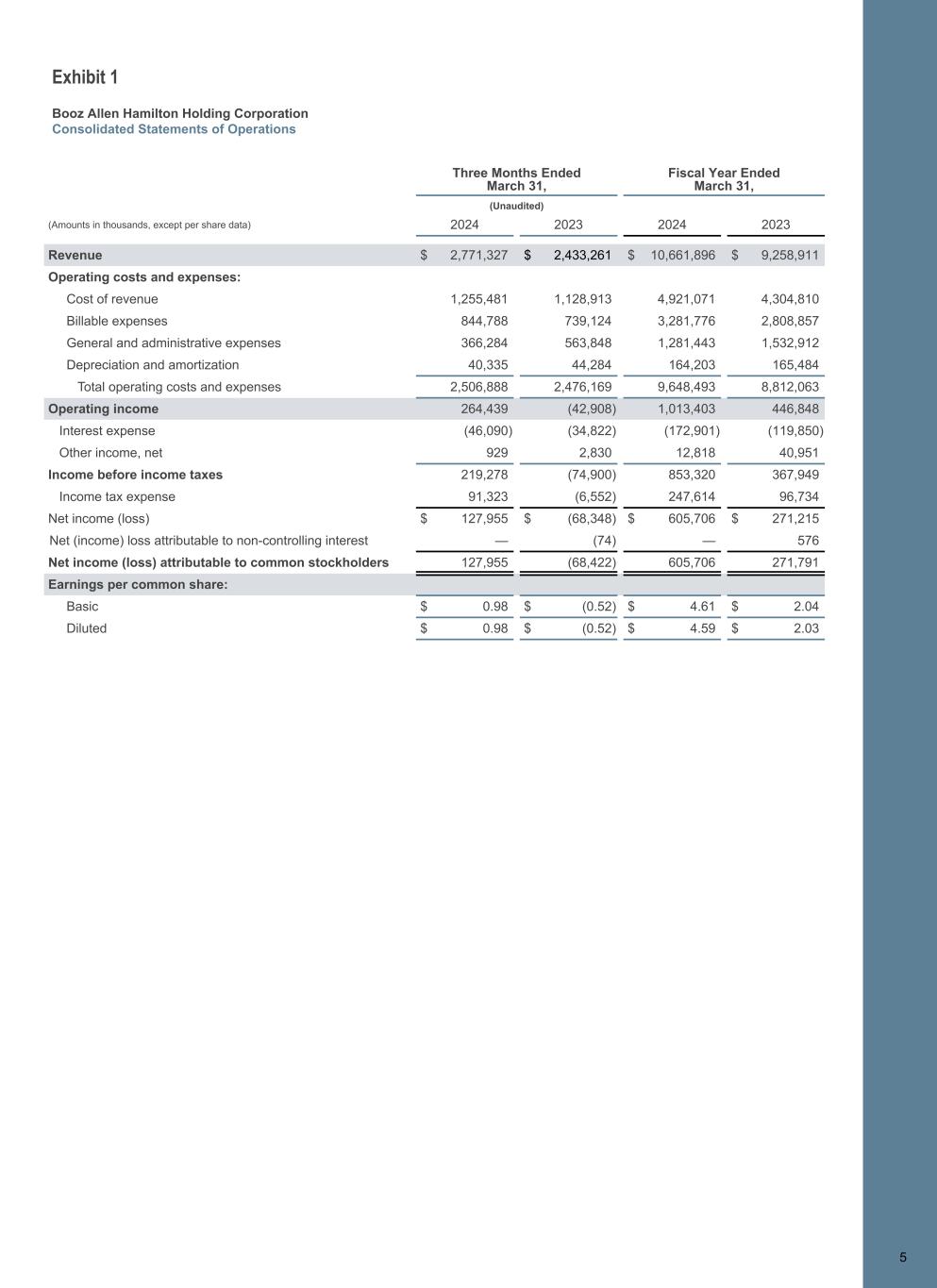 Exhibit 1 Booz Allen Hamilton Holding Corporation Consolidated Statements of Operations 5 Three Months Ended March 31, Fiscal Year Ended March 31, (Unaudited) (Amounts in thousands, except per share data) 2024 2023 2024 2023 Revenue $ 2,771,327 $ 2,433,261 $ 10,661,896 $ 9,258,911 Operating costs and expenses: Cost of revenue 1,255,481 1,128,913 4,921,071 4,304,810 Billable expenses 844,788 739,124 3,281,776 2,808,857 General and administrative expenses 366,284 563,848 1,281,443 1,532,912 Depreciation and amortization 40,335 44,284 164,203 165,484 Total operating costs and expenses 2,506,888 2,476,169 9,648,493 8,812,063 Operating income 264,439 (42,908) 1,013,403 446,848 Interest expense (46,090) (34,822) (172,901) (119,850) Other income, net 929 2,830 12,818 40,951 Income before income taxes 219,278 (74,900) 853,320 367,949 Income tax expense 91,323 (6,552) 247,614 96,734 Net income (loss) $ 127,955 $ (68,348) $ 605,706 $ 271,215 Net (income) loss attributable to non-controlling interest — (74) — 576 Net income (loss) attributable to common stockholders 127,955 (68,422) 605,706 271,791 Earnings per common share: Basic $ 0.98 $ (0.52) $ 4.61 $ 2.04 Diluted $ 0.98 $ (0.52) $ 4.59 $ 2.03 5