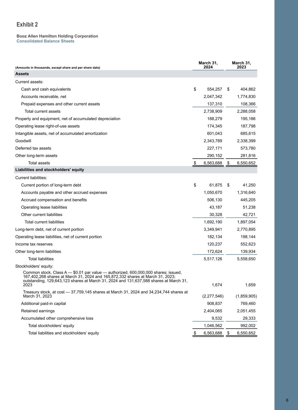 Exhibit 2 Booz Allen Hamilton Holding Corporation Consolidated Balance Sheets (Amounts in thousands, except share and per share data) March 31, 2024 March 31, 2023 Assets Current assets: Cash and cash equivalents $ 554,257 $ 404,862 Accounts receivable, net 2,047,342 1,774,830 Prepaid expenses and other current assets 137,310 108,366 Total current assets 2,738,909 2,288,058 Property and equipment, net of accumulated depreciation 188,279 195,186 Operating lease right-of-use assets 174,345 187,798 Intangible assets, net of accumulated amortization 601,043 685,615 Goodwill 2,343,789 2,338,399 Deferred tax assets 227,171 573,780 Other long-term assets 290,152 281,816 Total assets $ 6,563,688 $ 6,550,652 Liabilities and stockholders' equity Current liabilities: Current portion of long-term debt $ 61,875 $ 41,250 Accounts payable and other accrued expenses 1,050,670 1,316,640 Accrued compensation and benefits 506,130 445,205 Operating lease liabilities 43,187 51,238 Other current liabilities 30,328 42,721 Total current liabilities 1,692,190 1,897,054 Long-term debt, net of current portion 3,349,941 2,770,895 Operating lease liabilities, net of current portion 182,134 198,144 Income tax reserves 120,237 552,623 Other long-term liabilities 172,624 139,934 Total liabilities 5,517,126 5,558,650 Stockholders’ equity: Common stock, Class A — $0.01 par value — authorized, 600,000,000 shares; issued, 167,402,268 shares at March 31, 2024 and 165,872,332 shares at March 31, 2023; outstanding, 129,643,123 shares at March 31, 2024 and 131,637,588 shares at March 31, 2023 1,674 1,659 Treasury stock, at cost — 37,759,145 shares at March 31, 2024 and 34,234,744 shares at March 31, 2023 (2,277,546) (1,859,905) Additional paid-in capital 908,837 769,460 Retained earnings 2,404,065 2,051,455 Accumulated other comprehensive loss 9,532 29,333 Total stockholders’ equity 1,046,562 992,002 Total liabilities and stockholders’ equity $ 6,563,688 $ 6,550,652 66
