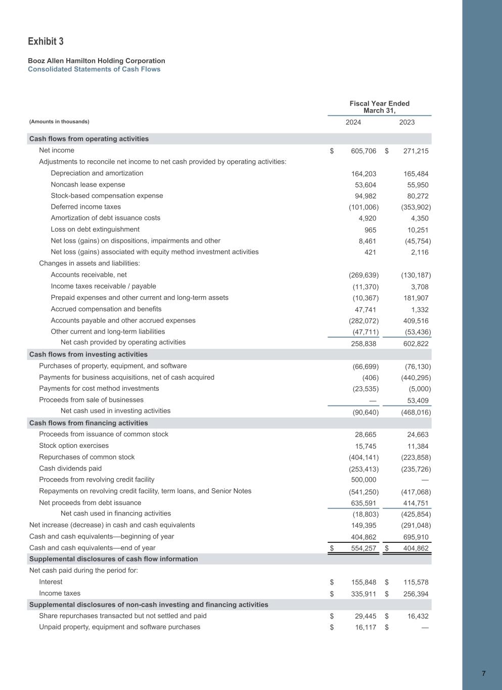 Exhibit 3 Booz Allen Hamilton Holding Corporation Consolidated Statements of Cash Flows 7 Fiscal Year Ended March 31, (Amounts in thousands) 2024 2023 Cash flows from operating activities Net income $ 605,706 $ 271,215 Adjustments to reconcile net income to net cash provided by operating activities: Depreciation and amortization 164,203 165,484 Noncash lease expense 53,604 55,950 Stock-based compensation expense 94,982 80,272 Deferred income taxes (101,006) (353,902) Amortization of debt issuance costs 4,920 4,350 Loss on debt extinguishment 965 10,251 Net loss (gains) on dispositions, impairments and other 8,461 (45,754) Net loss (gains) associated with equity method investment activities 421 2,116 Changes in assets and liabilities: Accounts receivable, net (269,639) (130,187) Income taxes receivable / payable (11,370) 3,708 Prepaid expenses and other current and long-term assets (10,367) 181,907 Accrued compensation and benefits 47,741 1,332 Accounts payable and other accrued expenses (282,072) 409,516 Other current and long-term liabilities (47,711) (53,436) Net cash provided by operating activities 258,838 602,822 Cash flows from investing activities Purchases of property, equipment, and software (66,699) (76,130) Payments for business acquisitions, net of cash acquired (406) (440,295) Payments for cost method investments (23,535) (5,000) Proceeds from sale of businesses — 53,409 Net cash used in investing activities (90,640) (468,016) Cash flows from financing activities Proceeds from issuance of common stock 28,665 24,663 Stock option exercises 15,745 11,384 Repurchases of common stock (404,141) (223,858) Cash dividends paid (253,413) (235,726) Proceeds from revolving credit facility 500,000 — Repayments on revolving credit facility, term loans, and Senior Notes (541,250) (417,068) Net proceeds from debt issuance 635,591 414,751 Net cash used in financing activities (18,803) (425,854) Net increase (decrease) in cash and cash equivalents 149,395 (291,048) Cash and cash equivalents––beginning of year 404,862 695,910 Cash and cash equivalents––end of year $ 554,257 $ 404,862 Supplemental disclosures of cash flow information Net cash paid during the period for: Interest $ 155,848 $ 115,578 Income taxes $ 335,911 $ 256,394 Supplemental disclosures of non-cash investing and financing activities Share repurchases transacted but not settled and paid $ 29,445 $ 16,432 Unpaid property, equipment and software purchases $ 16,117 $ — 7