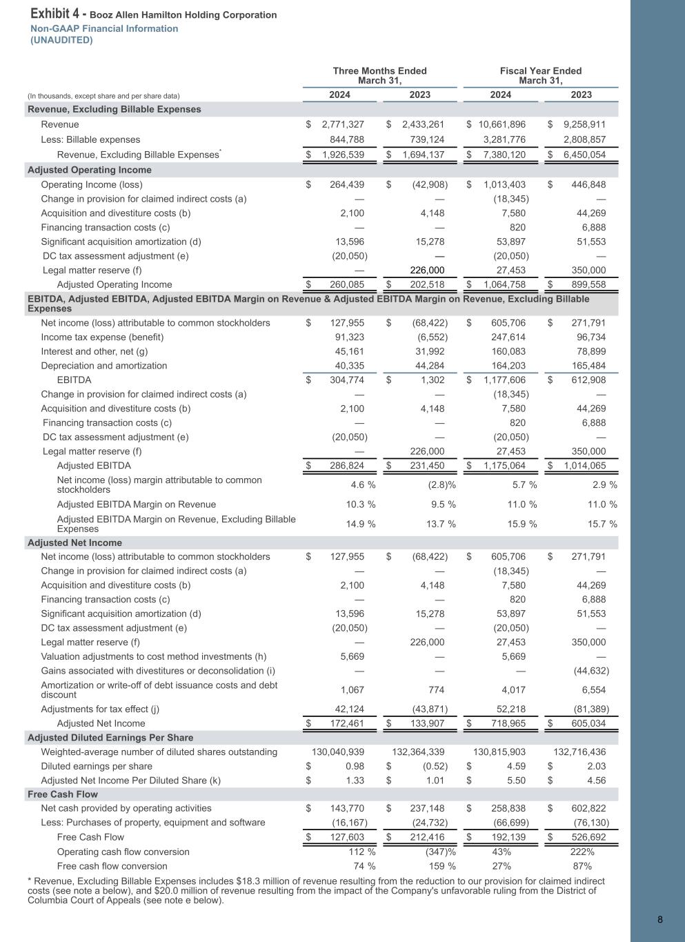 Exhibit 4 - Booz Allen Hamilton Holding Corporation Non-GAAP Financial Information (UNAUDITED) 8 Three Months Ended March 31, Fiscal Year Ended March 31, (In thousands, except share and per share data) 2024 2023 2024 2023 Revenue, Excluding Billable Expenses Revenue $ 2,771,327 $ 2,433,261 $ 10,661,896 $ 9,258,911 Less: Billable expenses 844,788 739,124 3,281,776 2,808,857 Revenue, Excluding Billable Expenses* $ 1,926,539 $ 1,694,137 $ 7,380,120 $ 6,450,054 Adjusted Operating Income Operating Income (loss) $ 264,439 $ (42,908) $ 1,013,403 $ 446,848 Change in provision for claimed indirect costs (a) — — (18,345) — Acquisition and divestiture costs (b) 2,100 4,148 7,580 44,269 Financing transaction costs (c) — — 820 6,888 Significant acquisition amortization (d) 13,596 15,278 53,897 51,553 DC tax assessment adjustment (e) (20,050) — (20,050) — Legal matter reserve (f) — 226,000 27,453 350,000 Adjusted Operating Income $ 260,085 $ 202,518 $ 1,064,758 $ 899,558 EBITDA, Adjusted EBITDA, Adjusted EBITDA Margin on Revenue & Adjusted EBITDA Margin on Revenue, Excluding Billable Expenses Net income (loss) attributable to common stockholders $ 127,955 $ (68,422) $ 605,706 $ 271,791 Income tax expense (benefit) 91,323 (6,552) 247,614 96,734 Interest and other, net (g) 45,161 31,992 160,083 78,899 Depreciation and amortization 40,335 44,284 164,203 165,484 EBITDA $ 304,774 $ 1,302 $ 1,177,606 $ 612,908 Change in provision for claimed indirect costs (a) — — (18,345) — Acquisition and divestiture costs (b) 2,100 4,148 7,580 44,269 Financing transaction costs (c) — — 820 6,888 DC tax assessment adjustment (e) (20,050) — (20,050) — Legal matter reserve (f) — 226,000 27,453 350,000 Adjusted EBITDA $ 286,824 $ 231,450 $ 1,175,064 $ 1,014,065 Net income (loss) margin attributable to common stockholders 4.6 % (2.8) % 5.7 % 2.9 % Adjusted EBITDA Margin on Revenue 10.3 % 9.5 % 11.0 % 11.0 % Adjusted EBITDA Margin on Revenue, Excluding Billable Expenses 14.9 % 13.7 % 15.9 % 15.7 % Adjusted Net Income Net income (loss) attributable to common stockholders $ 127,955 $ (68,422) $ 605,706 $ 271,791 Change in provision for claimed indirect costs (a) — — (18,345) — Acquisition and divestiture costs (b) 2,100 4,148 7,580 44,269 Financing transaction costs (c) — — 820 6,888 Significant acquisition amortization (d) 13,596 15,278 53,897 51,553 DC tax assessment adjustment (e) (20,050) — (20,050) — Legal matter reserve (f) — 226,000 27,453 350,000 Valuation adjustments to cost method investments (h) 5,669 — 5,669 — Gains associated with divestitures or deconsolidation (i) — — — (44,632) Amortization or write-off of debt issuance costs and debt discount 1,067 774 4,017 6,554 Adjustments for tax effect (j) 42,124 (43,871) 52,218 (81,389) Adjusted Net Income $ 172,461 $ 133,907 $ 718,965 $ 605,034 Adjusted Diluted Earnings Per Share Weighted-average number of diluted shares outstanding 130,040,939 132,364,339 130,815,903 132,716,436 Diluted earnings per share $ 0.98 $ (0.52) $ 4.59 $ 2.03 Adjusted Net Income Per Diluted Share (k) $ 1.33 $ 1.01 $ 5.50 $ 4.56 Free Cash Flow Net cash provided by operating activities $ 143,770 $ 237,148 $ 258,838 $ 602,822 Less: Purchases of property, equipment and software (16,167) (24,732) (66,699) (76,130) Free Cash Flow $ 127,603 $ 212,416 $ 192,139 $ 526,692 Operating cash flow conversion 112 % (347) % 43% 222% Free cash flow conversion 74 % 159 % 27% 87% * Revenue, Excluding Billable Expenses includes $18.3 million of revenue resulting from the reduction to our provision for claimed indirect costs (see note a below), and $20.0 million of revenue resulting from the impact of the Company's unfavorable ruling from the District of Columbia Court of Appeals (see note e below). 8