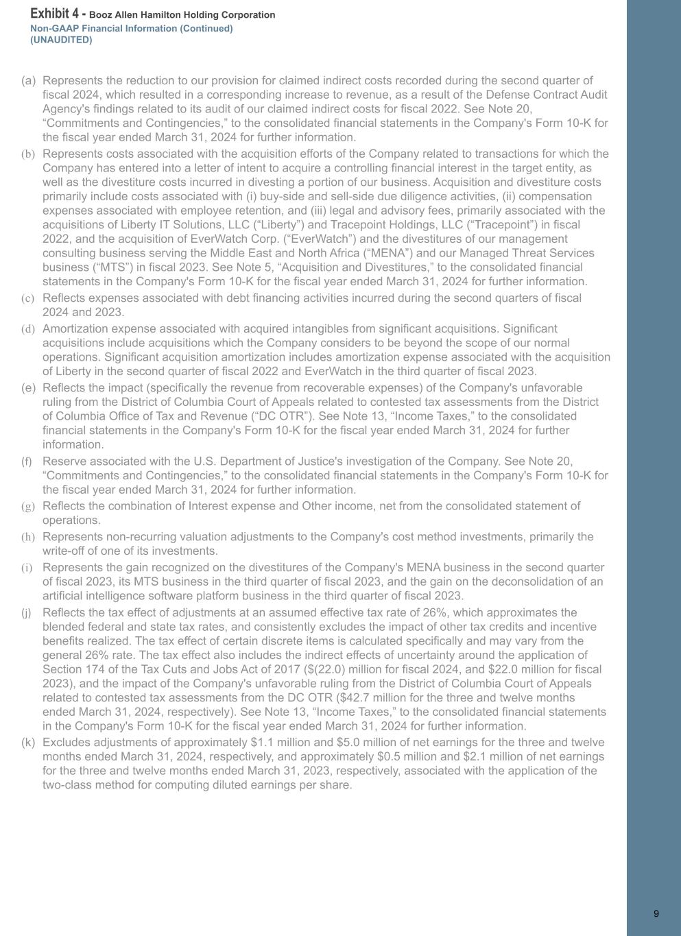 Exhibit 4 - Booz Allen Hamilton Holding Corporation Non-GAAP Financial Information (Continued) (UNAUDITED) 99 (a) Represents the reduction to our provision for claimed indirect costs recorded during the second quarter of fiscal 2024, which resulted in a corresponding increase to revenue, as a result of the Defense Contract Audit Agency's findings related to its audit of our claimed indirect costs for fiscal 2022. See Note 20, “Commitments and Contingencies,” to the consolidated financial statements in the Company's Form 10-K for the fiscal year ended March 31, 2024 for further information. (b) Represents costs associated with the acquisition efforts of the Company related to transactions for which the Company has entered into a letter of intent to acquire a controlling financial interest in the target entity, as well as the divestiture costs incurred in divesting a portion of our business. Acquisition and divestiture costs primarily include costs associated with (i) buy-side and sell-side due diligence activities, (ii) compensation expenses associated with employee retention, and (iii) legal and advisory fees, primarily associated with the acquisitions of Liberty IT Solutions, LLC (“Liberty”) and Tracepoint Holdings, LLC (“Tracepoint”) in fiscal 2022, and the acquisition of EverWatch Corp. (“EverWatch”) and the divestitures of our management consulting business serving the Middle East and North Africa (“MENA”) and our Managed Threat Services business (“MTS”) in fiscal 2023. See Note 5, “Acquisition and Divestitures,” to the consolidated financial statements in the Company's Form 10-K for the fiscal year ended March 31, 2024 for further information. (c) Reflects expenses associated with debt financing activities incurred during the second quarters of fiscal 2024 and 2023. (d) Amortization expense associated with acquired intangibles from significant acquisitions. Significant acquisitions include acquisitions which the Company considers to be beyond the scope of our normal operations. Significant acquisition amortization includes amortization expense associated with the acquisition of Liberty in the second quarter of fiscal 2022 and EverWatch in the third quarter of fiscal 2023. (e) Reflects the impact (specifically the revenue from recoverable expenses) of the Company's unfavorable ruling from the District of Columbia Court of Appeals related to contested tax assessments from the District of Columbia Office of Tax and Revenue (“DC OTR”). See Note 13, “Income Taxes,” to the consolidated financial statements in the Company's Form 10-K for the fiscal year ended March 31, 2024 for further information. (f) Reserve associated with the U.S. Department of Justice's investigation of the Company. See Note 20, “Commitments and Contingencies,” to the consolidated financial statements in the Company's Form 10-K for the fiscal year ended March 31, 2024 for further information. (g) Reflects the combination of Interest expense and Other income, net from the consolidated statement of operations. (h) Represents non-recurring valuation adjustments to the Company's cost method investments, primarily the write-off of one of its investments. (i) Represents the gain recognized on the divestitures of the Company's MENA business in the second quarter of fiscal 2023, its MTS business in the third quarter of fiscal 2023, and the gain on the deconsolidation of an artificial intelligence software platform business in the third quarter of fiscal 2023. (j) Reflects the tax effect of adjustments at an assumed effective tax rate of 26%, which approximates the blended federal and state tax rates, and consistently excludes the impact of other tax credits and incentive benefits realized. The tax effect of certain discrete items is calculated specifically and may vary from the general 26% rate. The tax effect also includes the indirect effects of uncertainty around the application of Section 174 of the Tax Cuts and Jobs Act of 2017 ($(22.0) million for fiscal 2024, and $22.0 million for fiscal 2023), and the impact of the Company's unfavorable ruling from the District of Columbia Court of Appeals related to contested tax assessments from the DC OTR ($42.7 million for the three and twelve months ended March 31, 2024, respectively). See Note 13, “Income Taxes,” to the consolidated financial statements in the Company's Form 10-K for the fiscal year ended March 31, 2024 for further information. (k) Excludes adjustments of approximately $1.1 million and $5.0 million of net earnings for the three and twelve months ended March 31, 2024, respectively, and approximately $0.5 million and $2.1 million of net earnings for the three and twelve months ended March 31, 2023, respectively, associated with the application of the two-class method for computing diluted earnings per share.