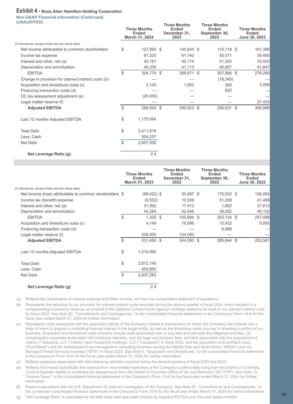 Exhibit 4 - Booz Allen Hamilton Holding Corporation Non-GAAP Financial Information (Continued) (UNAUDITED) 1 0 Three Months Ended March 31, 2024 Three Months Ended December 31, 2023 Three Months Ended September 30, 2023 Three Months Ended June 30, 2023 (In thousands, except share and per share data) Net income attributable to common stockholders $ 127,955 $ 145,644 $ 170,718 $ 161,388 Income tax expense 91,323 61,740 55,071 39,480 Interest and other, net (a) 45,161 40,174 41,200 33,550 Depreciation and amortization 40,335 41,113 40,907 41,847 EBITDA $ 304,774 $ 288,671 $ 307,896 $ 276,265 Change in provision for claimed indirect costs (b) — — (18,345) — Acquisition and divestiture costs (c) 2,100 1,952 260 3,268 Financing transaction costs (d) — — 820 — DC tax assessment adjustment (e) (20,050) — — — Legal matter reserve (f) — — — 27,453 Adjusted EBITDA $ 286,824 $ 290,623 $ 290,631 $ 306,986 Last 12 months Adjusted EBITDA $ 1,175,064 Total Debt $ 3,411,816 Less: Cash 554,257 Net Debt $ 2,857,559 Net Leverage Ratio (g) 2.4 Three Months Ended March 31, 2023 Three Months Ended December 31, 2022 Three Months Ended September 30, 2022 Three Months Ended June 30, 2022 (In thousands, except share and per share data) Net income (loss) attributable to common stockholders $ (68,422) $ 30,997 $ 170,932 $ 138,284 Income tax (benefit) expense (6,552) 10,539 51,258 41,489 Interest and other, net (a) 31,992 17,412 1,882 27,613 Depreciation and amortization 44,284 42,046 39,052 40,102 EBITDA $ 1,302 $ 100,994 $ 263,124 $ 247,488 Acquisition and divestiture costs (c) 4,148 19,096 15,932 5,093 Financing transaction costs (d) — — 6,888 — Legal matter reserve (f) 226,000 124,000 — — Adjusted EBITDA $ 231,450 $ 244,090 $ 285,944 $ 252,581 Last 12 months Adjusted EBITDA $ 1,014,065 Total Debt $ 2,812,145 Less: Cash 404,862 Net Debt $ 2,407,283 Net Leverage Ratio (g) 2.4 10 (a) Reflects the combination of Interest expense and Other income, net from the consolidated statement of operations. (b) Represents the reduction to our provision for claimed indirect costs recorded during the second quarter of fiscal 2024, which resulted in a corresponding increase to revenue, as a result of the Defense Contract Audit Agency's findings related to its audit of our claimed indirect costs for fiscal 2022. See Note 20, “Commitments and Contingencies,” to the consolidated financial statements in the Company's Form 10-K for the fiscal year ended March 31, 2024 for further information. (c) Represents costs associated with the acquisition efforts of the Company related to transactions for which the Company has entered into a letter of intent to acquire a controlling financial interest in the target entity, as well as the divestiture costs incurred in divesting a portion of our business. Acquisition and divestiture costs primarily include costs associated with (i) buy-side and sell-side due diligence activities, (ii) compensation expenses associated with employee retention, and (iii) legal and advisory fees, primarily associated with the acquisitions of Liberty IT Solutions, LLC (“Liberty”) and Tracepoint Holdings, LLC (“Tracepoint”) in fiscal 2022, and the acquisition of EverWatch Corp. (“EverWatch”) and the divestitures of our management consulting business serving the Middle East and North Africa (“MENA”) and our Managed Threat Services business (“MTS”) in fiscal 2023. See Note 5, “Acquisition and Divestitures,” to the consolidated financial statements in the Company's From 10-K for the fiscal year ended March 31, 2024 for further information. (d) Reflects expenses associated with debt financing activities incurred during the second quarters of fiscal 2024 and 2023. (e) Reflects the impact (specifically the revenue from recoverable expenses) of the Company's unfavorable ruling from the District of Columbia Court of Appeals related to contested tax assessments from the District of Columbia Office of Tax and Revenue (“DC OTR”). See Note 13, “Income Taxes,” to the consolidated financial statements in the Company's From 10-K for the fiscal year ended March 31, 2024 for further information. (f) Reserve associated with the U.S. Department of Justice's investigation of the Company. See Note 20, “Commitments and Contingencies,” to the condensed consolidated financial statements in the Company's Form 10-K for the fiscal year ended March 31, 2024 for further information (g) "Net Leverage Ratio" is calculated as net debt (total debt less cash) divided by Adjusted EBITDA over the prior twelve months.