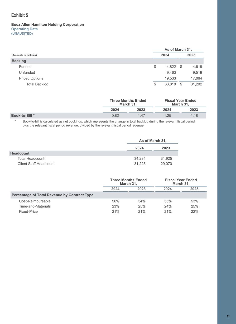 1 1 Exhibit 5 Booz Allen Hamilton Holding Corporation Operating Data (UNAUDITED) As of March 31, (Amounts in millions) 2024 2023 Backlog Funded $ 4,822 $ 4,619 Unfunded 9,463 9,519 Priced Options 19,533 17,064 Total Backlog $ 33,818 $ 31,202 Three Months Ended March 31, Fiscal Year Ended March 31, 2024 2023 2024 2023 Book-to-Bill * 0.82 1.47 1.25 1.18 * Book-to-bill is calculated as net bookings, which represents the change in total backlog during the relevant fiscal period plus the relevant fiscal period revenue, divided by the relevant fiscal period revenue. As of March 31, 2024 2023 Headcount Total Headcount 34,234 31,925 Client Staff Headcount 31,228 29,070 Three Months Ended March 31, Fiscal Year Ended March 31, 2024 2023 2024 2023 Percentage of Total Revenue by Contract Type Cost-Reimbursable 56% 54% 55% 53% Time-and-Materials 23% 25% 24% 25% Fixed-Price 21% 21% 21% 22% 11