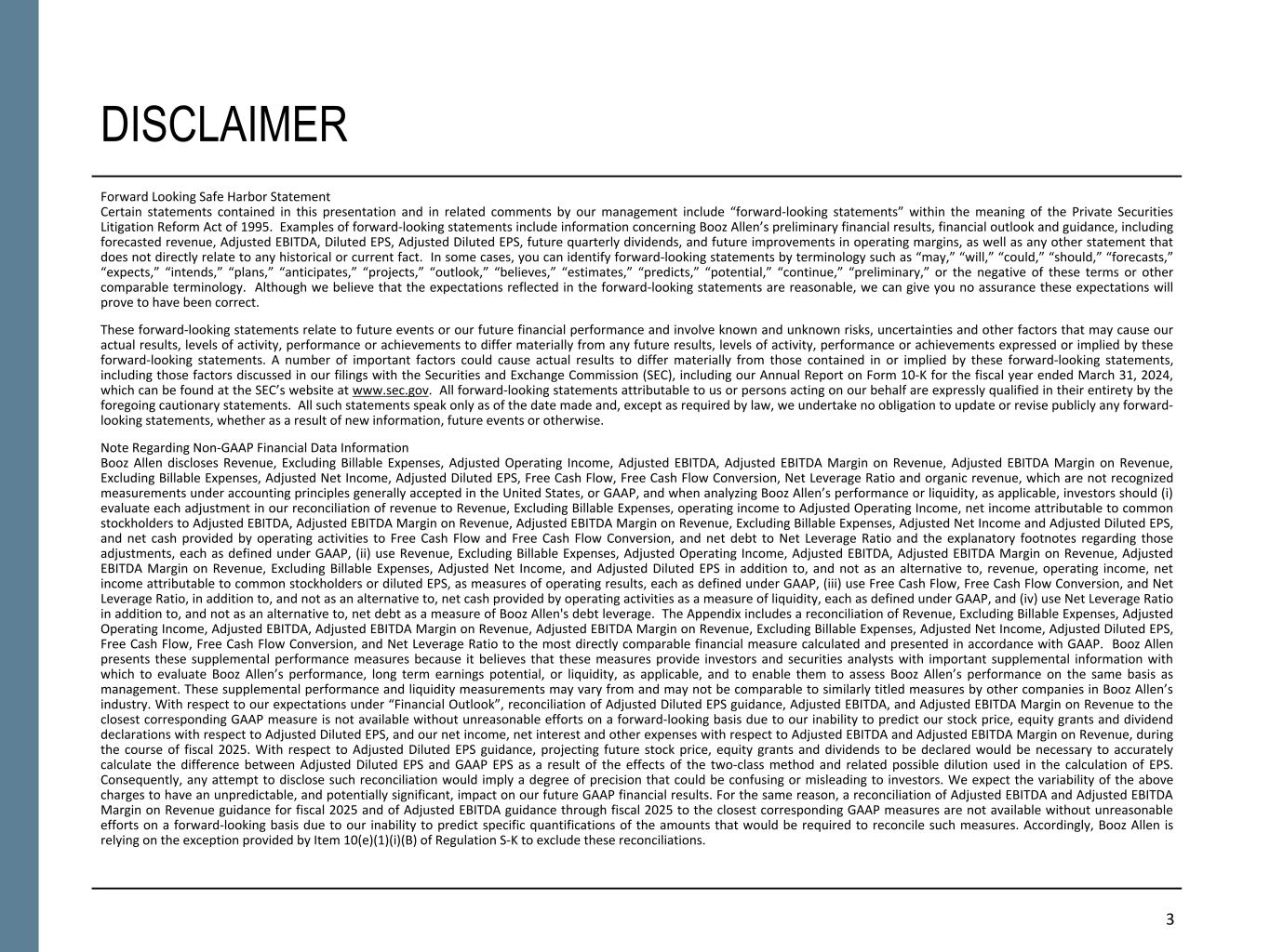 3 DISCLAIMER Forward Looking Safe Harbor Statement Certain statements contained in this presentation and in related comments by our management include “forward-looking statements” within the meaning of the Private Securities Litigation Reform Act of 1995. Examples of forward-looking statements include information concerning Booz Allen’s preliminary financial results, financial outlook and guidance, including forecasted revenue, Adjusted EBITDA, Diluted EPS, Adjusted Diluted EPS, future quarterly dividends, and future improvements in operating margins, as well as any other statement that does not directly relate to any historical or current fact. In some cases, you can identify forward-looking statements by terminology such as “may,” “will,” “could,” “should,” “forecasts,” “expects,” “intends,” “plans,” “anticipates,” “projects,” “outlook,” “believes,” “estimates,” “predicts,” “potential,” “continue,” “preliminary,” or the negative of these terms or other comparable terminology. Although we believe that the expectations reflected in the forward-looking statements are reasonable, we can give you no assurance these expectations will prove to have been correct. These forward-looking statements relate to future events or our future financial performance and involve known and unknown risks, uncertainties and other factors that may cause our actual results, levels of activity, performance or achievements to differ materially from any future results, levels of activity, performance or achievements expressed or implied by these forward-looking statements. A number of important factors could cause actual results to differ materially from those contained in or implied by these forward-looking statements, including those factors discussed in our filings with the Securities and Exchange Commission (SEC), including our Annual Report on Form 10-K for the fiscal year ended March 31, 2024, which can be found at the SEC’s website at www.sec.gov. All forward-looking statements attributable to us or persons acting on our behalf are expressly qualified in their entirety by the foregoing cautionary statements. All such statements speak only as of the date made and, except as required by law, we undertake no obligation to update or revise publicly any forward- looking statements, whether as a result of new information, future events or otherwise. Note Regarding Non-GAAP Financial Data Information Booz Allen discloses Revenue, Excluding Billable Expenses, Adjusted Operating Income, Adjusted EBITDA, Adjusted EBITDA Margin on Revenue, Adjusted EBITDA Margin on Revenue, Excluding Billable Expenses, Adjusted Net Income, Adjusted Diluted EPS, Free Cash Flow, Free Cash Flow Conversion, Net Leverage Ratio and organic revenue, which are not recognized measurements under accounting principles generally accepted in the United States, or GAAP, and when analyzing Booz Allen’s performance or liquidity, as applicable, investors should (i) evaluate each adjustment in our reconciliation of revenue to Revenue, Excluding Billable Expenses, operating income to Adjusted Operating Income, net income attributable to common stockholders to Adjusted EBITDA, Adjusted EBITDA Margin on Revenue, Adjusted EBITDA Margin on Revenue, Excluding Billable Expenses, Adjusted Net Income and Adjusted Diluted EPS, and net cash provided by operating activities to Free Cash Flow and Free Cash Flow Conversion, and net debt to Net Leverage Ratio and the explanatory footnotes regarding those adjustments, each as defined under GAAP, (ii) use Revenue, Excluding Billable Expenses, Adjusted Operating Income, Adjusted EBITDA, Adjusted EBITDA Margin on Revenue, Adjusted EBITDA Margin on Revenue, Excluding Billable Expenses, Adjusted Net Income, and Adjusted Diluted EPS in addition to, and not as an alternative to, revenue, operating income, net income attributable to common stockholders or diluted EPS, as measures of operating results, each as defined under GAAP, (iii) use Free Cash Flow, Free Cash Flow Conversion, and Net Leverage Ratio, in addition to, and not as an alternative to, net cash provided by operating activities as a measure of liquidity, each as defined under GAAP, and (iv) use Net Leverage Ratio in addition to, and not as an alternative to, net debt as a measure of Booz Allen's debt leverage. The Appendix includes a reconciliation of Revenue, Excluding Billable Expenses, Adjusted Operating Income, Adjusted EBITDA, Adjusted EBITDA Margin on Revenue, Adjusted EBITDA Margin on Revenue, Excluding Billable Expenses, Adjusted Net Income, Adjusted Diluted EPS, Free Cash Flow, Free Cash Flow Conversion, and Net Leverage Ratio to the most directly comparable financial measure calculated and presented in accordance with GAAP. Booz Allen presents these supplemental performance measures because it believes that these measures provide investors and securities analysts with important supplemental information with which to evaluate Booz Allen’s performance, long term earnings potential, or liquidity, as applicable, and to enable them to assess Booz Allen’s performance on the same basis as management. These supplemental performance and liquidity measurements may vary from and may not be comparable to similarly titled measures by other companies in Booz Allen’s industry. With respect to our expectations under “Financial Outlook”, reconciliation of Adjusted Diluted EPS guidance, Adjusted EBITDA, and Adjusted EBITDA Margin on Revenue to the closest corresponding GAAP measure is not available without unreasonable efforts on a forward-looking basis due to our inability to predict our stock price, equity grants and dividend declarations with respect to Adjusted Diluted EPS, and our net income, net interest and other expenses with respect to Adjusted EBITDA and Adjusted EBITDA Margin on Revenue, during the course of fiscal 2025. With respect to Adjusted Diluted EPS guidance, projec