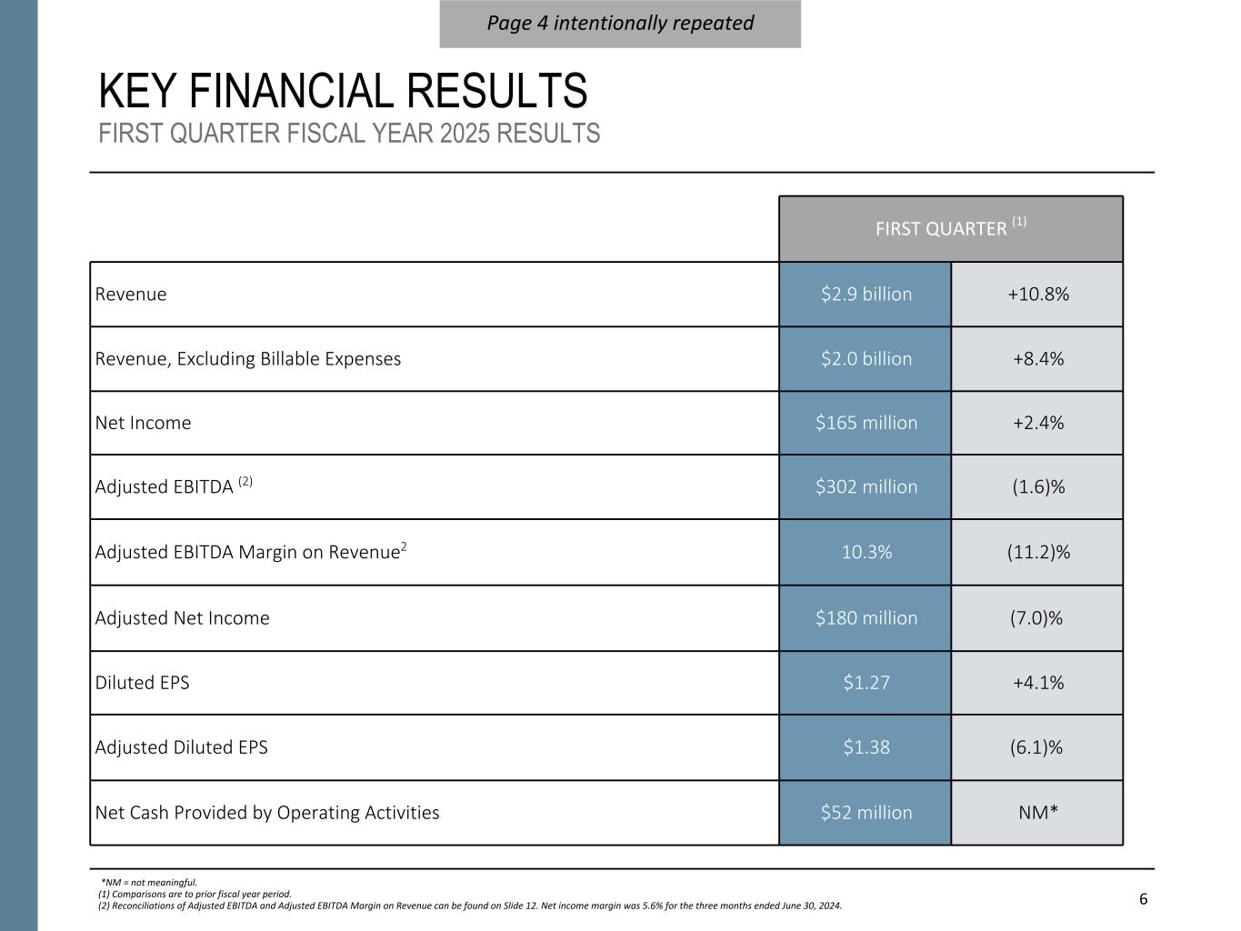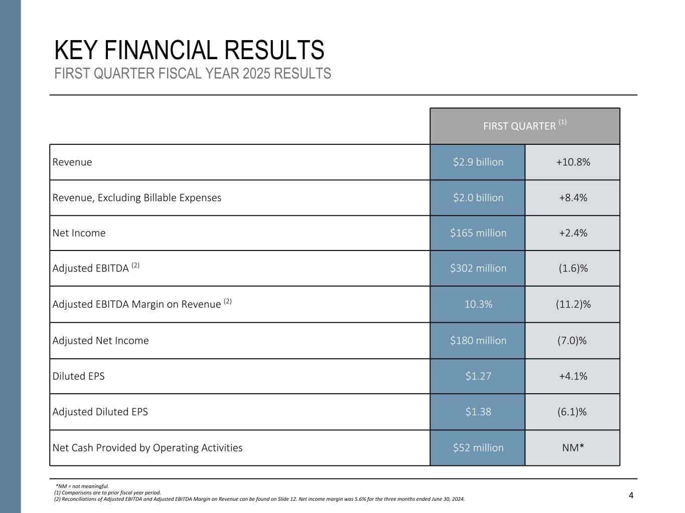 6 KEY FINANCIAL RESULTS FIRST QUARTER FISCAL YEAR 2025 RESULTS FIRST QUARTER (1) Revenue $2.9 billion +10.8% Revenue, Excluding Billable Expenses $2.0 billion +8.4% Net Income $165 million +2.4% Adjusted EBITDA (2) $302 million (1.6)% Adjusted EBITDA Margin on Revenue2 10.3% (11.2)% Adjusted Net Income $180 million (7.0)% Diluted EPS $1.27 +4.1% Adjusted Diluted EPS $1.38 (6.1)% Net Cash Provided by Operating Activities $52 million NM* Page 4 intentionally repeated *NM = not meaningful. (1) Comparisons are to prior fiscal year period. (2) Reconciliations of Adjusted EBITDA and Adjusted EBITDA Margin on Revenue can be found on Slide 12. Net income margin was 5.6% for the three months ended June 30, 2024.