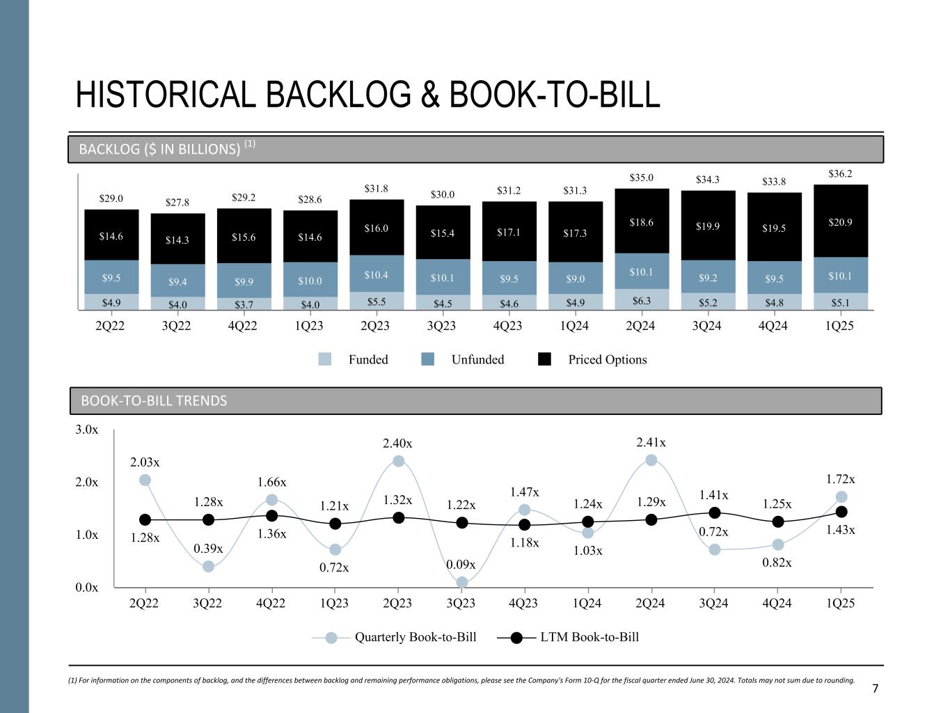 7 $22.0 HISTORICAL BACKLOG & BOOK-TO-BILL (1) For information on the components of backlog, and the differences between backlog and remaining performance obligations, please see the Company's Form 10-Q for the fiscal quarter ended June 30, 2024. Totals may not sum due to rounding. BACKLOG ($ IN BILLIONS) (1) BOOK-TO-BILL TRENDS $29.0 $27.8 $29.2 $28.6 $31.8 $30.0 $31.2 $31.3 $35.0 $34.3 $33.8 $36.2 $4.9 $4.0 $3.7 $4.0 $5.5 $4.5 $4.6 $4.9 $6.3 $5.2 $4.8 $5.1 $9.5 $9.4 $9.9 $10.0 $10.4 $10.1 $9.5 $9.0 $10.1 $9.2 $9.5 $10.1 $14.6 $14.3 $15.6 $14.6 $16.0 $15.4 $17.1 $17.3 $18.6 $19.9 $19.5 $20.9 Funded Unfunded Priced Options 2Q22 3Q22 4Q22 1Q23 2Q23 3Q23 4Q23 1Q24 2Q24 3Q24 4Q24 1Q25 2.03x 0.39x 1.66x 0.72x 2.40x 0.09x 1.47x 1.03x 2.41x 0.72x 0.82x 1.72x 1.28x 1.28x 1.36x 1.21x 1.32x 1.22x 1.18x 1.24x 1.29x 1.41x 1.25x 1.43x Quarterly Book-to-Bill LTM Book-to-Bill 2Q22 3Q22 4Q22 1Q23 2Q23 3Q23 4Q23 1Q24 2Q24 3Q24 4Q24 1Q25 0.0x 1.0x 2.0x 3.0x