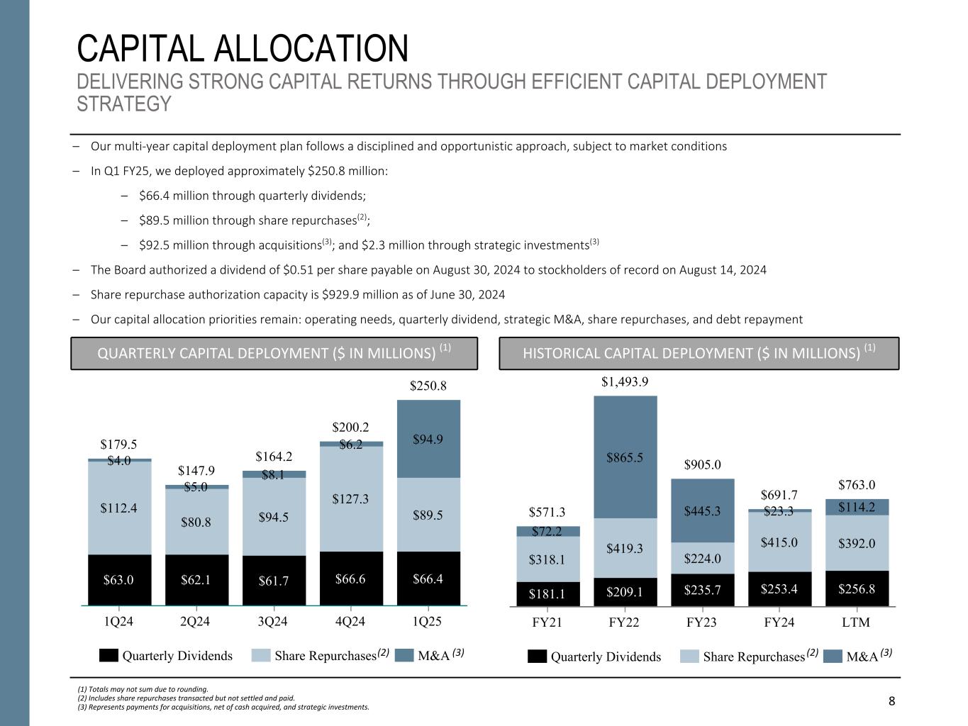 8 CAPITAL ALLOCATION DELIVERING STRONG CAPITAL RETURNS THROUGH EFFICIENT CAPITAL DEPLOYMENT STRATEGY – Our multi-year capital deployment plan follows a disciplined and opportunistic approach, subject to market conditions – In Q1 FY25, we deployed approximately $250.8 million: – $66.4 million through quarterly dividends; – $89.5 million through share repurchases(2); – $92.5 million through acquisitions(3); and $2.3 million through strategic investments(3) – The Board authorized a dividend of $0.51 per share payable on August 30, 2024 to stockholders of record on August 14, 2024 – Share repurchase authorization capacity is $929.9 million as of June 30, 2024 – Our capital allocation priorities remain: operating needs, quarterly dividend, strategic M&A, share repurchases, and debt repayment HISTORICAL CAPITAL DEPLOYMENT ($ IN MILLIONS) (1)QUARTERLY CAPITAL DEPLOYMENT ($ IN MILLIONS) (1) $179.5 $147.9 $164.2 $200.2 $250.8 $63.0 $62.1 $61.7 $66.6 $66.4 $112.4 $80.8 $94.5 $127.3 $89.5 $4.0 $5.0 $8.1 $6.2 $94.9 Quarterly Dividends Share Repurchases M&A 1Q24 2Q24 3Q24 4Q24 1Q25 $571.3 $1,493.9 $905.0 $691.7 $763.0 $181.1 $209.1 $235.7 $253.4 $256.8 $318.1 $419.3 $224.0 $415.0 $392.0 $72.2 $865.5 $445.3 $23.3 $114.2 Quarterly Dividends Share Repurchases M&A FY21 FY22 FY23 FY24 LTM (3) (1) Totals may not sum due to rounding. (2) Includes share repurchases transacted but not settled and paid. (3) Represents payments for acquisitions, net of cash acquired, and strategic investments. (2) (3) (2)