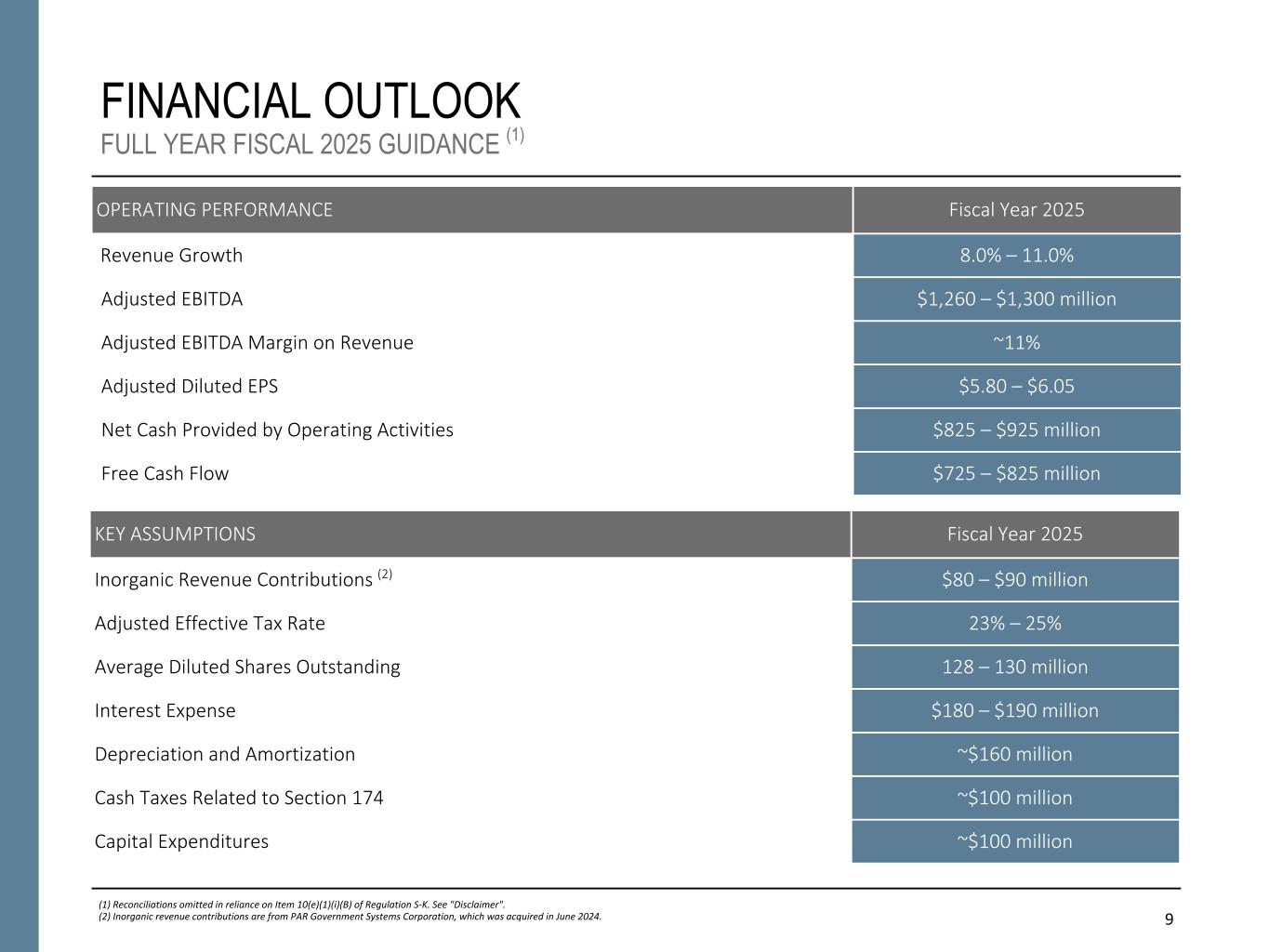 9 FINANCIAL OUTLOOK FULL YEAR FISCAL 2025 GUIDANCE (1) OPERATING PERFORMANCE Fiscal Year 2025 Revenue Growth 8.0% – 11.0% Adjusted EBITDA $1,260 – $1,300 million Adjusted EBITDA Margin on Revenue ~11% Adjusted Diluted EPS $5.80 – $6.05 Net Cash Provided by Operating Activities $825 – $925 million Free Cash Flow $725 – $825 million (1) Reconciliations omitted in reliance on Item 10(e)(1)(i)(B) of Regulation S-K. See "Disclaimer". (2) Inorganic revenue contributions are from PAR Government Systems Corporation, which was acquired in June 2024. KEY ASSUMPTIONS Fiscal Year 2025 Inorganic Revenue Contributions (2) $80 – $90 million Adjusted Effective Tax Rate 23% – 25% Average Diluted Shares Outstanding 128 – 130 million Interest Expense $180 – $190 million Depreciation and Amortization ~$160 million Cash Taxes Related to Section 174 ~$100 million Capital Expenditures ~$100 million
