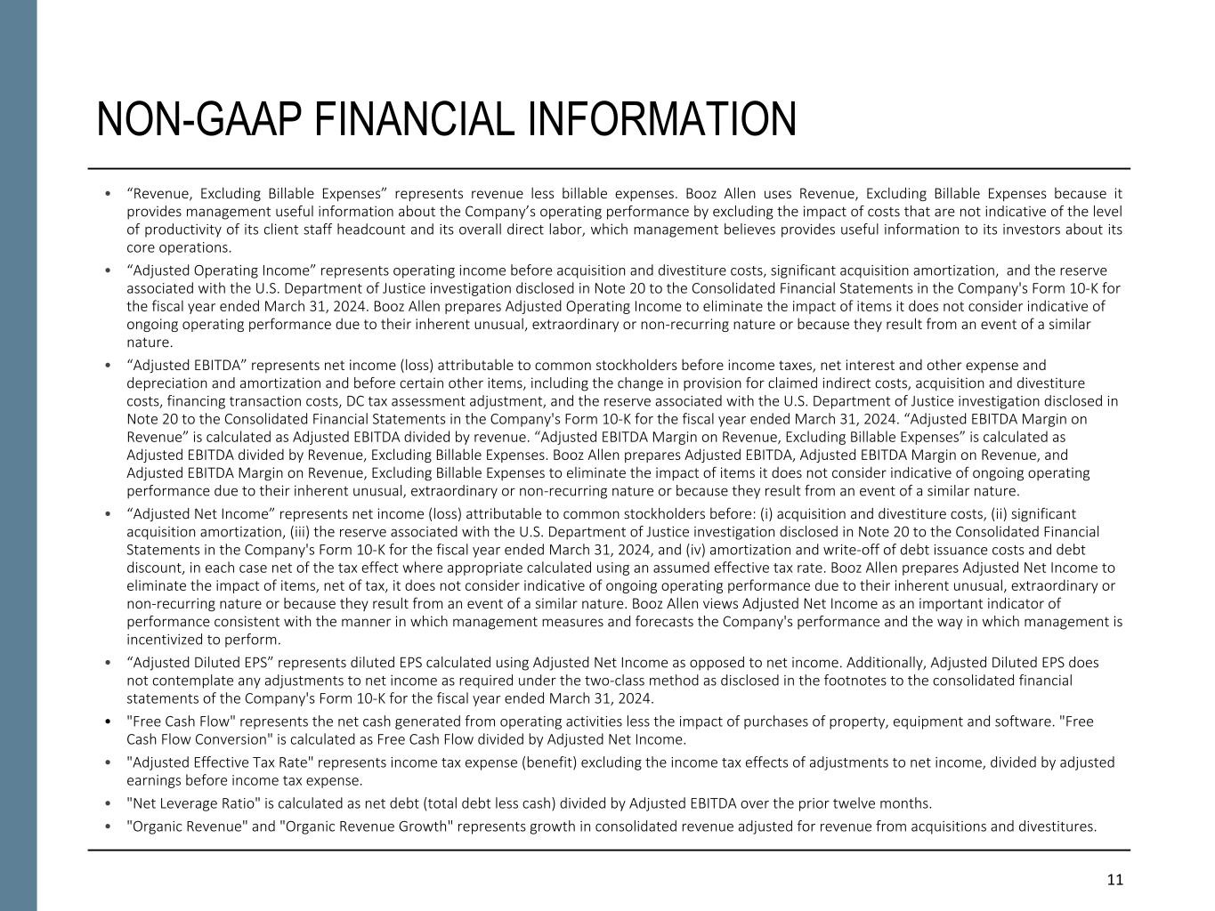 11 NON-GAAP FINANCIAL INFORMATION • “Revenue, Excluding Billable Expenses” represents revenue less billable expenses. Booz Allen uses Revenue, Excluding Billable Expenses because it provides management useful information about the Company’s operating performance by excluding the impact of costs that are not indicative of the level of productivity of its client staff headcount and its overall direct labor, which management believes provides useful information to its investors about its core operations. • “Adjusted Operating Income” represents operating income before acquisition and divestiture costs, significant acquisition amortization, and the reserve associated with the U.S. Department of Justice investigation disclosed in Note 20 to the Consolidated Financial Statements in the Company's Form 10-K for the fiscal year ended March 31, 2024. Booz Allen prepares Adjusted Operating Income to eliminate the impact of items it does not consider indicative of ongoing operating performance due to their inherent unusual, extraordinary or non-recurring nature or because they result from an event of a similar nature. • “Adjusted EBITDA” represents net income (loss) attributable to common stockholders before income taxes, net interest and other expense and depreciation and amortization and before certain other items, including the change in provision for claimed indirect costs, acquisition and divestiture costs, financing transaction costs, DC tax assessment adjustment, and the reserve associated with the U.S. Department of Justice investigation disclosed in Note 20 to the Consolidated Financial Statements in the Company's Form 10-K for the fiscal year ended March 31, 2024. “Adjusted EBITDA Margin on Revenue” is calculated as Adjusted EBITDA divided by revenue. “Adjusted EBITDA Margin on Revenue, Excluding Billable Expenses” is calculated as Adjusted EBITDA divided by Revenue, Excluding Billable Expenses. Booz Allen prepares Adjusted EBITDA, Adjusted EBITDA Margin on Revenue, and Adjusted EBITDA Margin on Revenue, Excluding Billable Expenses to eliminate the impact of items it does not consider indicative of ongoing operating performance due to their inherent unusual, extraordinary or non-recurring nature or because they result from an event of a similar nature. • “Adjusted Net Income” represents net income (loss) attributable to common stockholders before: (i) acquisition and divestiture costs, (ii) significant acquisition amortization, (iii) the reserve associated with the U.S. Department of Justice investigation disclosed in Note 20 to the Consolidated Financial Statements in the Company's Form 10-K for the fiscal year ended March 31, 2024, and (iv) amortization and write-off of debt issuance costs and debt discount, in each case net of the tax effect where appropriate calculated using an assumed effective tax rate. Booz Allen prepares Adjusted Net Income to eliminate the impact of items, net of tax, it does not consider indicative of ongoing operating performance due to their inherent unusual, extraordinary or non-recurring nature or because they result from an event of a similar nature. Booz Allen views Adjusted Net Income as an important indicator of performance consistent with the manner in which management measures and forecasts the Company's performance and the way in which management is incentivized to perform. • “Adjusted Diluted EPS” represents diluted EPS calculated using Adjusted Net Income as opposed to net income. Additionally, Adjusted Diluted EPS does not contemplate any adjustments to net income as required under the two-class method as disclosed in the footnotes to the consolidated financial statements of the Company's Form 10-K for the fiscal year ended March 31, 2024. • "Free Cash Flow" represents the net cash generated from operating activities less the impact of purchases of property, equipment and software. "Free Cash Flow Conversion" is calculated as Free Cash Flow divided by Adjusted Net Income. • "Adjusted Effective Tax Rate" represents income tax expense (benefit) excluding the income tax effects of adjustments to net income, divided by adjusted earnings before income tax expense. • "Net Leverage Ratio" is calculated as net debt (total debt less cash) divided by Adjusted EBITDA over the prior twelve months. • "Organic Revenue" and "Organic Revenue Growth" represents growth in consolidated revenue adjusted for revenue from acquisitions and divestitures.