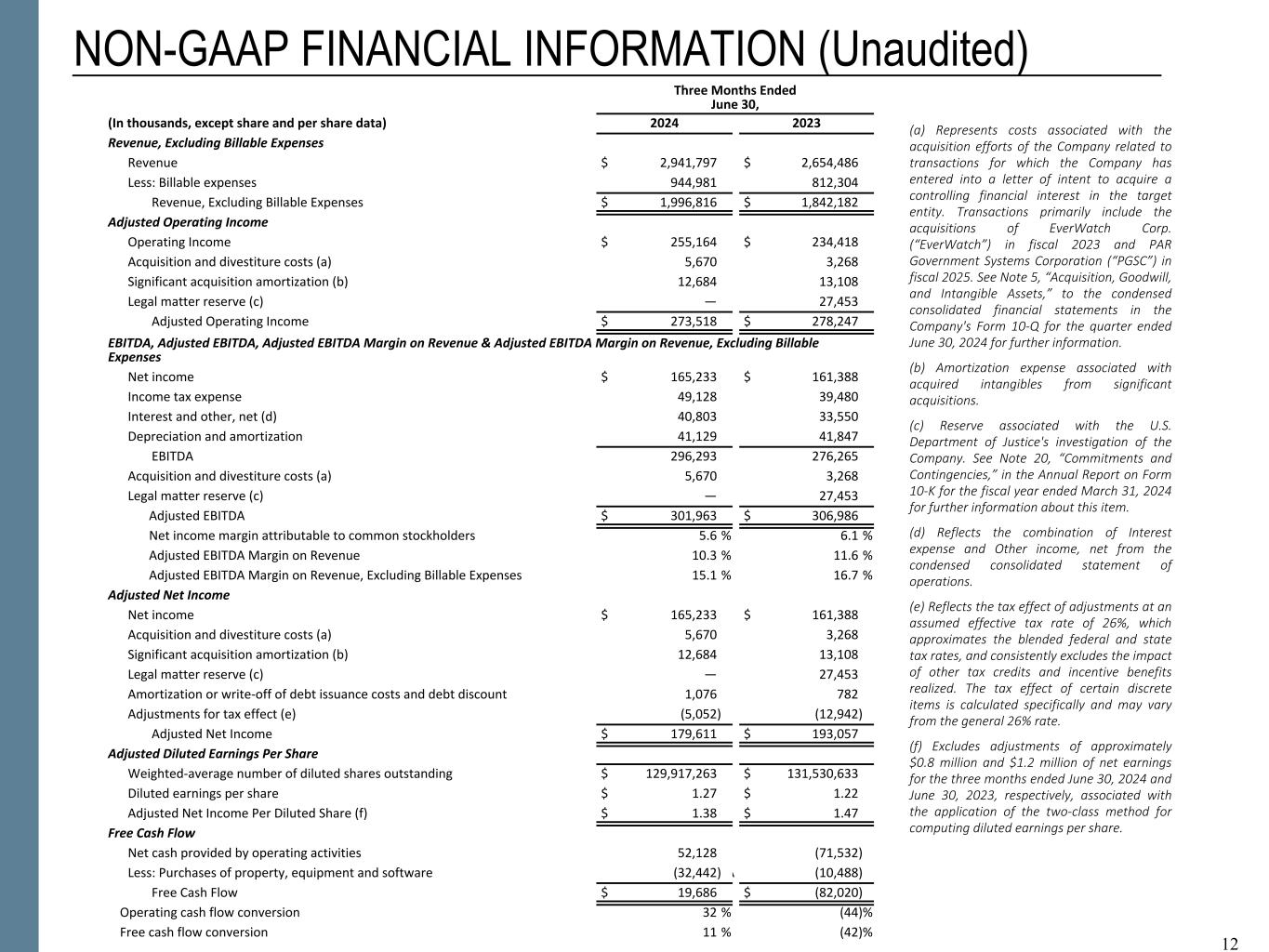 12 NON-GAAP FINANCIAL INFORMATION (Unaudited) Three Months Ended June 30, (In thousands, except share and per share data) 2024 2023 Revenue, Excluding Billable Expenses Revenue $ 2,941,797 $ 2,654,486 Less: Billable expenses 944,981 812,304 Revenue, Excluding Billable Expenses $ 1,996,816 $ 1,842,182 Adjusted Operating Income Operating Income $ 255,164 $ 234,418 Acquisition and divestiture costs (a) 5,670 3,268 Significant acquisition amortization (b) 12,684 13,108 Legal matter reserve (c) — 27,453 Adjusted Operating Income $ 273,518 $ 278,247 EBITDA, Adjusted EBITDA, Adjusted EBITDA Margin on Revenue & Adjusted EBITDA Margin on Revenue, Excluding Billable Expenses Net income $ 165,233 $ 161,388 Income tax expense 49,128 39,480 Interest and other, net (d) 40,803 33,550 Depreciation and amortization 41,129 41,847 EBITDA 296,293 276,265 Acquisition and divestiture costs (a) 5,670 3,268 Legal matter reserve (c) — 27,453 Adjusted EBITDA $ 301,963 $ 306,986 Net income margin attributable to common stockholders 5.6 % 6.1 % Adjusted EBITDA Margin on Revenue 10.3 % 11.6 % Adjusted EBITDA Margin on Revenue, Excluding Billable Expenses 15.1 % 16.7 % Adjusted Net Income Net income $ 165,233 $ 161,388 Acquisition and divestiture costs (a) 5,670 3,268 Significant acquisition amortization (b) 12,684 13,108 Legal matter reserve (c) — 27,453 Amortization or write-off of debt issuance costs and debt discount 1,076 782 Adjustments for tax effect (e) (5,052) (12,942) Adjusted Net Income $ 179,611 $ 193,057 Adjusted Diluted Earnings Per Share Weighted-average number of diluted shares outstanding $ 129,917,263 $ 131,530,633 Diluted earnings per share $ 1.27 $ 1.22 Adjusted Net Income Per Diluted Share (f) $ 1.38 $ 1.47 Free Cash Flow Net cash provided by operating activities 52,128 (71,532) Less: Purchases of property, equipment and software (32,442) A (10,488) Free Cash Flow $ 19,686 $ (82,020) Operating cash flow conversion 32 % (44) % Free cash flow conversion 11 % (42) % 12 (a) Represents costs associated with the acquisition efforts of the Company related to transactions for which the Company has entered into a letter of intent to acquire a controlling financial interest in the target entity. Transactions primarily include the acquisitions of EverWatch Corp. (“EverWatch”) in fiscal 2023 and PAR Government Systems Corporation (“PGSC”) in fiscal 2025. See Note 5, “Acquisition, Goodwill, and Intangible Assets,” to the condensed consolidated financial statements in the Company's Form 10-Q for the quarter ended June 30, 2024 for further information. (b) Amortization expense associated with acquired intangibles from significant acquisitions. (c) Reserve associated with the U.S. Department of Justice's investigation of the Company. See Note 20, “Commitments and Contingencies,” in the Annual Report on Form 10-K for the fiscal year ended March 31, 2024 for further information about this item. (d) Reflects the combination of Interest expense and Other income, net from the condensed consolidated statement of operations. (e) Reflects the tax effect of adjustments at an assumed effective tax rate of 26%, which approximates the blended federal and state tax rates, and consistently excludes the impact of other tax credits and incentive benefits realized. The tax effect of certain discrete items is calculated specifically and may vary from the general 26% rate. (f) Excludes adjustments of approximately $0.8 million and $1.2 million of net earnings for the three months ended June 30, 2024 and June 30, 2023, respectively, associated with the application of the two-class method for computing diluted earnings per share.