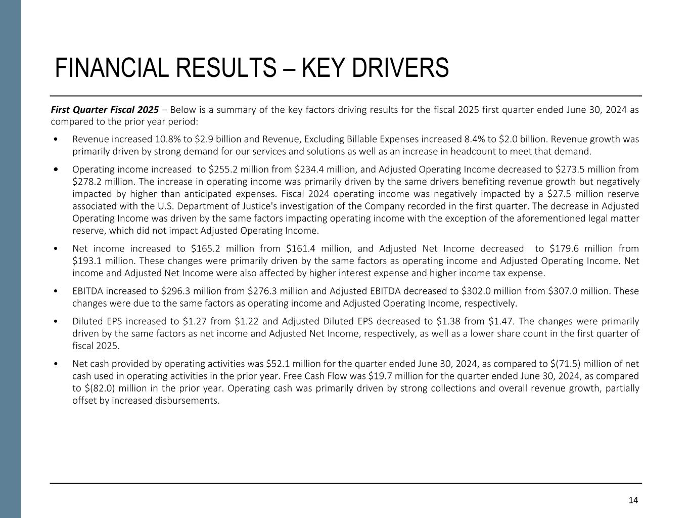 14 FINANCIAL RESULTS – KEY DRIVERS First Quarter Fiscal 2025 – Below is a summary of the key factors driving results for the fiscal 2025 first quarter ended June 30, 2024 as compared to the prior year period: • Revenue increased 10.8% to $2.9 billion and Revenue, Excluding Billable Expenses increased 8.4% to $2.0 billion. Revenue growth was primarily driven by strong demand for our services and solutions as well as an increase in headcount to meet that demand. • Operating income increased to $255.2 million from $234.4 million, and Adjusted Operating Income decreased to $273.5 million from $278.2 million. The increase in operating income was primarily driven by the same drivers benefiting revenue growth but negatively impacted by higher than anticipated expenses. Fiscal 2024 operating income was negatively impacted by a $27.5 million reserve associated with the U.S. Department of Justice's investigation of the Company recorded in the first quarter. The decrease in Adjusted Operating Income was driven by the same factors impacting operating income with the exception of the aforementioned legal matter reserve, which did not impact Adjusted Operating Income. • Net income increased to $165.2 million from $161.4 million, and Adjusted Net Income decreased to $179.6 million from $193.1 million. These changes were primarily driven by the same factors as operating income and Adjusted Operating Income. Net income and Adjusted Net Income were also affected by higher interest expense and higher income tax expense. • EBITDA increased to $296.3 million from $276.3 million and Adjusted EBITDA decreased to $302.0 million from $307.0 million. These changes were due to the same factors as operating income and Adjusted Operating Income, respectively. • Diluted EPS increased to $1.27 from $1.22 and Adjusted Diluted EPS decreased to $1.38 from $1.47. The changes were primarily driven by the same factors as net income and Adjusted Net Income, respectively, as well as a lower share count in the first quarter of fiscal 2025. • Net cash provided by operating activities was $52.1 million for the quarter ended June 30, 2024, as compared to $(71.5) million of net cash used in operating activities in the prior year. Free Cash Flow was $19.7 million for the quarter ended June 30, 2024, as compared to $(82.0) million in the prior year. Operating cash was primarily driven by strong collections and overall revenue growth, partially offset by increased disbursements.