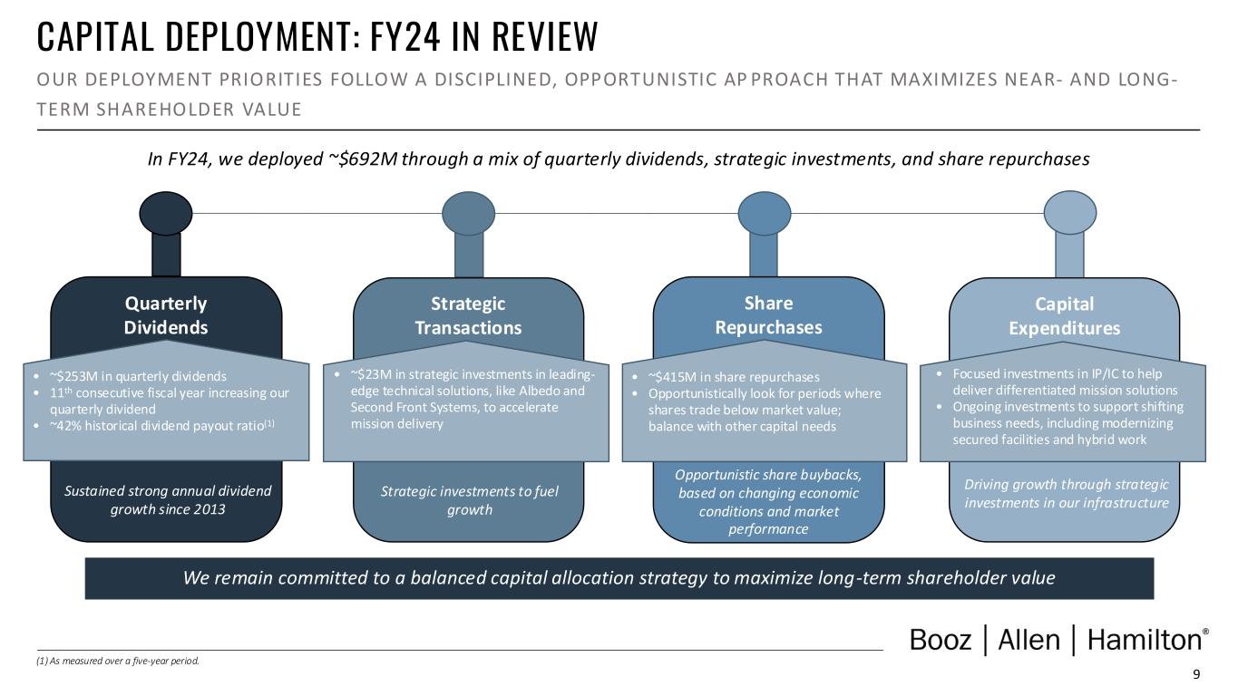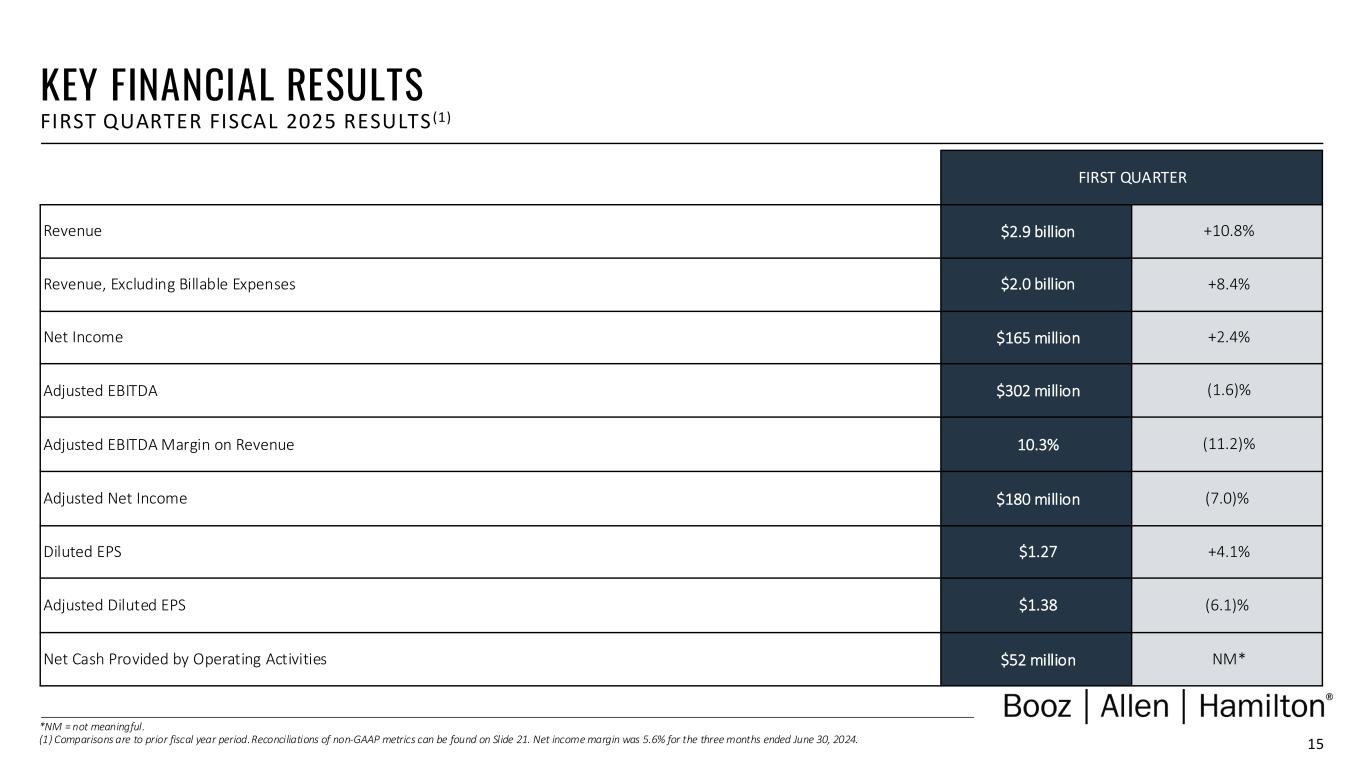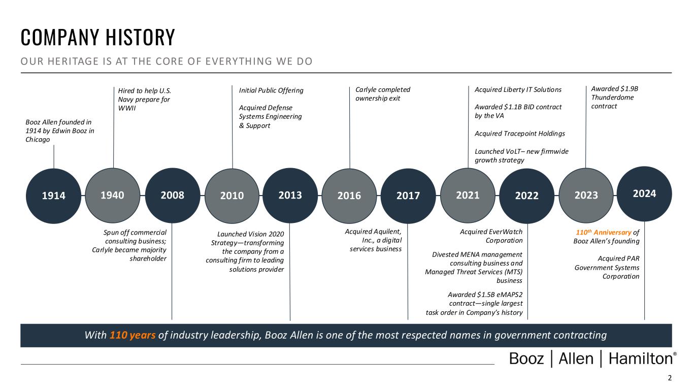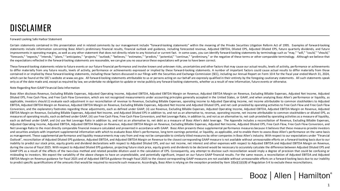 1 DISCLAIMER Forward Looking Safe Harbor Statement Certain statements contained in this presentation and in related comments by our management include “forward-looking statements” within the meaning of the Private Securities Litigation Reform Act of 1995. Examples of forward-looking statements include information concerning Booz Allen’s preliminary financial results, financial outlook and guidance, including forecasted revenue, Adjusted EBITDA, Diluted EPS, Adjusted Diluted EPS, future quarterly dividends, and future improvements in operating margins, as well as any other statement that does not directly relate to any historical or current fact. In some cases, you can identify forward-looking statements by terminology such as “may,” “will,” “could,” “should,” “forecasts,” “expects,” “intends,” “plans,” “anticipates,” “projects,” “outlook,” “believes,” “estimates,” “predicts,” “potential,” “continue,” “preliminary,” or the negative of these terms or other comparable terminology. Although we believe that the expectations reflected in the forward-looking statements are reasonable, we can give you no assurance these expectations will prove to have been correct. These forward-looking statements relate to future events or our future financial performance and involve known and unknown risks, uncertainties and other factors that may cause our actual results, levels of activity, performance or achievements to differ materially from any future results, levels of activity, performance or achievements expressed or implied by these forward-looking statements. A number of important factors could cause actual results to differ materially from those contained in or implied by these forward-looking statements, including those factors discussed in our filings with the Securities and Exchange Commission (SEC), including our Annual Report on Form 10-K for the fiscal year ended March 31, 2024, which can be found at the SEC’s website at www.sec.gov. All forward-looking statements attributable to us or persons acting on our behalf are expressly qualified in their entirety by the foregoing cautionary statements. All such statements speak only as of the date made and, except as required by law, we undertake no obligation to update or revise publicly any forward-looking statements, whether as a result of new information, future events or otherwise. Note Regarding Non-GAAP Financial Data Information Booz Allen discloses Revenue, Excluding Billable Expenses, Adjusted Operating Income, Adjusted EBITDA, Adjusted EBITDA Margin on Revenue, Adjusted EBITDA Margin on Revenue, Excluding Billable Expenses, Adjusted Net Income, Adjusted Diluted EPS, Free Cash Flow, and Free Cash Flow Conversion, which are not recognized measurements under accounting principles generally accepted in the United States, or GAAP, and when analyzing Booz Allen’s performance or liquidity, as applicable, investors should (i) evaluate each adjustment in our reconciliation of revenue to Revenue, Excluding Billable Expenses, operating income to Adjusted Operating Income, net income attributable to common stockholders to Adjusted EBITDA, Adjusted EBITDA Margin on Revenue, Adjusted EBITDA Margin on Revenue, Excluding Billable Expenses, Adjusted Net Income and Adjusted Diluted EPS, and net cash provided by operating activities to Free Cash Flow and Free Cash Flow Conversion, and the explanatory footnotes regarding those adjustments, each as defined under GAAP, (ii) use Revenue, Excluding Billable Expenses, Adjusted Operating Income, Adjusted EBITDA, Adjusted EBITDA Margin on Revenue, Adjusted EBITDA Margin on Revenue, Excluding Billable Expenses, Adjusted Net Income, and Adjusted Diluted EPS in addition to, and not as an alternative to, revenue, operating income, net income attributable to common stockholders or diluted EPS, as measures of operating results, each as defined under GAAP, (iii) use Free Cash Flow, Free Cash Flow Conversion, and Net Leverage Ratio, in addition to, and not as an alternative to, net cash provided by operating activities as a measure of liquidity, each as defined under GAAP, and (iv) use Net Leverage Ratio in addition to, and not as an alternative to, net debt as a measure of Booz Allen's debt leverage. The Appendix includes a reconciliation of Revenue, Excluding Billable Expenses, Adjusted Operating Income, Adjusted EBITDA, Adjusted EBITDA Margin on Revenue, Adjusted EBITDA Margin on Revenue, Excluding Billable Expenses, Adjusted Net Income, Adjusted Diluted EPS, Free Cash Flow, Free Cash Flow Conversion, and Net Leverage Ratio to the most directly comparable financial measure calculated and presented in accordance with GAAP. Booz Allen presents these supplemental performance measures because it believes that these measures provide investors and securities analysts with important supplemental information with which to evaluate Booz Allen’s performance, long term earnings potential, or liquidity, as applicable, and to enable them to assess Booz Allen’s performance on the same basis as management. These supplemental performance and liquidity measurements may vary from and may not be comparable to similarly titled measures by other companies in Booz Allen’s industry. With respect to our expectations under “Financial Outlook”, reconciliation of Adjusted Diluted EPS guidance, Adjusted EBITDA, and Adjusted EBITDA Margin on Revenue to the closest corresponding GAAP measure is not available without unreasonable efforts on a forward-looking basis due to our inability to predict our stock price, equity grants and dividend declarations with respect to Adjusted Diluted EPS, and our net income, net interest and other expenses with respect to Adjusted EBITDA and Adjusted EBITDA Margin on Revenue, during the course of fiscal 2025. With respect to Adjusted Diluted EPS guidance, projecting future stock price, equity grants and dividends to be declared woul