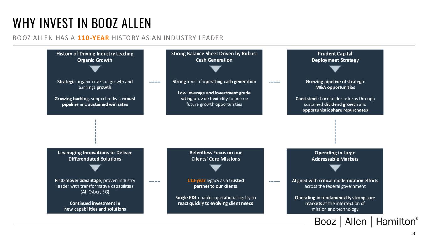 2 COMPANY HISTORY OUR HERITAGE IS AT THE CORE OF EVERYTHING WE DO 20171966 1914 Booz Allen founded in 1914 by Edwin Booz in Chicago With 110 years of industry leadership, Booz Allen is one of the most respected names in government contracting Hired to help U.S. Navy prepare for WWII Spun off commercial consulting business; Carlyle became majority shareholder Acquired Aquilent, Inc., a digital services business Launched Vision 2020 Strategy—transforming the company from a consulting firm to leading solutions provider 1940 2010 2013 2016 2017 Initial Public Offering Acquired Defense Systems Engineering & Support 2008 Carlyle completed ownership exit Acquired Liberty IT Solutions Awarded $1.1B BID contract by the VA Acquired Tracepoint Holdings Launched VoLT– new firmwide growth strategy 2021 Acquired EverWatch Corporation Divested MENA management consulting business and Managed Threat Services (MTS) business Awarded $1.5B eMAPS2 contract—single largest task order in Company’s history 2022 2023 Awarded $1.9B Thunderdome contract 2024 110th Anniversary of Booz Allen’s founding Acquired PAR Government Systems Corporation