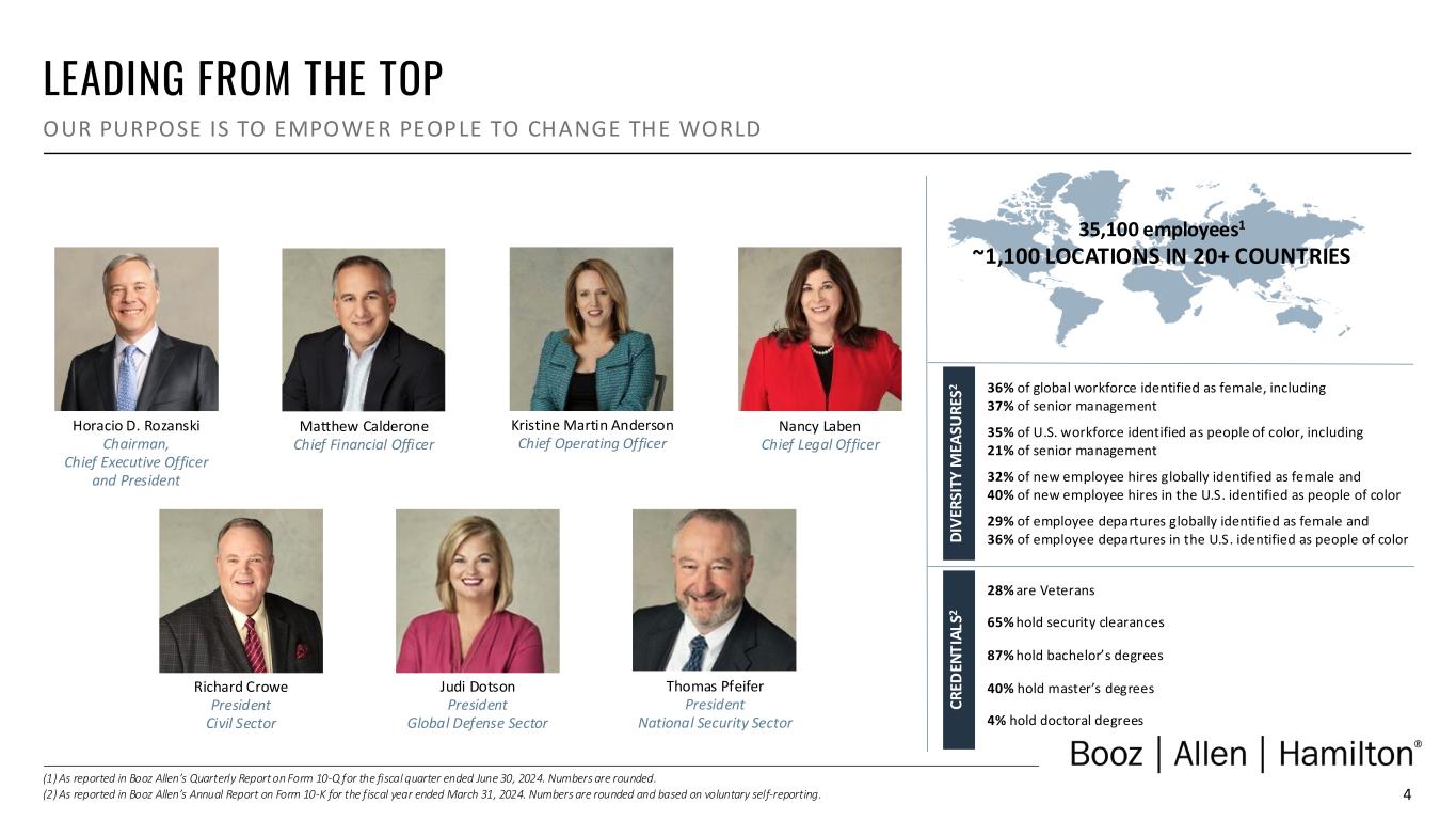 3 WHY INVEST IN BOOZ ALLEN BOOZ ALLEN HAS A 110-YEAR HISTORY AS AN INDUSTRY LEADER History of Driving Industry Leading Organic Growth Strategic organic revenue growth and earnings growth Growing backlog, supported by a robust pipeline and sustained win rates Strong Balance Sheet Driven by Robust Cash Generation Strong level of operating cash generation Low leverage and investment grade rating provide flexibility to pursue future growth opportunities Prudent Capital Deployment Strategy Growing pipeline of strategic M&A opportunities Consistent shareholder returns through sustained dividend growth and opportunistic share repurchases Leveraging Innovations to Deliver Differentiated Solutions First-mover advantage; proven industry leader with transformative capabilities (AI, Cyber, 5G) Continued investment in new capabilities and solutions Relentless Focus on our Clients’ Core Missions 110-year legacy as a trusted partner to our clients Single P&L enables operational agility to react quickly to evolving client needs Operating in Large Addressable Markets Aligned with critical modernization efforts across the federal government Operating in fundamentally strong core markets at the intersection of mission and technology