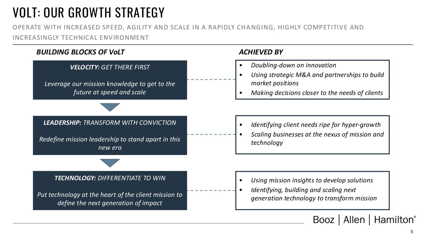 4 LEADING FROM THE TOP OUR PURPOSE IS TO EMPOWER PEOPLE TO CHANGE THE WORLD 35,100 employees1 ~1,100 LOCATIONS IN 20+ COUNTRIES 28% are Veterans 65% hold security clearances 87% hold bachelor’s degrees 40% hold master’s degrees 4% hold doctoral degrees D IV ER SI TY M EA SU R ES 2 C R ED EN T IA LS 2 36% of global workforce identified as female, including 37% of senior management 35% of U.S. workforce identified as people of color, including 21% of senior management 32% of new employee hires globally identified as female and 40% of new employee hires in the U.S. identified as people of color 29% of employee departures globally identified as female and 36% of employee departures in the U.S. identified as people of color Horacio D. Rozanski Chairman, Chief Executive Officer and President Matthew Calderone Chief Financial Officer Kristine Martin Anderson Chief Operating Officer Thomas Pfeifer President National Security Sector Judi Dotson President Global Defense Sector Richard Crowe President Civil Sector Nancy Laben Chief Legal Officer (1) As reported in Booz Allen’s Quarterly Report on Form 10-Q for the fiscal quarter ended June 30, 2024. Numbers are rounded. (2) As reported in Booz Allen’s Annual Report on Form 10-K for the fiscal year ended March 31, 2024. Numbers are rounded and based on voluntary self-reporting.