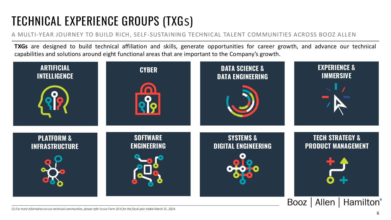 6 ARTIFICIAL INTELLIGENCE CYBER DATA SCIENCE & DATA ENGINEERING EXPERIENCE & IMMERSIVE PLATFORM & INFRASTRUCTURE SOFTWARE ENGINEERING SYSTEMS & DIGITAL ENGINEERING TECH STRATEGY & PRODUCT MANAGEMENT TECHNICAL EXPERIENCE GROUPS (TXGS) A MULTI-YEAR JOURNEY TO BUILD RICH, SELF-SUSTAININ G TECHNICAL TALENT COMMUNITIES ACROSS BOOZ ALLEN (1) For more information on our technical communities, please refer to our Form 10-K for the fiscal year ended March 31, 2024. TXGs are designed to build technical affiliation and skills, generate opportunities for career growth, and advance our technical capabilities and solutions around eight functional areas that are important to the Company’s growth.