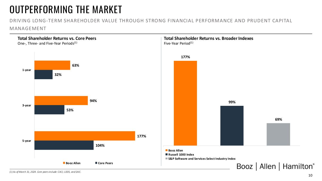 9 CAPITAL DEPLOYMENT: FY24 IN REVIEW OUR DEPLOYMENT PRIORITIES FOLLOW A DISCIPLINED, OPPORTUNISTIC AP PROACH THAT MAXIMIZES NEAR- AND LONG- TERM SHAREHOLDER VALUE We remain committed to a balanced capital allocation strategy to maximize long-term shareholder value In FY24, we deployed ~$692M through a mix of quarterly dividends, strategic investments, and share repurchases (1) As measured over a five-year period. Quarterly Dividends Sustained strong annual dividend growth since 2013 • ~$253M in quarterly dividends • 11th consecutive fiscal year increasing our quarterly dividend • ~42% historical dividend payout ratio(1) Capital Expenditures • Focused investments in IP/IC to help deliver differentiated mission solutions • Ongoing investments to support shifting business needs, including modernizing secured facilities and hybrid work Driving growth through strategic investments in our infrastructure Share Repurchases • ~$415M in share repurchases • Opportunistically look for periods where shares trade below market value; balance with other capital needs Opportunistic share buybacks, based on changing economic conditions and market performance Strategic Transactions Strategic investments to fuel growth • ~$23M in strategic investments in leading- edge technical solutions, like Albedo and Second Front Systems, to accelerate mission delivery