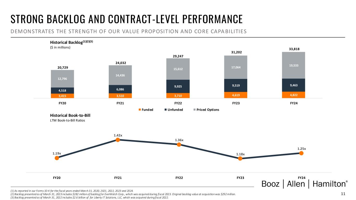 10 177% 99% 69% Category 1Booz Allen Russell 1000 Index S&P Software and Services Select Industry Index 104% 53% 32% 177% 94% 63% 5-year 3-year 1-year Booz Allen Core Peers OUTPERFORMING THE MARKET DRIVIN G LONG-TERM SHAREHOLDER VALUE THROUGH STRONG FINANCIAL PERFORMANCE AND PRUDENT CAPITAL MANAGEMENT Total Shareholder Returns vs. Core Peers One-, Three- and Five-Year Periods(1) Total Shareholder Returns vs. Broader Indexes Five-Year Period(1) (1) As of March 31, 2024. Core peers include: CACI, LDOS, and SAIC.