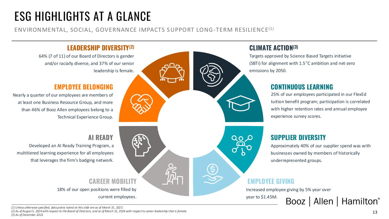 12 FY25 PIPELINE AND DEMAND DYNAMICS EXPANDING PIPELINE FUELS GROWTH MOMENTUM (1) Qualified pipeline and backlog as of June 30, 2024. Does not include the Dept. of Veterans Affairs PTEMS contract, which the Company learned has not been awarded to Booz Allen (and the Company is evaluating its options with respect to that award). (2) Includes awards that were under protest as of June 30, 2024. (3) Rates disclosed in the Company’s Annual Report on Form 10-K for the fiscal year ended March 31, 2024. Consideration Conversion Diverse portfolio with limited concentration risk✓ Strong demand environment aligned to innovation agenda✓ ~63% win rate on new work ~92% on recompetes(3)✓ Record backlog of ~$36B+ ~14% of which is funded(1)✓ Ample demand and strong growth prospects support momentum across the business. QUALIFIED PIPELINE OF $53B+(1)(2) PROPOSALS IN PROCESS OF $8B+ SUBMITTED PROPOSALS OF $15B+(2)