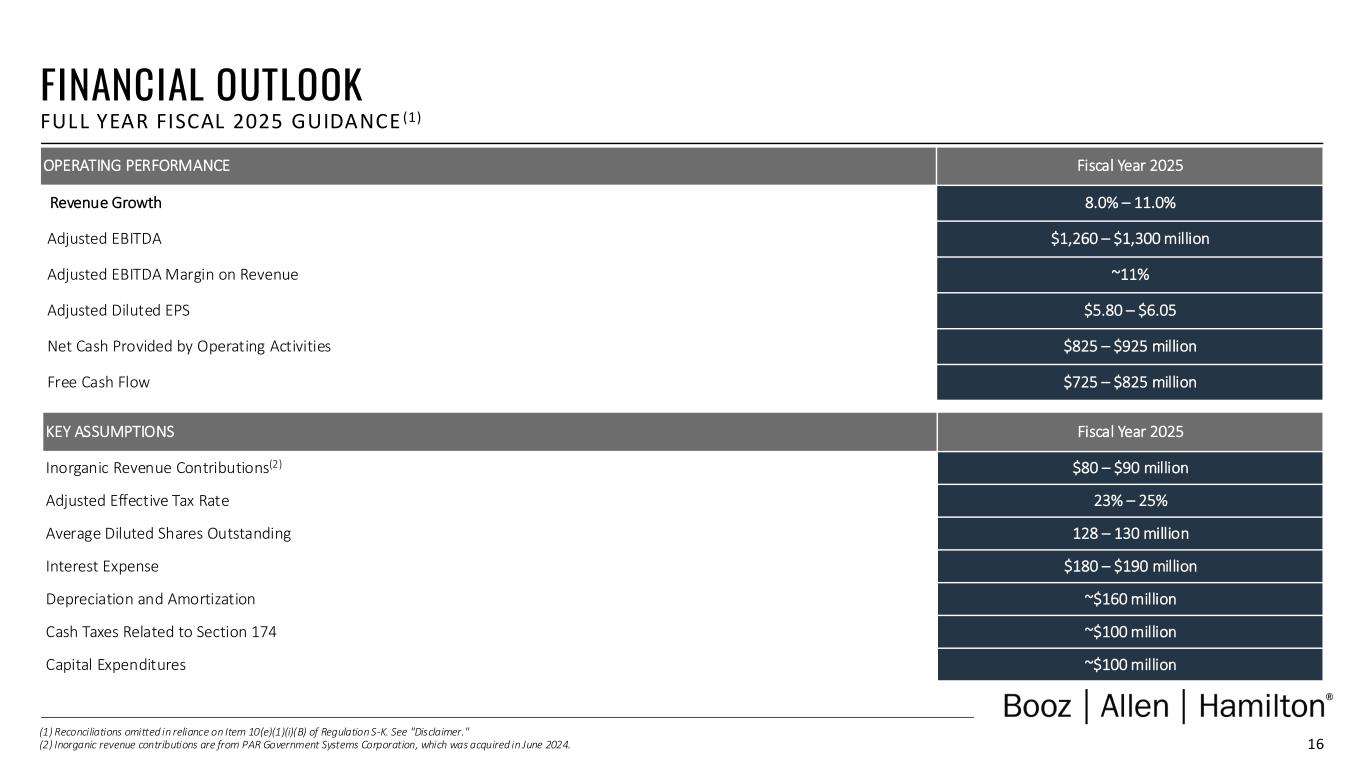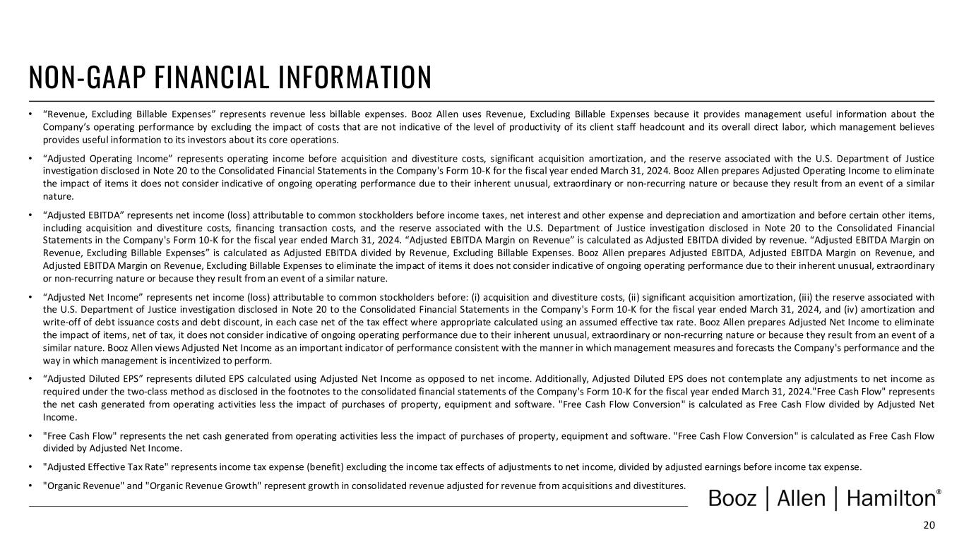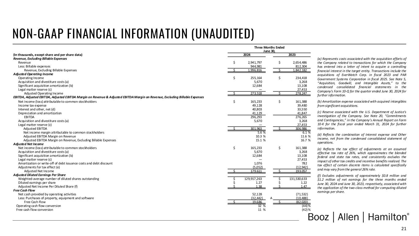 20 NON-GAAP FINANCIAL INFORMATION • “Revenue, Excluding Billable Expenses” represents revenue less billable expenses. Booz Allen uses Revenue, Excluding Billable Expenses because it provides management useful information about the Company’s operating performance by excluding the impact of costs that are not indicative of the level of productivity of its client staff headcount and its overall direct labor, which management believes provides useful information to its investors about its core operations. • “Adjusted Operating Income” represents operating income before acquisition and divestiture costs, significant acquisition amortization, and the reserve associated with the U.S. Department of Justice investigation disclosed in Note 20 to the Consolidated Financial Statements in the Company's Form 10-K for the fiscal year ended March 31, 2024. Booz Allen prepares Adjusted Operating Income to eliminate the impact of items it does not consider indicative of ongoing operating performance due to their inherent unusual, extraordinary or non-recurring nature or because they result from an event of a similar nature. • “Adjusted EBITDA” represents net income (loss) attributable to common stockholders before income taxes, net interest and other expense and depreciation and amortization and before certain other items, including acquisition and divestiture costs, financing transaction costs, and the reserve associated with the U.S. Department of Justice investigation disclosed in Note 20 to the Consolidated Financial Statements in the Company's Form 10-K for the fiscal year ended March 31, 2024. “Adjusted EBITDA Margin on Revenue” is calculated as Adjusted EBITDA divided by revenue. “Adjusted EBITDA Margin on Revenue, Excluding Billable Expenses” is calculated as Adjusted EBITDA divided by Revenue, Excluding Billable Expenses. Booz Allen prepares Adjusted EBITDA, Adjusted EBITDA Margin on Revenue, and Adjusted EBITDA Margin on Revenue, Excluding Billable Expenses to eliminate the impact of items it does not consider indicative of ongoing operating performance due to their inherent unusual, extraordinary or non-recurring nature or because they result from an event of a similar nature. • “Adjusted Net Income” represents net income (loss) attributable to common stockholders before: (i) acquisition and divestiture costs, (ii) significant acquisition amortization, (iii) the reserve associated with the U.S. Department of Justice investigation disclosed in Note 20 to the Consolidated Financial Statements in the Company's Form 10-K for the fiscal year ended March 31, 2024, and (iv) amortization and write-off of debt issuance costs and debt discount, in each case net of the tax effect where appropriate calculated using an assumed effective tax rate. Booz Allen prepares Adjusted Net Income to eliminate the impact of items, net of tax, it does not consider indicative of ongoing operating performance due to their inherent unusual, extraordinary or non-recurring nature or because they result from an event of a similar nature. Booz Allen views Adjusted Net Income as an important indicator of performance consistent with the manner in which management measures and forecasts the Company's performance and the way in which management is incentivized to perform. • “Adjusted Diluted EPS” represents diluted EPS calculated using Adjusted Net Income as opposed to net income. Additionally, Adjusted Diluted EPS does not contemplate any adjustments to net income as required under the two-class method as disclosed in the footnotes to the consolidated financial statements of the Company's Form 10-K for the fiscal year ended March 31, 2024."Free Cash Flow" represents the net cash generated from operating activities less the impact of purchases of property, equipment and software. "Free Cash Flow Conversion" is calculated as Free Cash Flow divided by Adjusted Net Income. • "Free Cash Flow" represents the net cash generated from operating activities less the impact of purchases of property, equipment and software. "Free Cash Flow Conversion" is calculated as Free Cash Flow divided by Adjusted Net Income. • "Adjusted Effective Tax Rate" represents income tax expense (benefit) excluding the income tax effects of adjustments to net income, divided by adjusted earnings before income tax expense. • "Organic Revenue" and "Organic Revenue Growth" represent growth in consolidated revenue adjusted for revenue from acquisitions and divestitures.