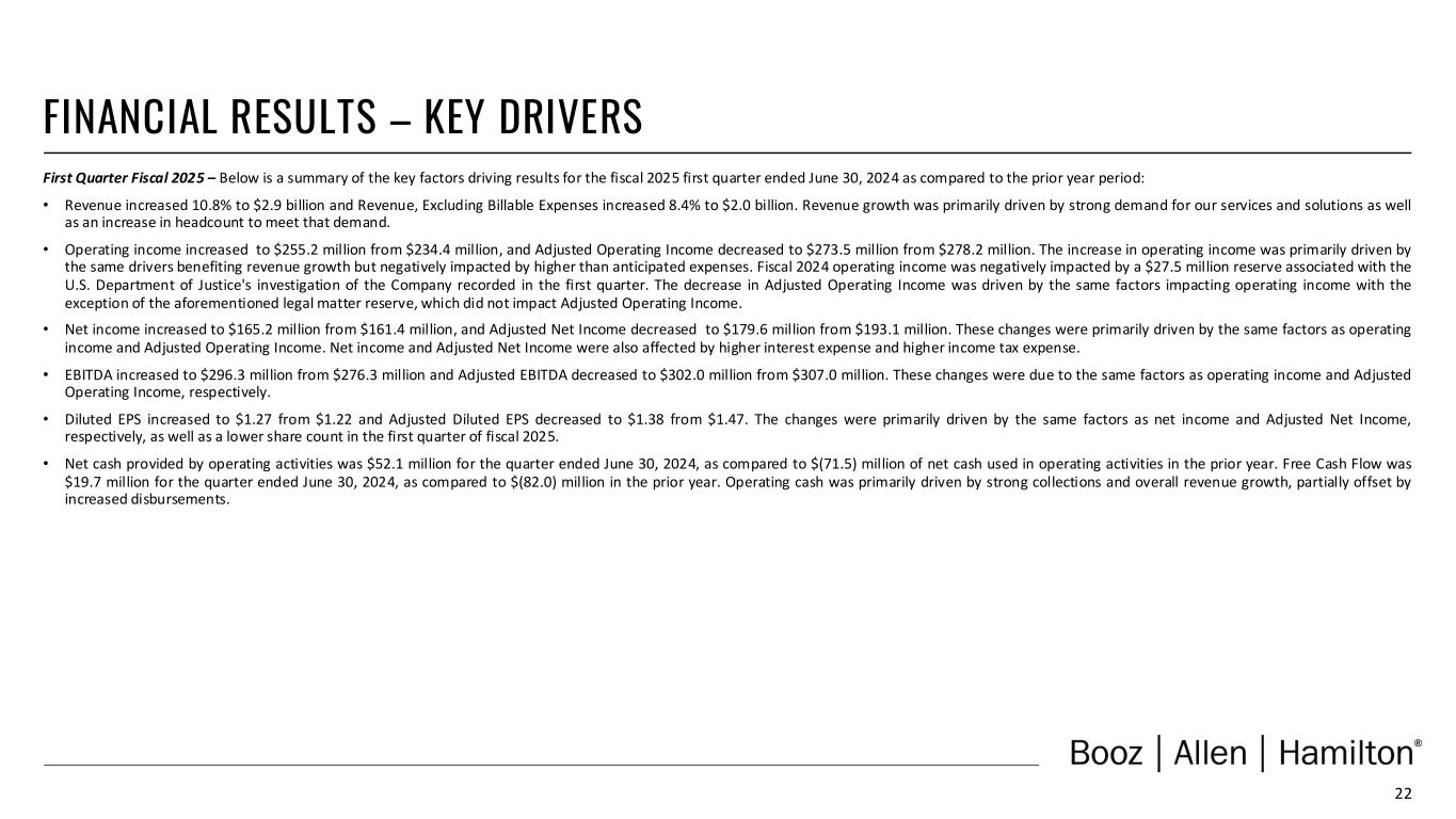 21 NON-GAAP FINANCIAL INFORMATION (UNAUDITED) Three Months Ended June 30, (In thousands, except share and per share data) 2024 2023 Revenue, Excluding Billable Expenses Revenue $ 2,941,797 $ 2,654,486 Less: Billable expenses 944,981 812,304 Revenue, Excluding Billable Expenses $ 1,996,816 $ 1,842,182 Adjusted Operating Income Operating Income $ 255,164 $ 234,418 Acquisition and divestiture costs (a) 5,670 3,268 Significant acquisition amortization (b) 12,684 13,108 Legal matter reserve (c) — 27,453 Adjusted Operating Income $ 273,518 $ 278,247 EBITDA, Adjusted EBITDA, Adjusted EBITDA Margin on Revenue & Adjusted EBITDA Margin on Revenue, Excluding Billable Expenses Net income (loss) attributable to common stockholders $ 165,233 $ 161,388 Income tax expense 49,128 39,480 Interest and other, net (d) 40,803 33,550 Depreciation and amortization 41,129 41,847 EBITDA 296,293 276,265 Acquisition and divestiture costs (a) 5,670 3,268 Legal matter reserve (c) — 27,453 Adjusted EBITDA $ 301,963 $ 306,986 Net income margin attributable to common stockholders 5.6 % 6.1 % Adjusted EBITDA Margin on Revenue 10.3 % 11.6 % Adjusted EBITDA Margin on Revenue, Excluding Billable Expenses 15.1 % 16.7 % Adjusted Net Income Net income (loss) attributable to common stockholders $ 165,233 $ 161,388 Acquisition and divestiture costs (a) 5,670 3,268 Significant acquisition amortization (b) 12,684 13,108 Legal matter reserve (c) — 27,453 Amortization or write-off of debt issuance costs and debt discount 1,076 782 Adjustments for tax effect (e) (5,052) (12,942) Adjusted Net Income $ 179,611 $ 193,057 Adjusted Diluted Earnings Per Share Weighted-average number of diluted shares outstanding $ 129,917,263 $ 131,530,633 Diluted earnings per share $ 1.27 $ 1.22 Adjusted Net Income Per Diluted Share (f) $ 1.38 $ 1.47 Free Cash Flow Net cash provided by operating activities 52,128 (71,532) Less: Purchases of property, equipment and software (32,442) A (10,488) Free Cash Flow $ 19,686 $ (82,020) Operating cash flow conversion 32 % (44) % Free cash flow conversion 11 % (42) % (a) Represents costs associated with the acquisition efforts of the Company related to transactions for which the Company has entered into a letter of intent to acquire a controlling financial interest in the target entity. Transactions include the acquisitions of EverWatch Corp. in fiscal 2023 and PAR Government Systems Corporation in fiscal 2025. See Note 5, “Acquisition, Goodwill, and Intangible Assets,” to the condensed consolidated financial statements in the Company's Form 10-Q for the quarter ended June 30, 2024 for further information. (b) Amortization expense associated with acquired intangibles from significant acquisitions. (c) Reserve associated with the U.S. Department of Justice's investigation of the Company. See Note 20, “Commitments and Contingencies,” in the Company’s Annual Report on Form 10-K for the fiscal year ended March 31, 2024 for further information. (d) Reflects the combination of Interest expense and Other income, net from the condensed consolidated statement of operations. (e) Reflects the tax effect of adjustments at an assumed effective tax rate of 26%, which approximates the blended federal and state tax rates, and consistently excludes the impact of other tax credits and incentive benefits realized. The tax effect of certain discrete items is calculated specifically and may vary from the general 26% rate. (f) Excludes adjustments of approximately $0.8 million and $1.2 million of net earnings for the three months ended June 30, 2024 and June 30, 2023, respectively, associated with the application of the two-class method for computing diluted earnings per share.