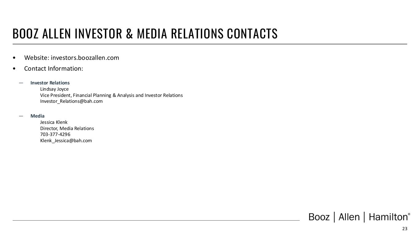 23 • Website: investors.boozallen.com • Contact Information: ― Investor Relations Lindsay Joyce Vice President, Financial Planning & Analysis and Investor Relations Investor_Relations@bah.com ― Media Jessica Klenk Director, Media Relations 703-377-4296 Klenk_Jessica@bah.com BOOZ ALLEN INVESTOR & MEDIA RELATIONS CONTACTS