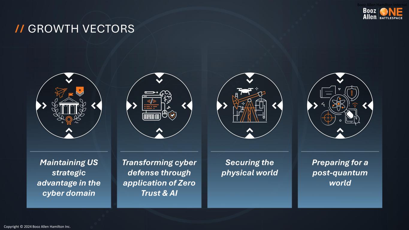 Booz Allen Hamilton Internal // GROWTH VECTORS Securing the physical world Maintaining US strategic advantage in the cyber domain Preparing for a post-quantum world Transforming cyber defense through application of Zero Trust & AI Copyright © 2024 Booz Allen Hamilton Inc.