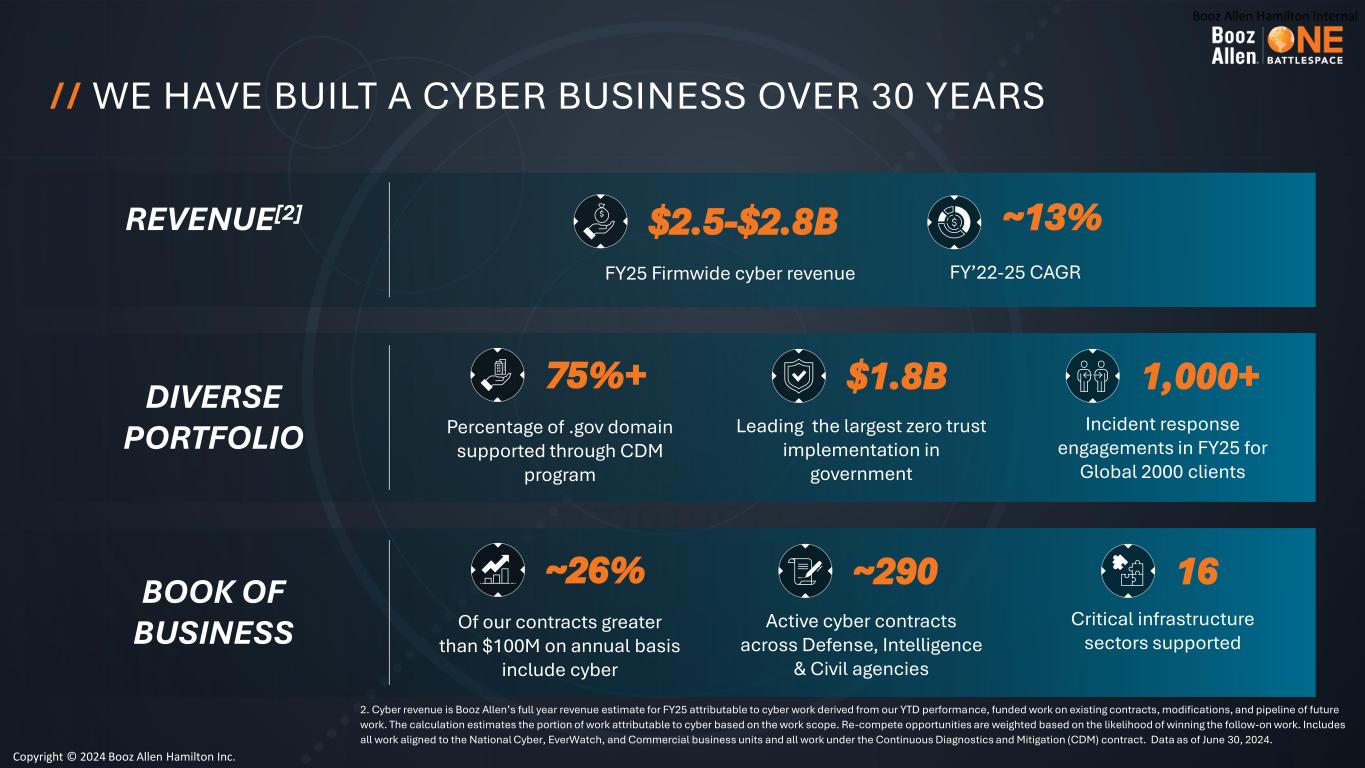 Booz Allen Hamilton Internal // WE HAVE BUILT A CYBER BUSINESS OVER 30 YEARS BOOK OF BUSINESS Of our contracts greater than $100M on annual basis include cyber ~26% Critical infrastructure sectors supported 16 Active cyber contracts across Defense, Intelligence & Civil agencies ~290 DIVERSE PORTFOLIO Percentage of .gov domain supported through CDM program 75%+ Leading the largest zero trust implementation in government $1.8B Incident response engagements in FY25 for Global 2000 clients 1,000+ FY25 Firmwide cyber revenue $2.5-$2.8B FY’22-25 CAGR ~13%REVENUE[2] Copyright © 2024 Booz Allen Hamilton Inc. 2. Cyber revenue is Booz Allen’s full year revenue estimate for FY25 attributable to cyber work derived from our YTD performance, funded work on existing contracts, modifications, and pipeline of future work. The calculation estimates the portion of work attributable to cyber based on the work scope. Re-compete opportunities are weighted based on the likelihood of winning the follow-on work. Includes all work aligned to the National Cyber, EverWatch, and Commercial business units and all work under the Continuous Diagnostics and Mitigation (CDM) contract. Data as of June 30, 2024.