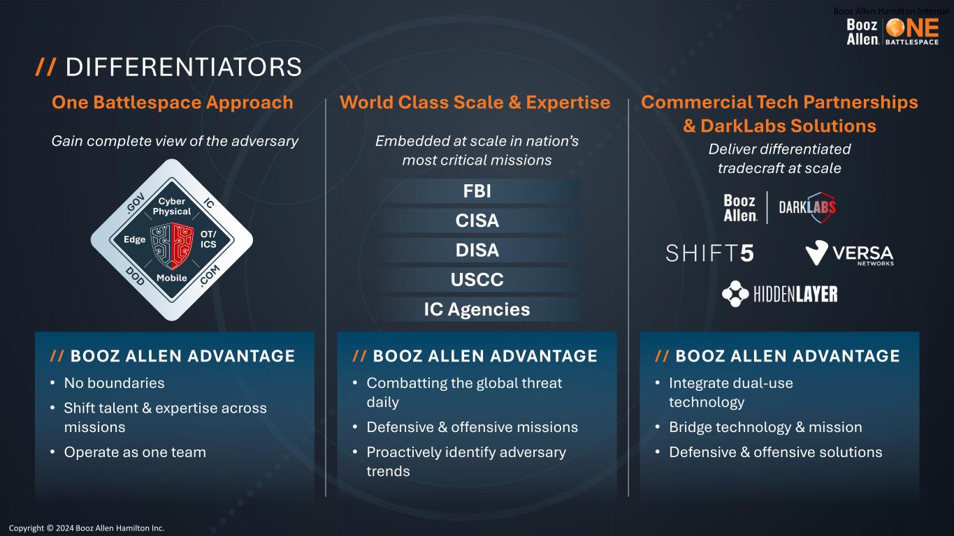 Booz Allen Hamilton Internal World Class Scale & Expertise Embedded at scale in nation’s most critical missions • Combatting the global threat daily • Defensive & offensive missions • Proactively identify adversary trends // BOOZ ALLEN ADVANTAGE One Battlespace Approach Gain complete view of the adversary • No boundaries • Shift talent & expertise across missions • Operate as one team // BOOZ ALLEN ADVANTAGE Mobile Edge OT/ ICS Cyber Physical Commercial Tech Partnerships & DarkLabs Solutions Deliver differentiated tradecraft at scale • Integrate dual-use technology • Bridge technology & mission • Defensive & offensive solutions // BOOZ ALLEN ADVANTAGE // DIFFERENTIATORS USCC IC Agencies FBI CISA DISA Copyright © 2024 Booz Allen Hamilton Inc.