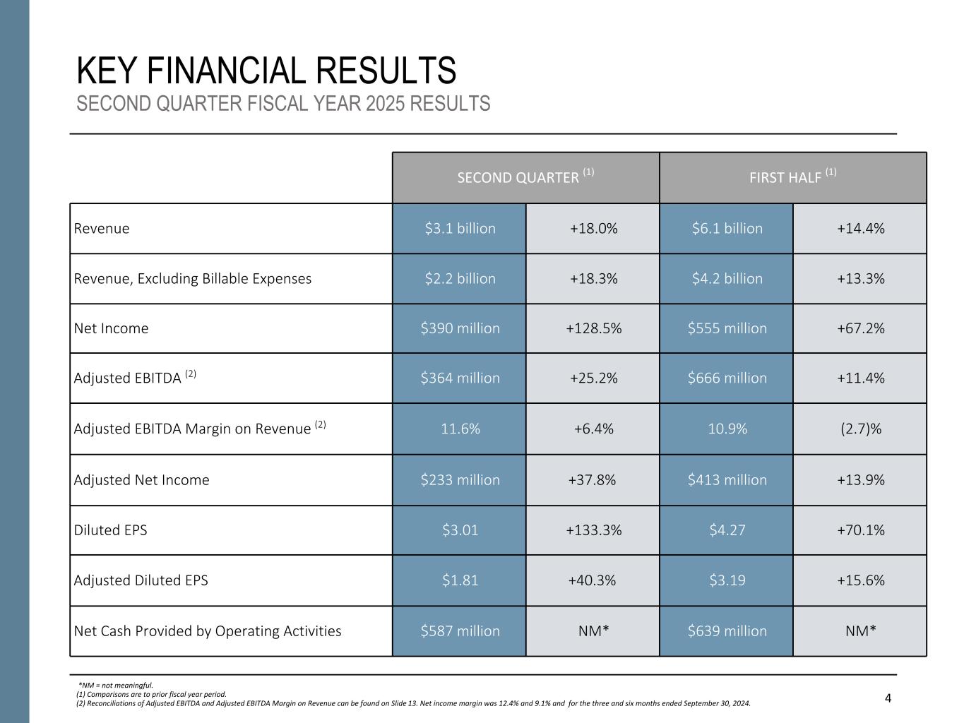 4 KEY FINANCIAL RESULTS SECOND QUARTER FISCAL YEAR 2025 RESULTS *NM = not meaningful. (1) Comparisons are to prior fiscal year period. (2) Reconciliations of Adjusted EBITDA and Adjusted EBITDA Margin on Revenue can be found on Slide 13. Net income margin was 12.4% and 9.1% and for the three and six months ended September 30, 2024. SECOND QUARTER (1) FIRST HALF (1) Revenue $3.1 billion +18.0% $6.1 billion +14.4% Revenue, Excluding Billable Expenses $2.2 billion +18.3% $4.2 billion +13.3% Net Income $390 million +128.5% $555 million +67.2% Adjusted EBITDA (2) $364 million +25.2% $666 million +11.4% Adjusted EBITDA Margin on Revenue (2) 11.6% +6.4% 10.9% (2.7)% Adjusted Net Income $233 million +37.8% $413 million +13.9% Diluted EPS $3.01 +133.3% $4.27 +70.1% Adjusted Diluted EPS $1.81 +40.3% $3.19 +15.6% Net Cash Provided by Operating Activities $587 million NM* $639 million NM*