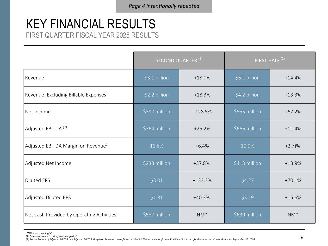6 KEY FINANCIAL RESULTS FIRST QUARTER FISCAL YEAR 2025 RESULTS SECOND QUARTER (1) FIRST HALF (1) Revenue $3.1 billion +18.0% $6.1 billion +14.4% Revenue, Excluding Billable Expenses $2.2 billion +18.3% $4.2 billion +13.3% Net Income $390 million +128.5% $555 million +67.2% Adjusted EBITDA (2) $364 million +25.2% $666 million +11.4% Adjusted EBITDA Margin on Revenue2 11.6% +6.4% 10.9% (2.7)% Adjusted Net Income $233 million +37.8% $413 million +13.9% Diluted EPS $3.01 +133.3% $4.27 +70.1% Adjusted Diluted EPS $1.81 +40.3% $3.19 +15.6% Net Cash Provided by Operating Activities $587 million NM* $639 million NM* Page 4 intentionally repeated *NM = not meaningful. (1) Comparisons are to prior fiscal year period. (2) Reconciliations of Adjusted EBITDA and Adjusted EBITDA Margin on Revenue can be found on Slide 13. Net income margin was 12.4% and 9.1% and for the three and six months ended September 30, 2024.