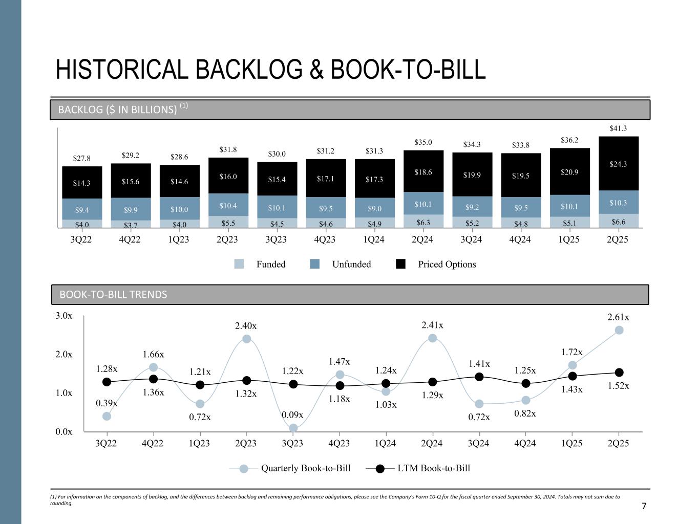 7 $22.0 HISTORICAL BACKLOG & BOOK-TO-BILL (1) For information on the components of backlog, and the differences between backlog and remaining performance obligations, please see the Company's Form 10-Q for the fiscal quarter ended September 30, 2024. Totals may not sum due to rounding. BACKLOG ($ IN BILLIONS) (1) BOOK-TO-BILL TRENDS $27.8 $29.2 $28.6 $31.8 $30.0 $31.2 $31.3 $35.0 $34.3 $33.8 $36.2 $41.3 $4.0 $3.7 $4.0 $5.5 $4.5 $4.6 $4.9 $6.3 $5.2 $4.8 $5.1 $6.6 $9.4 $9.9 $10.0 $10.4 $10.1 $9.5 $9.0 $10.1 $9.2 $9.5 $10.1 $10.3 $14.3 $15.6 $14.6 $16.0 $15.4 $17.1 $17.3 $18.6 $19.9 $19.5 $20.9 $24.3 Funded Unfunded Priced Options 3Q22 4Q22 1Q23 2Q23 3Q23 4Q23 1Q24 2Q24 3Q24 4Q24 1Q25 2Q25 0.39x 1.66x 0.72x 2.40x 0.09x 1.47x 1.03x 2.41x 0.72x 0.82x 1.72x 2.61x 1.28x 1.36x 1.21x 1.32x 1.22x 1.18x 1.24x 1.29x 1.41x 1.25x 1.43x 1.52x Quarterly Book-to-Bill LTM Book-to-Bill 3Q22 4Q22 1Q23 2Q23 3Q23 4Q23 1Q24 2Q24 3Q24 4Q24 1Q25 2Q25 0.0x 1.0x 2.0x 3.0x