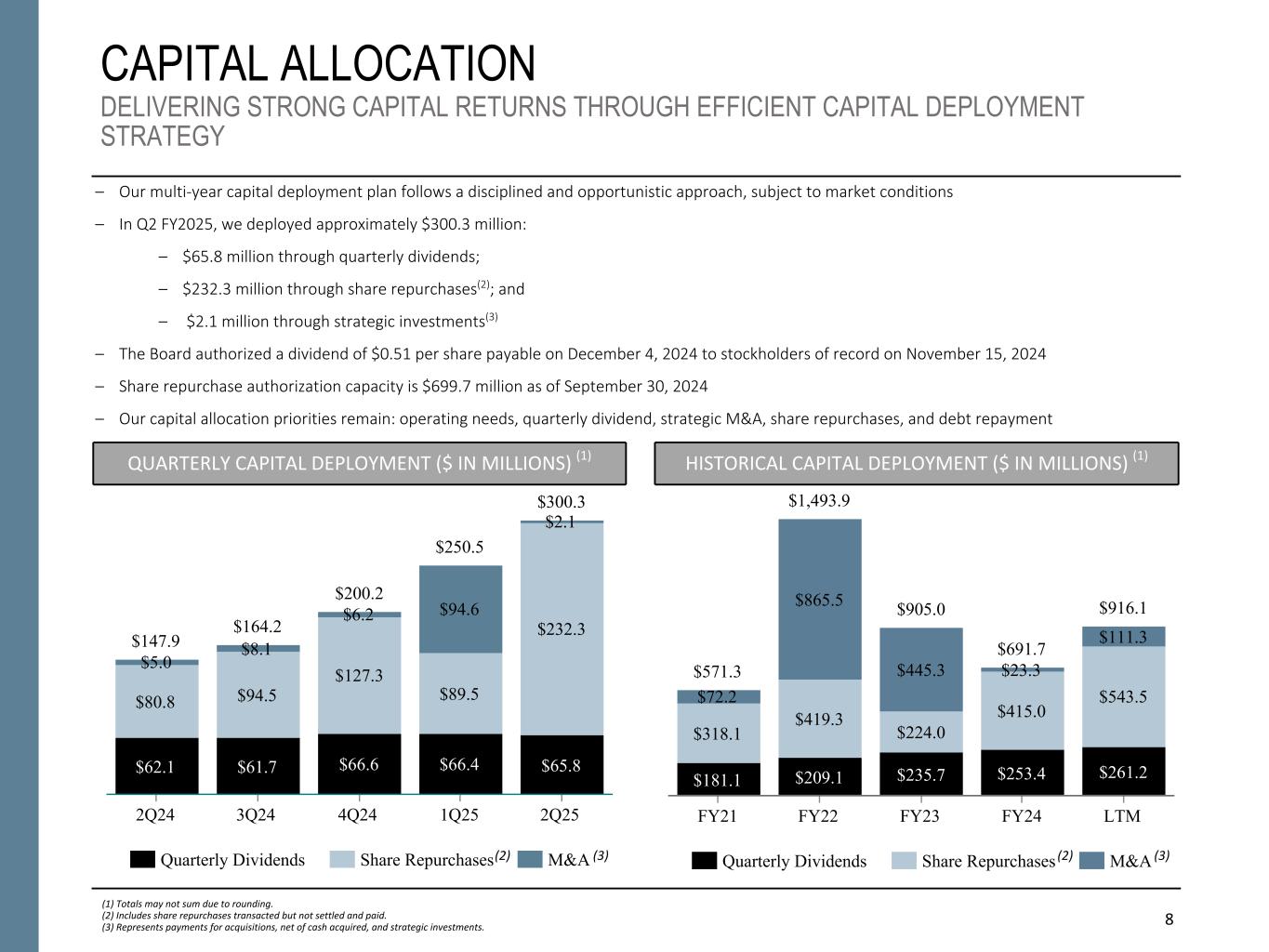 8 CAPITAL ALLOCATION DELIVERING STRONG CAPITAL RETURNS THROUGH EFFICIENT CAPITAL DEPLOYMENT STRATEGY – Our multi-year capital deployment plan follows a disciplined and opportunistic approach, subject to market conditions – In Q2 FY2025, we deployed approximately $300.3 million: – $65.8 million through quarterly dividends; – $232.3 million through share repurchases(2); and – $2.1 million through strategic investments(3) – The Board authorized a dividend of $0.51 per share payable on December 4, 2024 to stockholders of record on November 15, 2024 – Share repurchase authorization capacity is $699.7 million as of September 30, 2024 – Our capital allocation priorities remain: operating needs, quarterly dividend, strategic M&A, share repurchases, and debt repayment HISTORICAL CAPITAL DEPLOYMENT ($ IN MILLIONS) (1)QUARTERLY CAPITAL DEPLOYMENT ($ IN MILLIONS) (1) $147.9 $164.2 $200.2 $250.5 $300.3 $62.1 $61.7 $66.6 $66.4 $65.8 $80.8 $94.5 $127.3 $89.5 $232.3 $5.0 $8.1 $6.2 $94.6 $2.1 Quarterly Dividends Share Repurchases M&A 2Q24 3Q24 4Q24 1Q25 2Q25 $571.3 $1,493.9 $905.0 $691.7 $916.1 $181.1 $209.1 $235.7 $253.4 $261.2 $318.1 $419.3 $224.0 $415.0 $543.5$72.2 $865.5 $445.3 $23.3 $111.3 Quarterly Dividends Share Repurchases M&A FY21 FY22 FY23 FY24 LTM (3) (1) Totals may not sum due to rounding. (2) Includes share repurchases transacted but not settled and paid. (3) Represents payments for acquisitions, net of cash acquired, and strategic investments. (2) (3) (2)