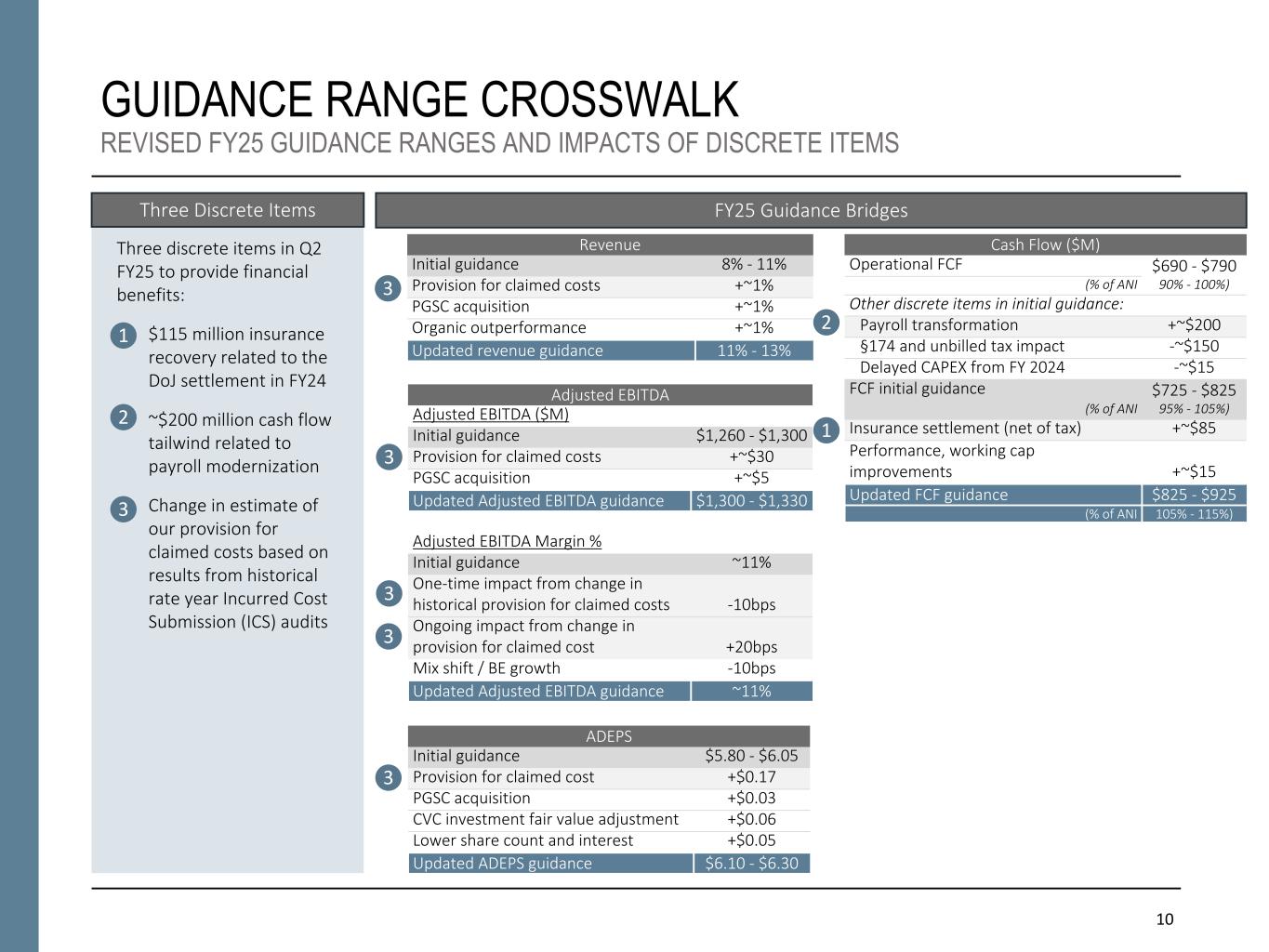 10 Three discrete items in Q2 FY25 to provide financial benefits: 1. $115 million insurance recovery related to the DoJ settlement in FY24 2. ~$200 million cash flow tailwind related to payroll modernization 3. Change in estimate of our provision for claimed costs based on results from historical rate year Incurred Cost Submission (ICS) audits GUIDANCE RANGE CROSSWALK REVISED FY25 GUIDANCE RANGES AND IMPACTS OF DISCRETE ITEMS Three Discrete Items Cash Flow ($M) Operational FCF $690 - $790 (% of ANI 90% - 100%) Other discrete items in initial guidance: Payroll transformation +~$200 §174 and unbilled tax impact -~$150 Delayed CAPEX from FY 2024 -~$15 FCF initial guidance $725 - $825 (% of ANI 95% - 105%) Insurance settlement (net of tax) +~$85 Performance, working cap improvements +~$15 Updated FCF guidance $825 - $925 (% of ANI 105% - 115%)3 Adjusted EBITDA Adjusted EBITDA ($M) Initial guidance $1,260 - $1,300 Provision for claimed costs +~$30 PGSC acquisition +~$5 Updated Adjusted EBITDA guidance $1,300 - $1,330 Adjusted EBITDA Margin % Initial guidance ~11% One-time impact from change in historical provision for claimed costs -10bps Ongoing impact from change in provision for claimed cost +20bps Mix shift / BE growth -10bps Updated Adjusted EBITDA guidance ~11% ADEPS Initial guidance $5.80 - $6.05 Provision for claimed cost +$0.17 PGSC acquisition +$0.03 CVC investment fair value adjustment +$0.06 Lower share count and interest +$0.05 Updated ADEPS guidance $6.10 - $6.30 Revenue Initial guidance 8% - 11% Provision for claimed costs +~1% PGSC acquisition +~1% Organic outperformance +~1% Updated revenue guidance 11% - 13% FY25 Guidance Bridges 1 2 3 3 3 3 3