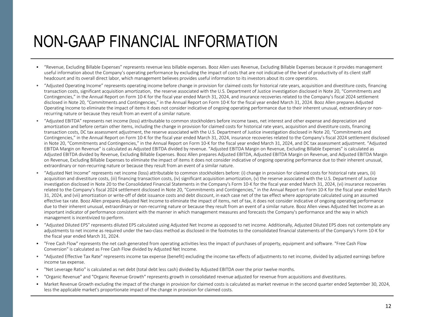 12 NON-GAAP FINANCIAL INFORMATION • “Revenue, Excluding Billable Expenses” represents revenue less billable expenses. Booz Allen uses Revenue, Excluding Billable Expenses because it provides management useful information about the Company’s operating performance by excluding the impact of costs that are not indicative of the level of productivity of its client staff headcount and its overall direct labor, which management believes provides useful information to its investors about its core operations. • “Adjusted Operating Income” represents operating income before change in provision for claimed costs for historical rate years, acquisition and divestiture costs, financing transaction costs, significant acquisition amortization, the reserve associated with the U.S. Department of Justice investigation disclosed in Note 20, “Commitments and Contingencies,” in the Annual Report on Form 10-K for the fiscal year ended March 31, 2024, and insurance recoveries related to the Company’s fiscal 2024 settlement disclosed in Note 20, “Commitments and Contingencies,” in the Annual Report on Form 10-K for the fiscal year ended March 31, 2024. Booz Allen prepares Adjusted Operating Income to eliminate the impact of items it does not consider indicative of ongoing operating performance due to their inherent unusual, extraordinary or non- recurring nature or because they result from an event of a similar nature. • “Adjusted EBITDA” represents net income (loss) attributable to common stockholders before income taxes, net interest and other expense and depreciation and amortization and before certain other items, including the change in provision for claimed costs for historical rate years, acquisition and divestiture costs, financing transaction costs, DC tax assessment adjustment, the reserve associated with the U.S. Department of Justice investigation disclosed in Note 20, “Commitments and Contingencies,” in the Annual Report on Form 10-K for the fiscal year ended March 31, 2024, insurance recoveries related to the Company’s fiscal 2024 settlement disclosed in Note 20, “Commitments and Contingencies,” in the Annual Report on Form 10-K for the fiscal year ended March 31, 2024, and DC tax assessment adjustment. “Adjusted EBITDA Margin on Revenue” is calculated as Adjusted EBITDA divided by revenue. “Adjusted EBITDA Margin on Revenue, Excluding Billable Expenses” is calculated as Adjusted EBITDA divided by Revenue, Excluding Billable Expenses. Booz Allen prepares Adjusted EBITDA, Adjusted EBITDA Margin on Revenue, and Adjusted EBITDA Margin on Revenue, Excluding Billable Expenses to eliminate the impact of items it does not consider indicative of ongoing operating performance due to their inherent unusual, extraordinary or non-recurring nature or because they result from an event of a similar nature. • “Adjusted Net Income” represents net income (loss) attributable to common stockholders before: (i) change in provision for claimed costs for historical rate years, (ii) acquisition and divestiture costs, (iii) financing transaction costs, (iv) significant acquisition amortization, (v) the reserve associated with the U.S. Department of Justice investigation disclosed in Note 20 to the Consolidated Financial Statements in the Company's Form 10-K for the fiscal year ended March 31, 2024, (vi) insurance recoveries related to the Company’s fiscal 2024 settlement disclosed in Note 20, “Commitments and Contingencies,” in the Annual Report on Form 10-K for the fiscal year ended March 31, 2024, and (vii) amortization or write-off of debt issuance costs and debt discount, in each case net of the tax effect where appropriate calculated using an assumed effective tax rate. Booz Allen prepares Adjusted Net Income to eliminate the impact of items, net of tax, it does not consider indicative of ongoing operating performance due to their inherent unusual, extraordinary or non-recurring nature or because they result from an event of a similar nature. Booz Allen views Adjusted Net Income as an important indicator of performance consistent with the manner in which management measures and forecasts the Company's performance and the way in which management is incentivized to perform. • “Adjusted Diluted EPS” represents diluted EPS calculated using Adjusted Net Income as opposed to net income. Additionally, Adjusted Diluted EPS does not contemplate any adjustments to net income as required under the two-class method as disclosed in the footnotes to the consolidated financial statements of the Company's Form 10-K for the fiscal year ended March 31, 2024. • "Free Cash Flow" represents the net cash generated from operating activities less the impact of purchases of property, equipment and software. "Free Cash Flow Conversion" is calculated as Free Cash Flow divided by Adjusted Net Income. • "Adjusted Effective Tax Rate" represents income tax expense (benefit) excluding the income tax effects of adjustments to net income, divided by adjusted earnings before income tax expense. • "Net Leverage Ratio" is calculated as net debt (total debt less cash) divided by Adjusted EBITDA over the prior twelve months. • "Organic Revenue" and "Organic Revenue Growth" represents growth in consolidated revenue adjusted for revenue from acquisitions and divestitures. • Market Revenue Growth excluding the impact of the change in provision for claimed costs is calculated as market revenue in the second quarter ended September 30, 2024, less the applicable market's proportionate impact of the change in provision for claimed costs.
