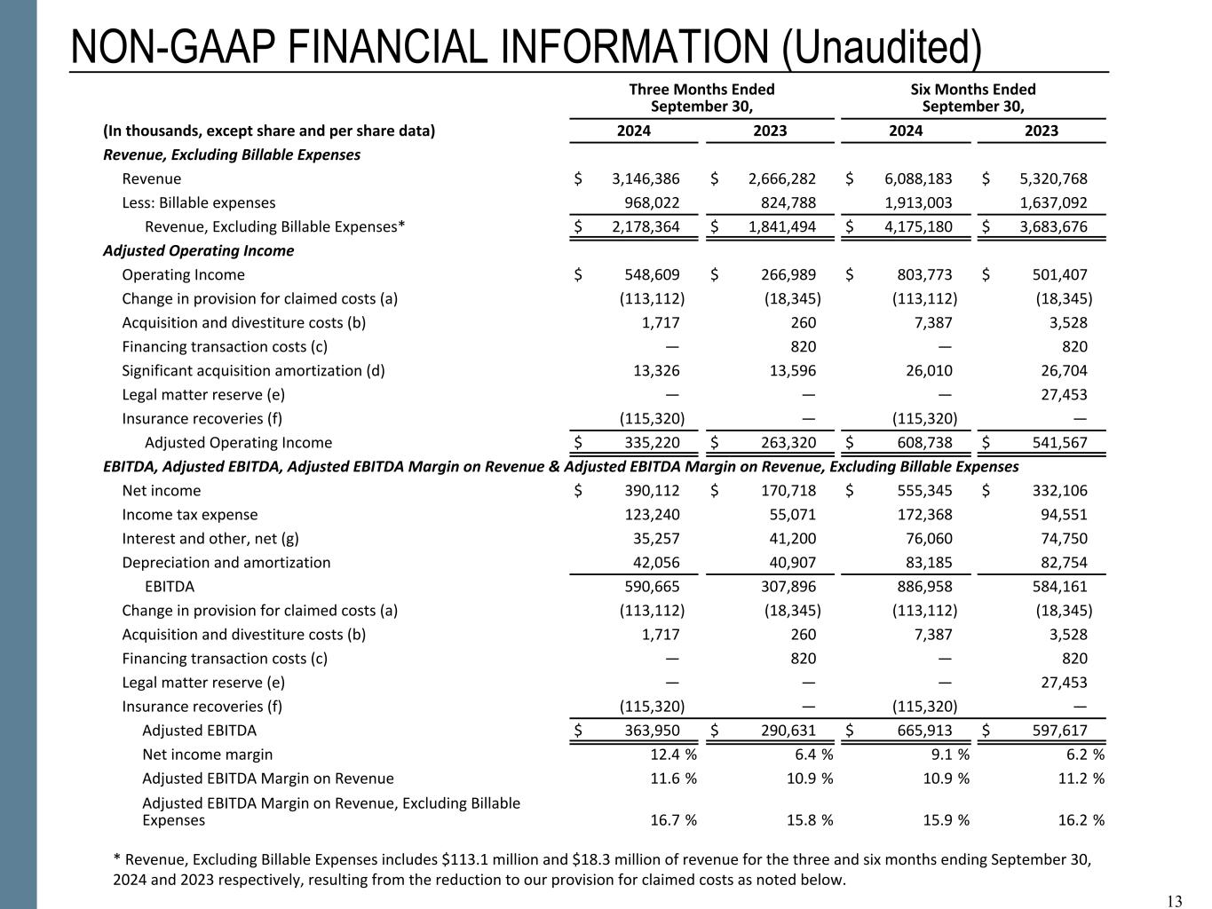 13 NON-GAAP FINANCIAL INFORMATION (Unaudited) Three Months Ended September 30, Six Months Ended September 30, (In thousands, except share and per share data) 2024 2023 2024 2023 Revenue, Excluding Billable Expenses Revenue $ 3,146,386 $ 2,666,282 $ 6,088,183 $ 5,320,768 Less: Billable expenses 968,022 824,788 1,913,003 1,637,092 Revenue, Excluding Billable Expenses* $ 2,178,364 $ 1,841,494 $ 4,175,180 $ 3,683,676 Adjusted Operating Income Operating Income $ 548,609 $ 266,989 $ 803,773 $ 501,407 Change in provision for claimed costs (a) (113,112) (18,345) (113,112) (18,345) Acquisition and divestiture costs (b) 1,717 260 7,387 3,528 Financing transaction costs (c) — 820 — 820 Significant acquisition amortization (d) 13,326 13,596 26,010 26,704 Legal matter reserve (e) — — — 27,453 Insurance recoveries (f) (115,320) — (115,320) — Adjusted Operating Income $ 335,220 $ 263,320 $ 608,738 $ 541,567 EBITDA, Adjusted EBITDA, Adjusted EBITDA Margin on Revenue & Adjusted EBITDA Margin on Revenue, Excluding Billable Expenses Net income $ 390,112 $ 170,718 $ 555,345 $ 332,106 Income tax expense 123,240 55,071 172,368 94,551 Interest and other, net (g) 35,257 41,200 76,060 74,750 Depreciation and amortization 42,056 40,907 83,185 82,754 EBITDA 590,665 307,896 886,958 584,161 Change in provision for claimed costs (a) (113,112) (18,345) (113,112) (18,345) Acquisition and divestiture costs (b) 1,717 260 7,387 3,528 Financing transaction costs (c) — 820 — 820 Legal matter reserve (e) — — — 27,453 Insurance recoveries (f) (115,320) — (115,320) — Adjusted EBITDA $ 363,950 $ 290,631 $ 665,913 $ 597,617 Net income margin 12.4 % 6.4 % 9.1 % 6.2 % Adjusted EBITDA Margin on Revenue 11.6 % 10.9 % 10.9 % 11.2 % Adjusted EBITDA Margin on Revenue, Excluding Billable Expenses 16.7 % 15.8 % 15.9 % 16.2 % 13 * Revenue, Excluding Billable Expenses includes $113.1 million and $18.3 million of revenue for the three and six months ending September 30, 2024 and 2023 respectively, resulting from the reduction to our provision for claimed costs as noted below.
