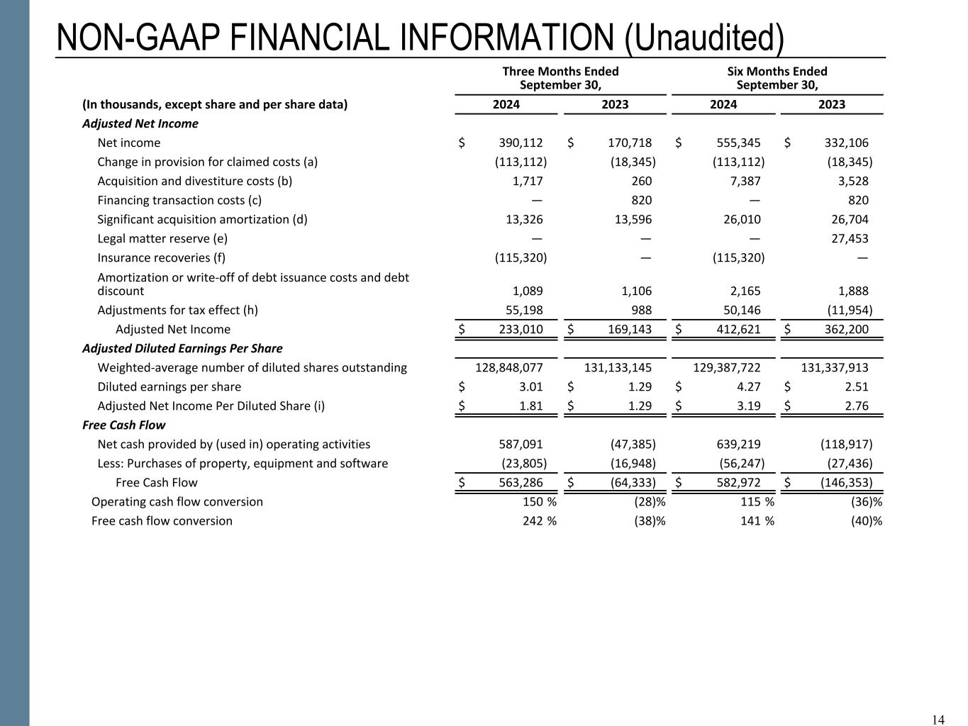 14 NON-GAAP FINANCIAL INFORMATION (Unaudited) Three Months Ended September 30, Six Months Ended September 30, (In thousands, except share and per share data) 2024 2023 2024 2023 Adjusted Net Income Net income $ 390,112 $ 170,718 $ 555,345 $ 332,106 Change in provision for claimed costs (a) (113,112) (18,345) (113,112) (18,345) Acquisition and divestiture costs (b) 1,717 260 7,387 3,528 Financing transaction costs (c) — 820 — 820 Significant acquisition amortization (d) 13,326 13,596 26,010 26,704 Legal matter reserve (e) — — — 27,453 Insurance recoveries (f) (115,320) — (115,320) — Amortization or write-off of debt issuance costs and debt discount 1,089 1,106 2,165 1,888 Adjustments for tax effect (h) 55,198 988 50,146 (11,954) Adjusted Net Income $ 233,010 $ 169,143 $ 412,621 $ 362,200 Adjusted Diluted Earnings Per Share Weighted-average number of diluted shares outstanding 128,848,077 131,133,145 129,387,722 131,337,913 Diluted earnings per share $ 3.01 $ 1.29 $ 4.27 $ 2.51 Adjusted Net Income Per Diluted Share (i) $ 1.81 $ 1.29 $ 3.19 $ 2.76 Free Cash Flow Net cash provided by (used in) operating activities 587,091 (47,385) 639,219 (118,917) Less: Purchases of property, equipment and software (23,805) (16,948) (56,247) (27,436) Free Cash Flow $ 563,286 $ (64,333) $ 582,972 $ (146,353) Operating cash flow conversion 150 % (28) % 115 % (36) % Free cash flow conversion 242 % (38) % 141 % (40) % 14