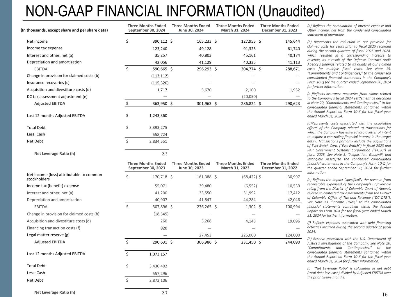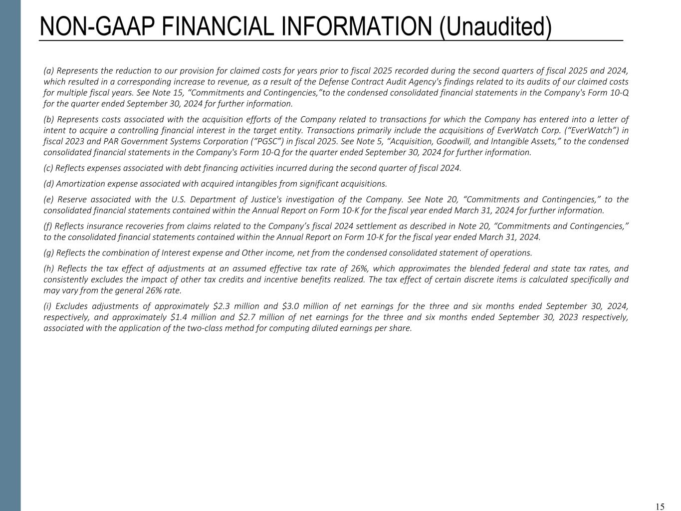 15 NON-GAAP FINANCIAL INFORMATION (Unaudited) 15 (a) Represents the reduction to our provision for claimed costs for years prior to fiscal 2025 recorded during the second quarters of fiscal 2025 and 2024, which resulted in a corresponding increase to revenue, as a result of the Defense Contract Audit Agency's findings related to its audits of our claimed costs for multiple fiscal years. See Note 15, “Commitments and Contingencies,”to the condensed consolidated financial statements in the Company's Form 10-Q for the quarter ended September 30, 2024 for further information. (b) Represents costs associated with the acquisition efforts of the Company related to transactions for which the Company has entered into a letter of intent to acquire a controlling financial interest in the target entity. Transactions primarily include the acquisitions of EverWatch Corp. (“EverWatch”) in fiscal 2023 and PAR Government Systems Corporation (“PGSC”) in fiscal 2025. See Note 5, “Acquisition, Goodwill, and Intangible Assets,” to the condensed consolidated financial statements in the Company's Form 10-Q for the quarter ended September 30, 2024 for further information. (c) Reflects expenses associated with debt financing activities incurred during the second quarter of fiscal 2024. (d) Amortization expense associated with acquired intangibles from significant acquisitions. (e) Reserve associated with the U.S. Department of Justice's investigation of the Company. See Note 20, “Commitments and Contingencies,” to the consolidated financial statements contained within the Annual Report on Form 10-K for the fiscal year ended March 31, 2024 for further information. (f) Reflects insurance recoveries from claims related to the Company’s fiscal 2024 settlement as described in Note 20, “Commitments and Contingencies,” to the consolidated financial statements contained within the Annual Report on Form 10-K for the fiscal year ended March 31, 2024. (g) Reflects the combination of Interest expense and Other income, net from the condensed consolidated statement of operations. (h) Reflects the tax effect of adjustments at an assumed effective tax rate of 26%, which approximates the blended federal and state tax rates, and consistently excludes the impact of other tax credits and incentive benefits realized. The tax effect of certain discrete items is calculated specifically and may vary from the general 26% rate. (i) Excludes adjustments of approximately $2.3 million and $3.0 million of net earnings for the three and six months ended September 30, 2024, respectively, and approximately $1.4 million and $2.7 million of net earnings for the three and six months ended September 30, 2023 respectively, associated with the application of the two-class method for computing diluted earnings per share.