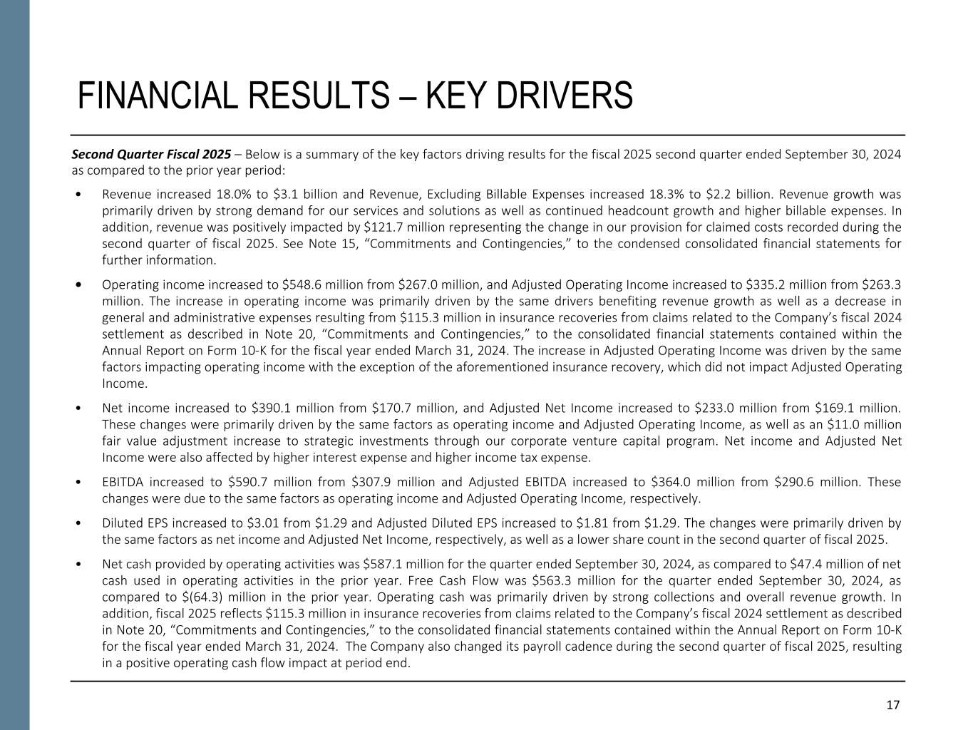 17 FINANCIAL RESULTS – KEY DRIVERS Second Quarter Fiscal 2025 – Below is a summary of the key factors driving results for the fiscal 2025 second quarter ended September 30, 2024 as compared to the prior year period: • Revenue increased 18.0% to $3.1 billion and Revenue, Excluding Billable Expenses increased 18.3% to $2.2 billion. Revenue growth was primarily driven by strong demand for our services and solutions as well as continued headcount growth and higher billable expenses. In addition, revenue was positively impacted by $121.7 million representing the change in our provision for claimed costs recorded during the second quarter of fiscal 2025. See Note 15, “Commitments and Contingencies,” to the condensed consolidated financial statements for further information. • Operating income increased to $548.6 million from $267.0 million, and Adjusted Operating Income increased to $335.2 million from $263.3 million. The increase in operating income was primarily driven by the same drivers benefiting revenue growth as well as a decrease in general and administrative expenses resulting from $115.3 million in insurance recoveries from claims related to the Company’s fiscal 2024 settlement as described in Note 20, “Commitments and Contingencies,” to the consolidated financial statements contained within the Annual Report on Form 10-K for the fiscal year ended March 31, 2024. The increase in Adjusted Operating Income was driven by the same factors impacting operating income with the exception of the aforementioned insurance recovery, which did not impact Adjusted Operating Income. • Net income increased to $390.1 million from $170.7 million, and Adjusted Net Income increased to $233.0 million from $169.1 million. These changes were primarily driven by the same factors as operating income and Adjusted Operating Income, as well as an $11.0 million fair value adjustment increase to strategic investments through our corporate venture capital program. Net income and Adjusted Net Income were also affected by higher interest expense and higher income tax expense. • EBITDA increased to $590.7 million from $307.9 million and Adjusted EBITDA increased to $364.0 million from $290.6 million. These changes were due to the same factors as operating income and Adjusted Operating Income, respectively. • Diluted EPS increased to $3.01 from $1.29 and Adjusted Diluted EPS increased to $1.81 from $1.29. The changes were primarily driven by the same factors as net income and Adjusted Net Income, respectively, as well as a lower share count in the second quarter of fiscal 2025. • Net cash provided by operating activities was $587.1 million for the quarter ended September 30, 2024, as compared to $47.4 million of net cash used in operating activities in the prior year. Free Cash Flow was $563.3 million for the quarter ended September 30, 2024, as compared to $(64.3) million in the prior year. Operating cash was primarily driven by strong collections and overall revenue growth. In addition, fiscal 2025 reflects $115.3 million in insurance recoveries from claims related to the Company’s fiscal 2024 settlement as described in Note 20, “Commitments and Contingencies,” to the consolidated financial statements contained within the Annual Report on Form 10-K for the fiscal year ended March 31, 2024. The Company also changed its payroll cadence during the second quarter of fiscal 2025, resulting in a positive operating cash flow impact at period end.
