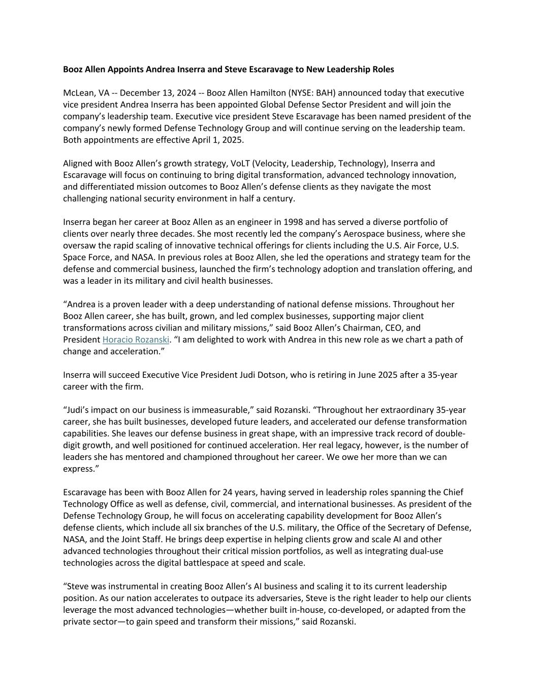 Booz Allen Appoints Andrea Inserra and Steve Escaravage to New Leadership Roles McLean, VA -- December 13, 2024 -- Booz Allen Hamilton (NYSE: BAH) announced today that executive vice president Andrea Inserra has been appointed Global Defense Sector President and will join the company’s leadership team. Executive vice president Steve Escaravage has been named president of the company’s newly formed Defense Technology Group and will continue serving on the leadership team. Both appointments are effective April 1, 2025. Aligned with Booz Allen’s growth strategy, VoLT (Velocity, Leadership, Technology), Inserra and Escaravage will focus on continuing to bring digital transformation, advanced technology innovation, and differentiated mission outcomes to Booz Allen’s defense clients as they navigate the most challenging national security environment in half a century. Inserra began her career at Booz Allen as an engineer in 1998 and has served a diverse portfolio of clients over nearly three decades. She most recently led the company’s Aerospace business, where she oversaw the rapid scaling of innovative technical offerings for clients including the U.S. Air Force, U.S. Space Force, and NASA. In previous roles at Booz Allen, she led the operations and strategy team for the defense and commercial business, launched the firm’s technology adoption and translation offering, and was a leader in its military and civil health businesses. “Andrea is a proven leader with a deep understanding of national defense missions. Throughout her Booz Allen career, she has built, grown, and led complex businesses, supporting major client transformations across civilian and military missions,” said Booz Allen’s Chairman, CEO, and President Horacio Rozanski. “I am delighted to work with Andrea in this new role as we chart a path of change and acceleration.” Inserra will succeed Executive Vice President Judi Dotson, who is retiring in June 2025 after a 35-year career with the firm. “Judi’s impact on our business is immeasurable,” said Rozanski. “Throughout her extraordinary 35-year career, she has built businesses, developed future leaders, and accelerated our defense transformation capabilities. She leaves our defense business in great shape, with an impressive track record of double- digit growth, and well positioned for continued acceleration. Her real legacy, however, is the number of leaders she has mentored and championed throughout her career. We owe her more than we can express.” Escaravage has been with Booz Allen for 24 years, having served in leadership roles spanning the Chief Technology Office as well as defense, civil, commercial, and international businesses. As president of the Defense Technology Group, he will focus on accelerating capability development for Booz Allen’s defense clients, which include all six branches of the U.S. military, the Office of the Secretary of Defense, NASA, and the Joint Staff. He brings deep expertise in helping clients grow and scale AI and other advanced technologies throughout their critical mission portfolios, as well as integrating dual-use technologies across the digital battlespace at speed and scale. “Steve was instrumental in creating Booz Allen’s AI business and scaling it to its current leadership position. As our nation accelerates to outpace its adversaries, Steve is the right leader to help our clients leverage the most advanced technologies—whether built in-house, co-developed, or adapted from the private sector—to gain speed and transform their missions,” said Rozanski.