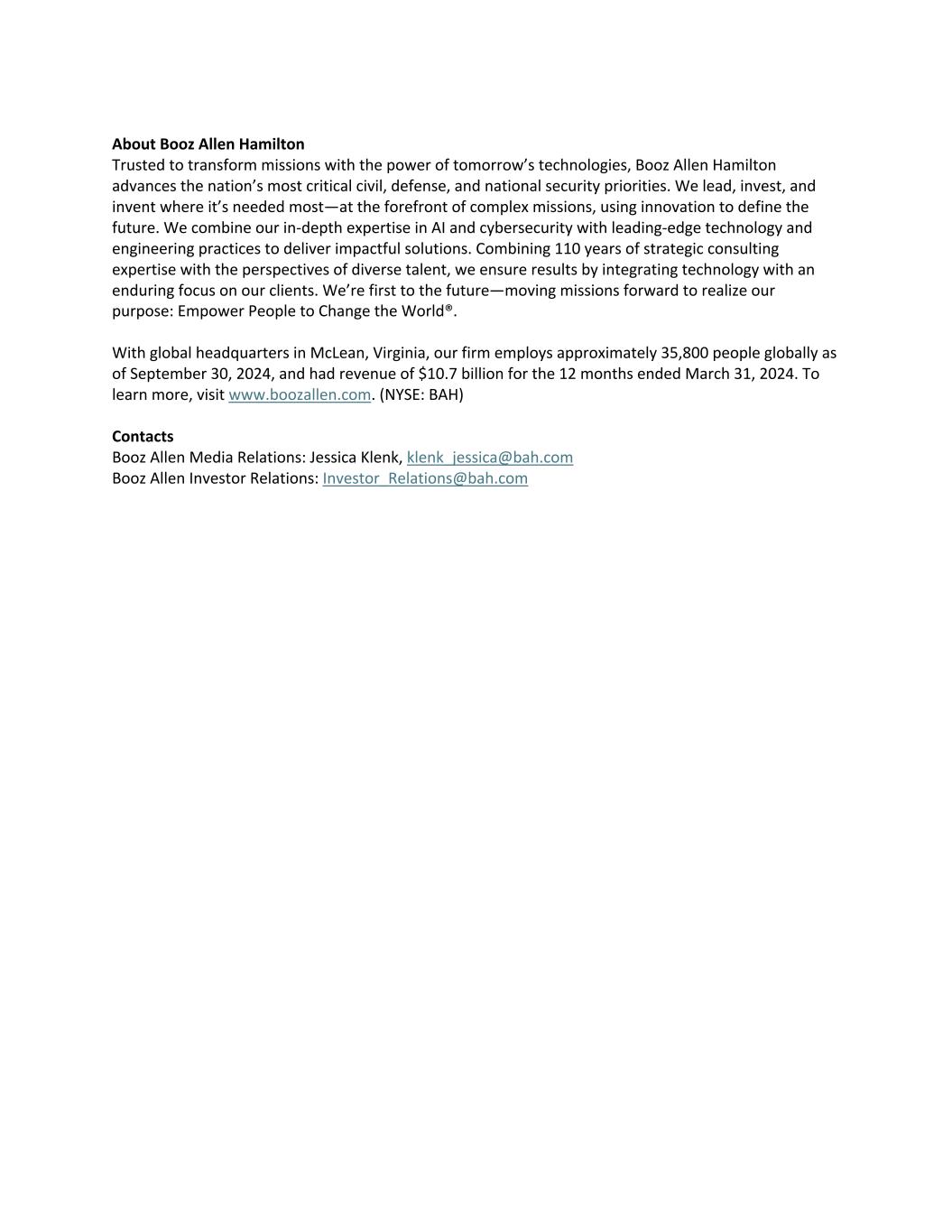 About Booz Allen Hamilton Trusted to transform missions with the power of tomorrow’s technologies, Booz Allen Hamilton advances the nation’s most critical civil, defense, and national security priorities. We lead, invest, and invent where it’s needed most—at the forefront of complex missions, using innovation to define the future. We combine our in-depth expertise in AI and cybersecurity with leading-edge technology and engineering practices to deliver impactful solutions. Combining 110 years of strategic consulting expertise with the perspectives of diverse talent, we ensure results by integrating technology with an enduring focus on our clients. We’re first to the future—moving missions forward to realize our purpose: Empower People to Change the World®. With global headquarters in McLean, Virginia, our firm employs approximately 35,800 people globally as of September 30, 2024, and had revenue of $10.7 billion for the 12 months ended March 31, 2024. To learn more, visit www.boozallen.com. (NYSE: BAH) Contacts Booz Allen Media Relations: Jessica Klenk, klenk_jessica@bah.com Booz Allen Investor Relations: Investor_Relations@bah.com