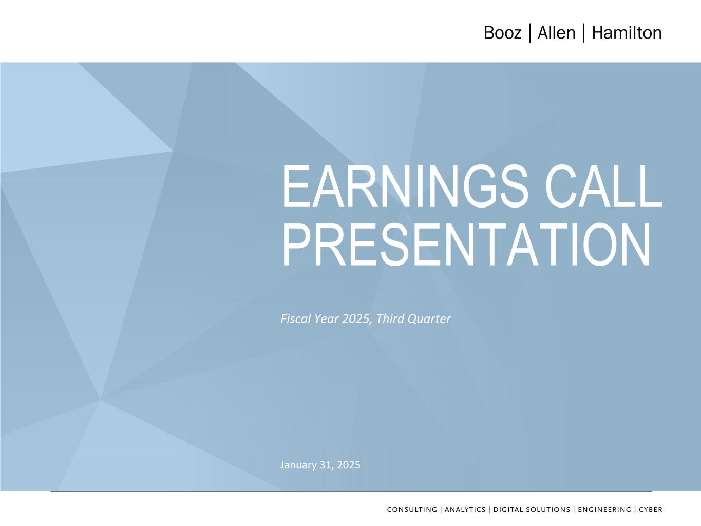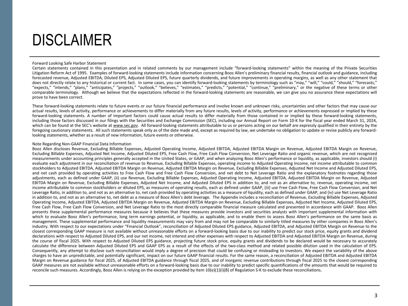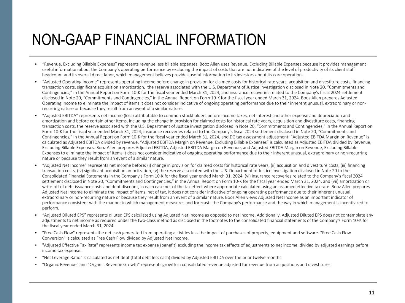 11 NON-GAAP FINANCIAL INFORMATION • “Revenue, Excluding Billable Expenses” represents revenue less billable expenses. Booz Allen uses Revenue, Excluding Billable Expenses because it provides management useful information about the Company’s operating performance by excluding the impact of costs that are not indicative of the level of productivity of its client staff headcount and its overall direct labor, which management believes provides useful information to its investors about its core operations. • “Adjusted Operating Income” represents operating income before change in provision for claimed costs for historical rate years, acquisition and divestiture costs, financing transaction costs, significant acquisition amortization, the reserve associated with the U.S. Department of Justice investigation disclosed in Note 20, “Commitments and Contingencies,” in the Annual Report on Form 10-K for the fiscal year ended March 31, 2024, and insurance recoveries related to the Company’s fiscal 2024 settlement disclosed in Note 20, “Commitments and Contingencies,” in the Annual Report on Form 10-K for the fiscal year ended March 31, 2024. Booz Allen prepares Adjusted Operating Income to eliminate the impact of items it does not consider indicative of ongoing operating performance due to their inherent unusual, extraordinary or non- recurring nature or because they result from an event of a similar nature. • “Adjusted EBITDA” represents net income (loss) attributable to common stockholders before income taxes, net interest and other expense and depreciation and amortization and before certain other items, including the change in provision for claimed costs for historical rate years, acquisition and divestiture costs, financing transaction costs, the reserve associated with the U.S. Department of Justice investigation disclosed in Note 20, “Commitments and Contingencies,” in the Annual Report on Form 10-K for the fiscal year ended March 31, 2024, insurance recoveries related to the Company’s fiscal 2024 settlement disclosed in Note 20, “Commitments and Contingencies,” in the Annual Report on Form 10-K for the fiscal year ended March 31, 2024, and DC tax assessment adjustment. “Adjusted EBITDA Margin on Revenue” is calculated as Adjusted EBITDA divided by revenue. “Adjusted EBITDA Margin on Revenue, Excluding Billable Expenses” is calculated as Adjusted EBITDA divided by Revenue, Excluding Billable Expenses. Booz Allen prepares Adjusted EBITDA, Adjusted EBITDA Margin on Revenue, and Adjusted EBITDA Margin on Revenue, Excluding Billable Expenses to eliminate the impact of items it does not consider indicative of ongoing operating performance due to their inherent unusual, extraordinary or non-recurring nature or because they result from an event of a similar nature. • “Adjusted Net Income” represents net income before: (i) change in provision for claimed costs for historical rate years, (ii) acquisition and divestiture costs, (iii) financing transaction costs, (iv) significant acquisition amortization, (v) the reserve associated with the U.S. Department of Justice investigation disclosed in Note 20 to the Consolidated Financial Statements in the Company's Form 10-K for the fiscal year ended March 31, 2024, (vi) insurance recoveries related to the Company’s fiscal 2024 settlement disclosed in Note 20, “Commitments and Contingencies,” in the Annual Report on Form 10-K for the fiscal year ended March 31, 2024, and (vii) amortization or write-off of debt issuance costs and debt discount, in each case net of the tax effect where appropriate calculated using an assumed effective tax rate. Booz Allen prepares Adjusted Net Income to eliminate the impact of items, net of tax, it does not consider indicative of ongoing operating performance due to their inherent unusual, extraordinary or non-recurring nature or because they result from an event of a similar nature. Booz Allen views Adjusted Net Income as an important indicator of performance consistent with the manner in which management measures and forecasts the Company's performance and the way in which management is incentivized to perform. • “Adjusted Diluted EPS” represents diluted EPS calculated using Adjusted Net Income as opposed to net income. Additionally, Adjusted Diluted EPS does not contemplate any adjustments to net income as required under the two-class method as disclosed in the footnotes to the consolidated financial statements of the Company's Form 10-K for the fiscal year ended March 31, 2024. • "Free Cash Flow" represents the net cash generated from operating activities less the impact of purchases of property, equipment and software. "Free Cash Flow Conversion" is calculated as Free Cash Flow divided by Adjusted Net Income. • "Adjusted Effective Tax Rate" represents income tax expense (benefit) excluding the income tax effects of adjustments to net income, divided by adjusted earnings before income tax expense. • "Net Leverage Ratio" is calculated as net debt (total debt less cash) divided by Adjusted EBITDA over the prior twelve months. • "Organic Revenue" and "Organic Revenue Growth" represents growth in consolidated revenue adjusted for revenue from acquisitions and divestitures.