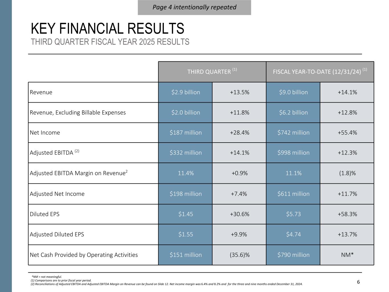 6 KEY FINANCIAL RESULTS THIRD QUARTER FISCAL YEAR 2025 RESULTS THIRD QUARTER (1) FISCAL YEAR-TO-DATE (12/31/24) (1) Revenue $2.9 billion +13.5% $9.0 billion +14.1% Revenue, Excluding Billable Expenses $2.0 billion +11.8% $6.2 billion +12.8% Net Income $187 million +28.4% $742 million +55.4% Adjusted EBITDA (2) $332 million +14.1% $998 million +12.3% Adjusted EBITDA Margin on Revenue2 11.4% +0.9% 11.1% (1.8)% Adjusted Net Income $198 million +7.4% $611 million +11.7% Diluted EPS $1.45 +30.6% $5.73 +58.3% Adjusted Diluted EPS $1.55 +9.9% $4.74 +13.7% Net Cash Provided by Operating Activities $151 million (35.6)% $790 million NM* Page 4 intentionally repeated *NM = not meaningful. (1) Comparisons are to prior fiscal year period. (2) Reconciliations of Adjusted EBITDA and Adjusted EBITDA Margin on Revenue can be found on Slide 12. Net income margin was 6.4% and 8.2% and for the three and nine months ended December 31, 2024.