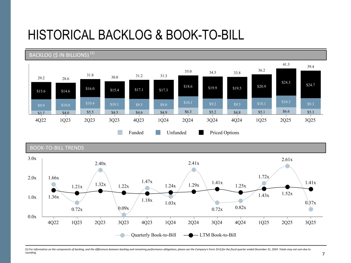 7 $22.0 HISTORICAL BACKLOG & BOOK-TO-BILL (1) For information on the components of backlog, and the differences between backlog and remaining performance obligations, please see the Company's Form 10-Q for the fiscal quarter ended December 31, 2024. Totals may not sum due to rounding. BACKLOG ($ IN BILLIONS) (1) BOOK-TO-BILL TRENDS 29.2 28.6 31.8 30.0 31.2 31.3 35.0 34.3 33.8 36.2 41.3 39.4 $3.7 $4.0 $5.5 $4.5 $4.6 $4.9 $6.3 $5.2 $4.8 $5.1 $6.6 $5.3 $9.9 $10.0 $10.4 $10.1 $9.5 $9.0 $10.1 $9.2 $9.5 $10.1 $10.3 $9.3 $15.6 $14.6 $16.0 $15.4 $17.1 $17.3 $18.6 $19.9 $19.5 $20.9 $24.3 $24.7 Funded Unfunded Priced Options 4Q22 1Q23 2Q23 3Q23 4Q23 1Q24 2Q24 3Q24 4Q24 1Q25 2Q25 3Q25 1.66x 0.72x 2.40x 0.09x 1.47x 1.03x 2.41x 0.72x 0.82x 1.72x 2.61x 0.37x 1.36x 1.21x 1.32x 1.22x 1.18x 1.24x 1.29x 1.41x 1.25x 1.43x 1.52x 1.41x Quarterly Book-to-Bill LTM Book-to-Bill 4Q22 1Q23 2Q23 3Q23 4Q23 1Q24 2Q24 3Q24 4Q24 1Q25 2Q25 3Q25 0.0x 1.0x 2.0x 3.0x