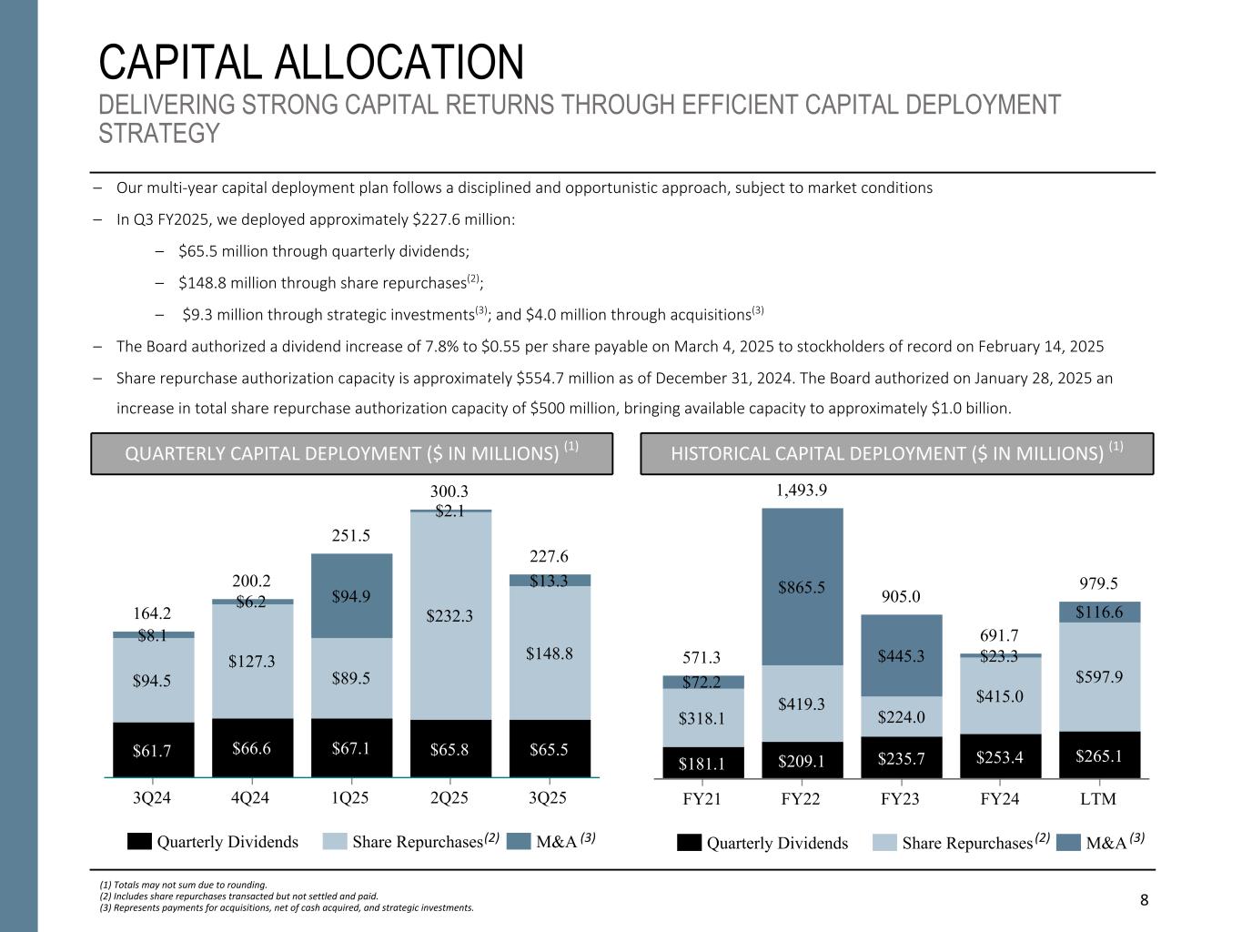 8 CAPITAL ALLOCATION DELIVERING STRONG CAPITAL RETURNS THROUGH EFFICIENT CAPITAL DEPLOYMENT STRATEGY – Our multi-year capital deployment plan follows a disciplined and opportunistic approach, subject to market conditions – In Q3 FY2025, we deployed approximately $227.6 million: – $65.5 million through quarterly dividends; – $148.8 million through share repurchases(2); – $9.3 million through strategic investments(3); and $4.0 million through acquisitions(3) – The Board authorized a dividend increase of 7.8% to $0.55 per share payable on March 4, 2025 to stockholders of record on February 14, 2025 – Share repurchase authorization capacity is approximately $554.7 million as of December 31, 2024. The Board authorized on January 28, 2025 an increase in total share repurchase authorization capacity of $500 million, bringing available capacity to approximately $1.0 billion. HISTORICAL CAPITAL DEPLOYMENT ($ IN MILLIONS) (1)QUARTERLY CAPITAL DEPLOYMENT ($ IN MILLIONS) (1) 164.2 200.2 251.5 300.3 227.6 $61.7 $66.6 $67.1 $65.8 $65.5 $94.5 $127.3 $89.5 $232.3 $148.8 $8.1 $6.2 $94.9 $2.1 $13.3 Quarterly Dividends Share Repurchases M&A 3Q24 4Q24 1Q25 2Q25 3Q25 571.3 1,493.9 905.0 691.7 979.5 $181.1 $209.1 $235.7 $253.4 $265.1 $318.1 $419.3 $224.0 $415.0 $597.9$72.2 $865.5 $445.3 $23.3 $116.6 Quarterly Dividends Share Repurchases M&A FY21 FY22 FY23 FY24 LTM (3) (1) Totals may not sum due to rounding. (2) Includes share repurchases transacted but not settled and paid. (3) Represents payments for acquisitions, net of cash acquired, and strategic investments. (2) (3) (2)
