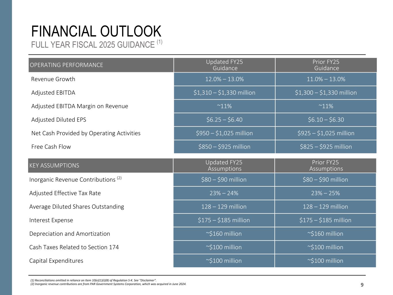 9 FINANCIAL OUTLOOK FULL YEAR FISCAL 2025 GUIDANCE (1) OPERATING PERFORMANCE Updated FY25 Guidance Prior FY25 Guidance Revenue Growth 12.0% – 13.0% 11.0% – 13.0% Adjusted EBITDA $1,310 – $1,330 million $1,300 – $1,330 million Adjusted EBITDA Margin on Revenue ~11% ~11% Adjusted Diluted EPS $6.25 – $6.40 $6.10 – $6.30 Net Cash Provided by Operating Activities $950 – $1,025 million $925 – $1,025 million Free Cash Flow $850 – $925 million $825 – $925 million (1) Reconciliations omitted in reliance on Item 10(e)(1)(i)(B) of Regulation S-K. See "Disclaimer". (2) Inorganic revenue contributions are from PAR Government Systems Corporation, which was acquired in June 2024. KEY ASSUMPTIONS Updated FY25 Assumptions Prior FY25 Assumptions Inorganic Revenue Contributions (2) $80 – $90 million $80 – $90 million Adjusted Effective Tax Rate 23% – 24% 23% – 25% Average Diluted Shares Outstanding 128 – 129 million 128 – 129 million Interest Expense $175 – $185 million $175 – $185 million Depreciation and Amortization ~$160 million ~$160 million Cash Taxes Related to Section 174 ~$100 million ~$100 million Capital Expenditures ~$100 million ~$100 million