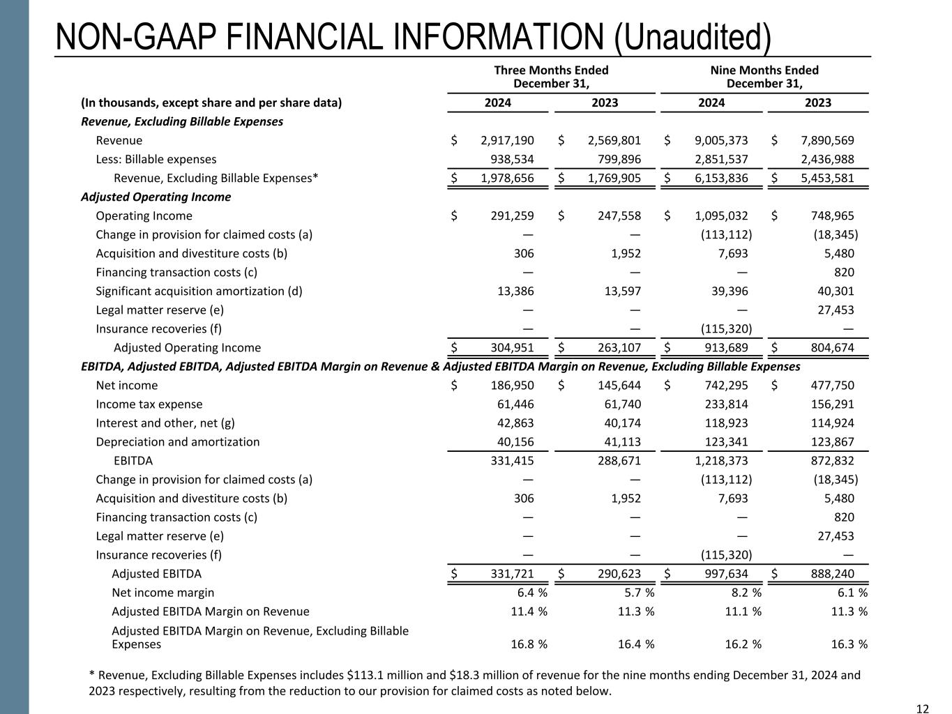 12 NON-GAAP FINANCIAL INFORMATION (Unaudited) Three Months Ended December 31, Nine Months Ended December 31, (In thousands, except share and per share data) 2024 2023 2024 2023 Revenue, Excluding Billable Expenses Revenue $ 2,917,190 $ 2,569,801 $ 9,005,373 $ 7,890,569 Less: Billable expenses 938,534 799,896 2,851,537 2,436,988 Revenue, Excluding Billable Expenses* $ 1,978,656 $ 1,769,905 $ 6,153,836 $ 5,453,581 Adjusted Operating Income Operating Income $ 291,259 $ 247,558 $ 1,095,032 $ 748,965 Change in provision for claimed costs (a) — — (113,112) (18,345) Acquisition and divestiture costs (b) 306 1,952 7,693 5,480 Financing transaction costs (c) — — — 820 Significant acquisition amortization (d) 13,386 13,597 39,396 40,301 Legal matter reserve (e) — — — 27,453 Insurance recoveries (f) — — (115,320) — Adjusted Operating Income $ 304,951 $ 263,107 $ 913,689 $ 804,674 EBITDA, Adjusted EBITDA, Adjusted EBITDA Margin on Revenue & Adjusted EBITDA Margin on Revenue, Excluding Billable Expenses Net income $ 186,950 $ 145,644 $ 742,295 $ 477,750 Income tax expense 61,446 61,740 233,814 156,291 Interest and other, net (g) 42,863 40,174 118,923 114,924 Depreciation and amortization 40,156 41,113 123,341 123,867 EBITDA 331,415 288,671 1,218,373 872,832 Change in provision for claimed costs (a) — — (113,112) (18,345) Acquisition and divestiture costs (b) 306 1,952 7,693 5,480 Financing transaction costs (c) — — — 820 Legal matter reserve (e) — — — 27,453 Insurance recoveries (f) — — (115,320) — Adjusted EBITDA $ 331,721 $ 290,623 $ 997,634 $ 888,240 Net income margin 6.4 % 5.7 % 8.2 % 6.1 % Adjusted EBITDA Margin on Revenue 11.4 % 11.3 % 11.1 % 11.3 % Adjusted EBITDA Margin on Revenue, Excluding Billable Expenses 16.8 % 16.4 % 16.2 % 16.3 % 12 * Revenue, Excluding Billable Expenses includes $113.1 million and $18.3 million of revenue for the nine months ending December 31, 2024 and 2023 respectively, resulting from the reduction to our provision for claimed costs as noted below.